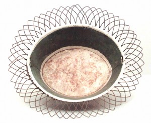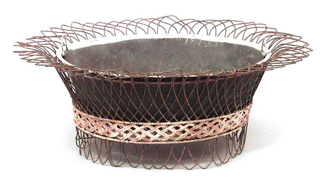 3 Outdoor (20th Century) oval tole metal basket-form cachepots with filigree base and edge with green painted liner (PRICED EACH)