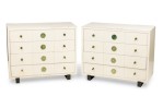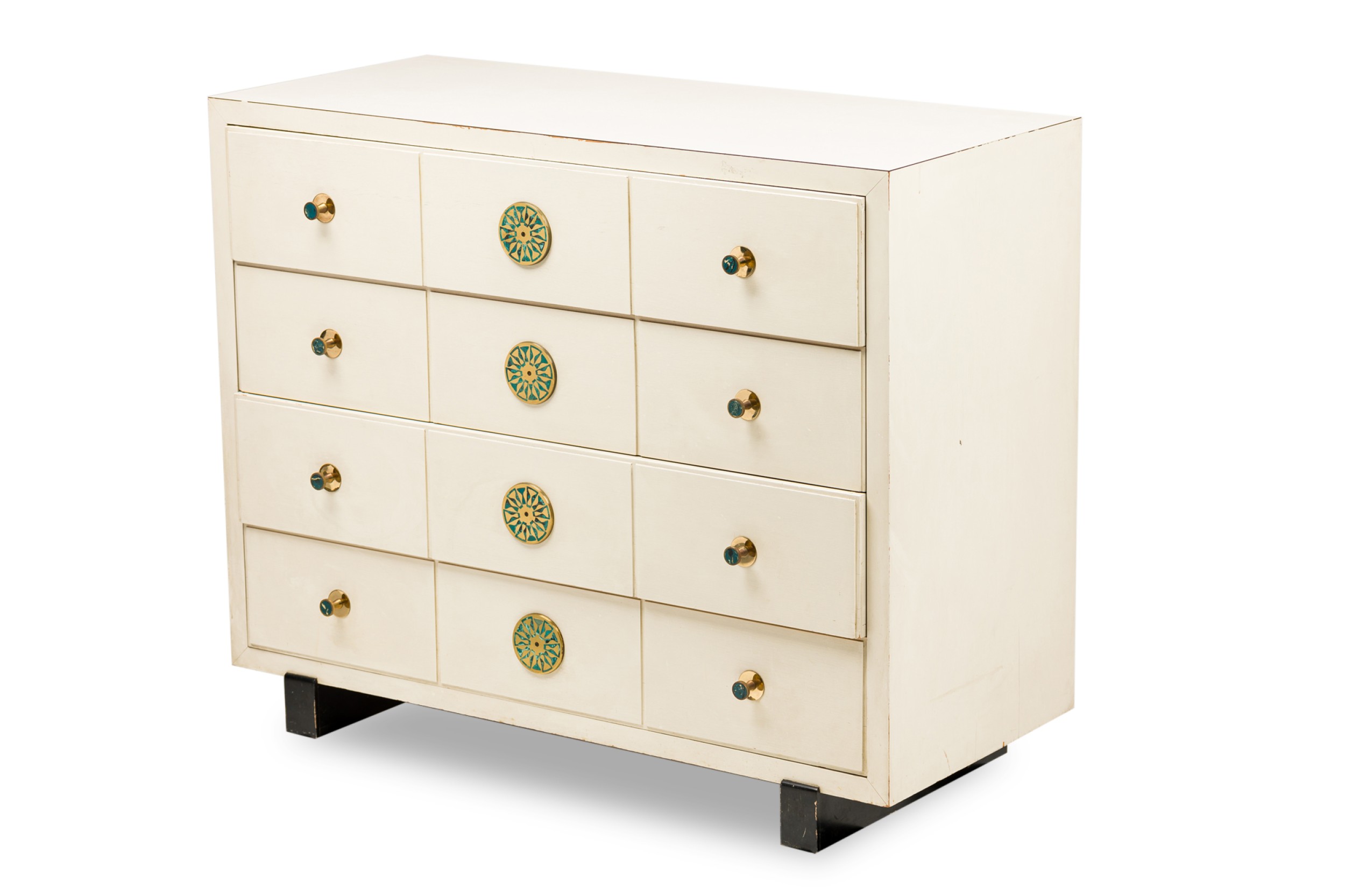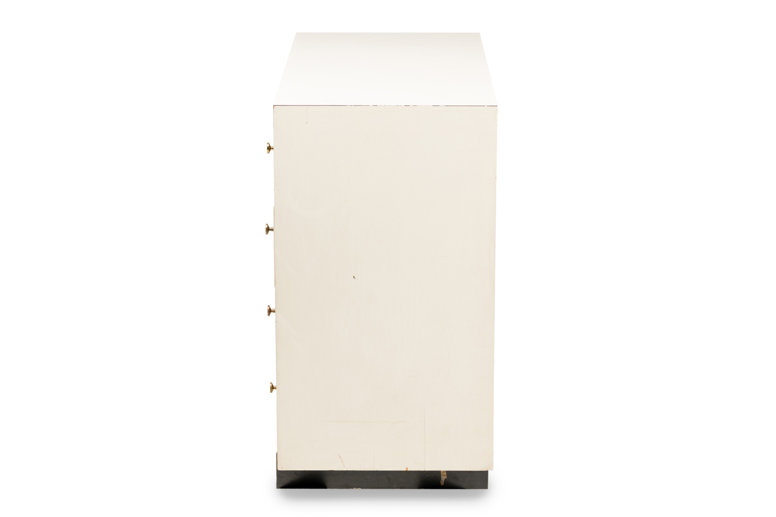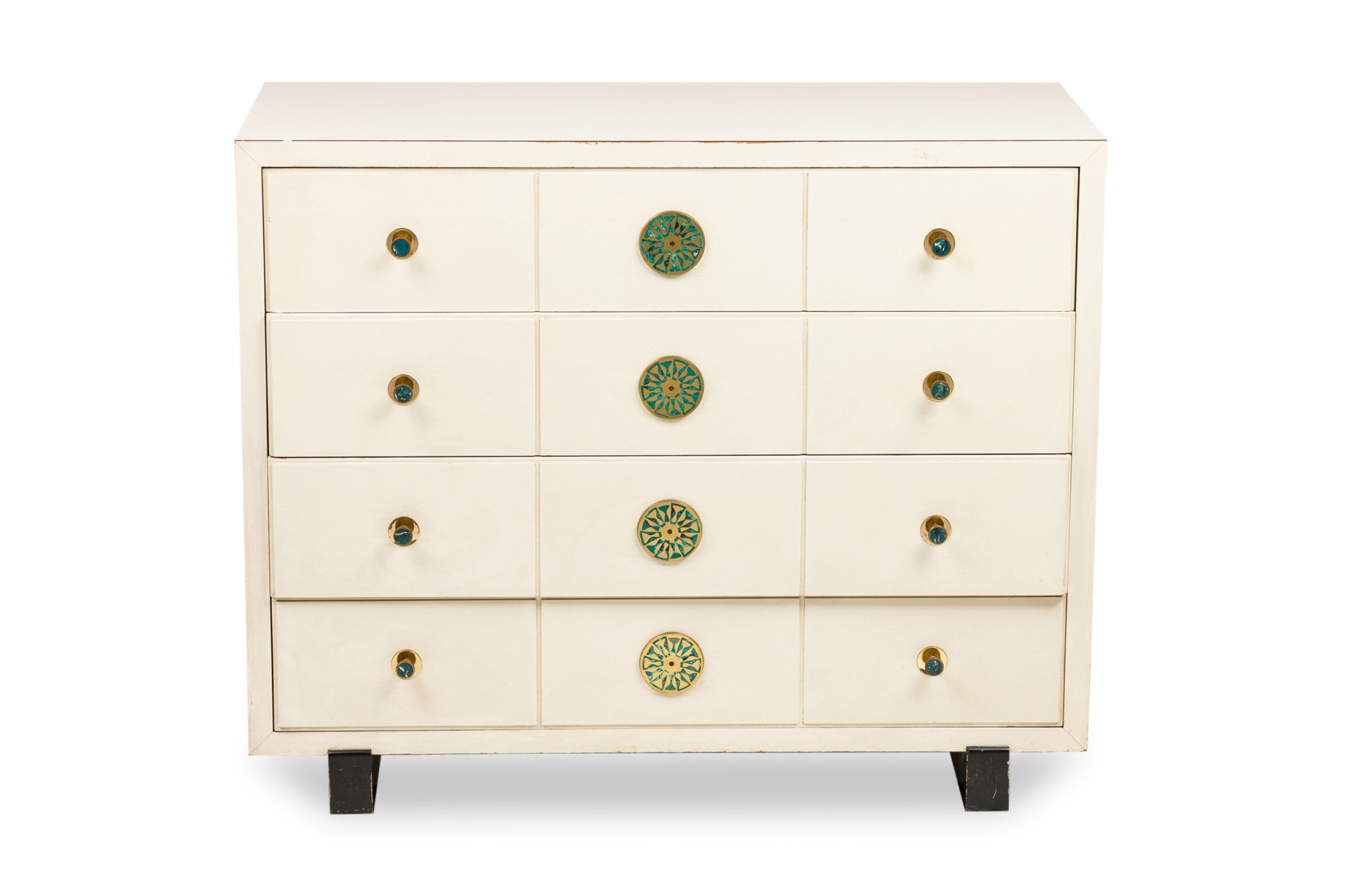 PAIR of American Mid-Century High Style White Painted Chest with 4 Drawers resting on black metal bases (TOMMI PARZINGER; decorative hardware by PEPE MEDOZA) (PRICED AS PAIR).