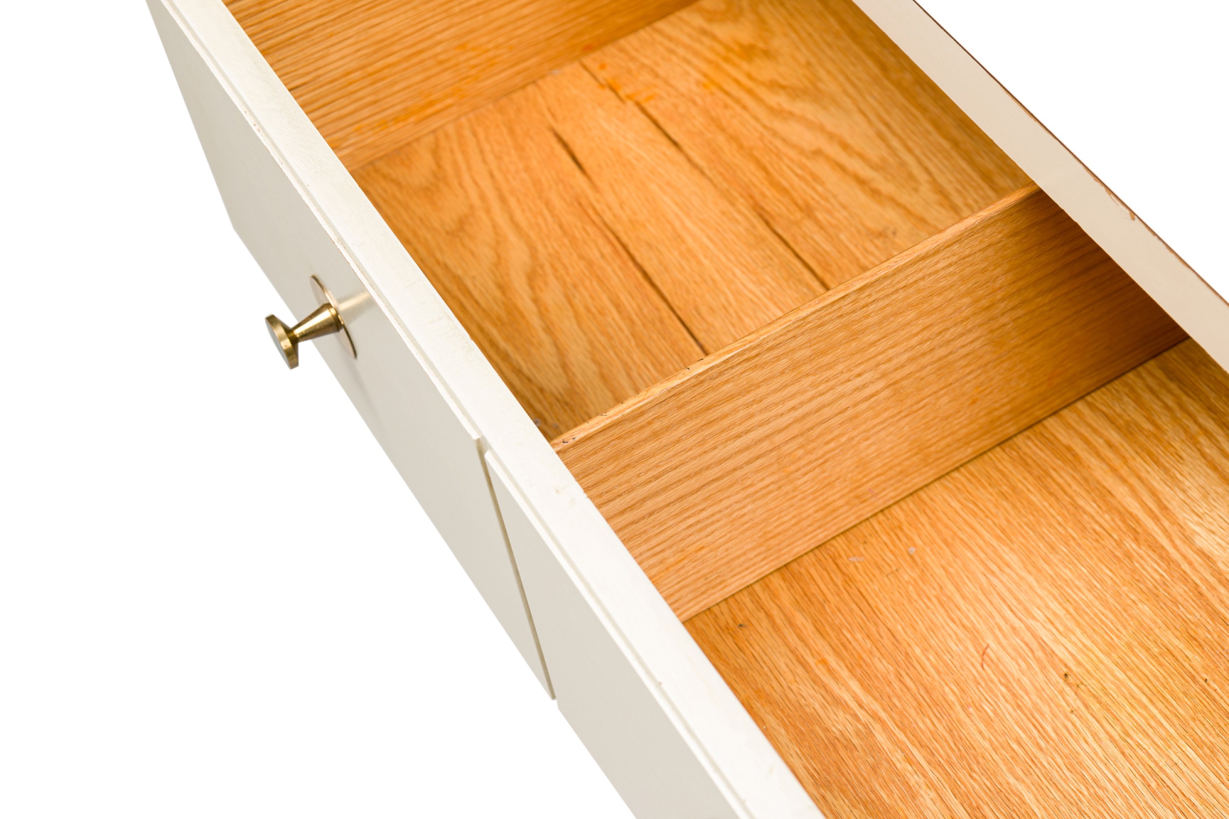 PAIR of American Mid-Century High Style White Painted Chest with 4 Drawers resting on black metal bases (TOMMI PARZINGER; decorative hardware by PEPE MEDOZA) (PRICED AS PAIR)
