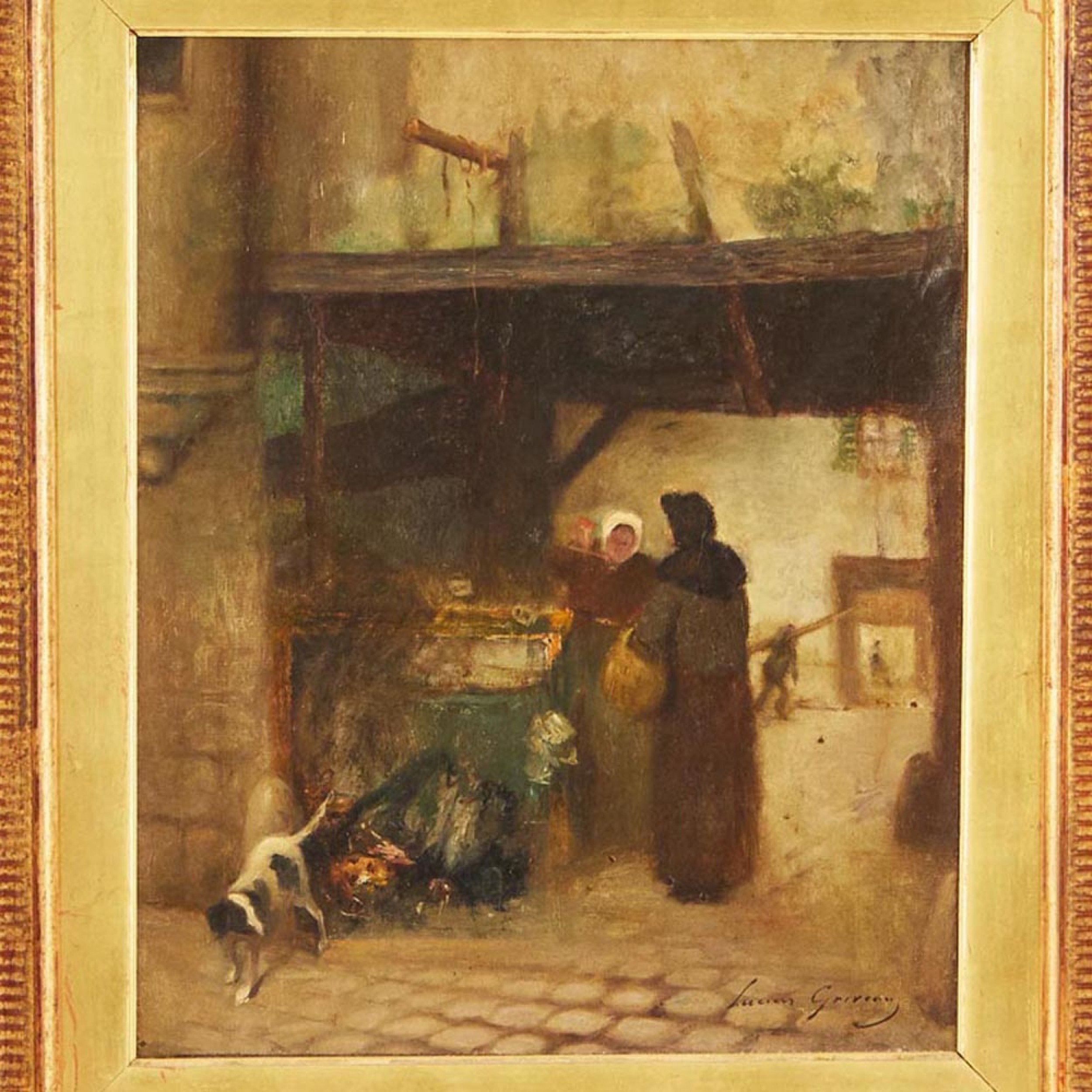 English Victorian (19th-Cent) townscape of two women and a dog in a market. Oil on canvas in a carved gilt wood frame.
