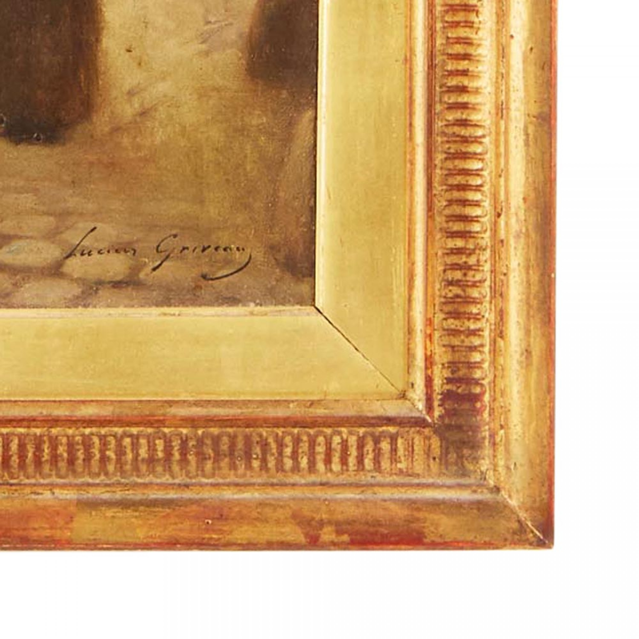 English Victorian (19th-Cent) townscape of two women and a dog in a market. Oil on canvas in a carved gilt wood frame..