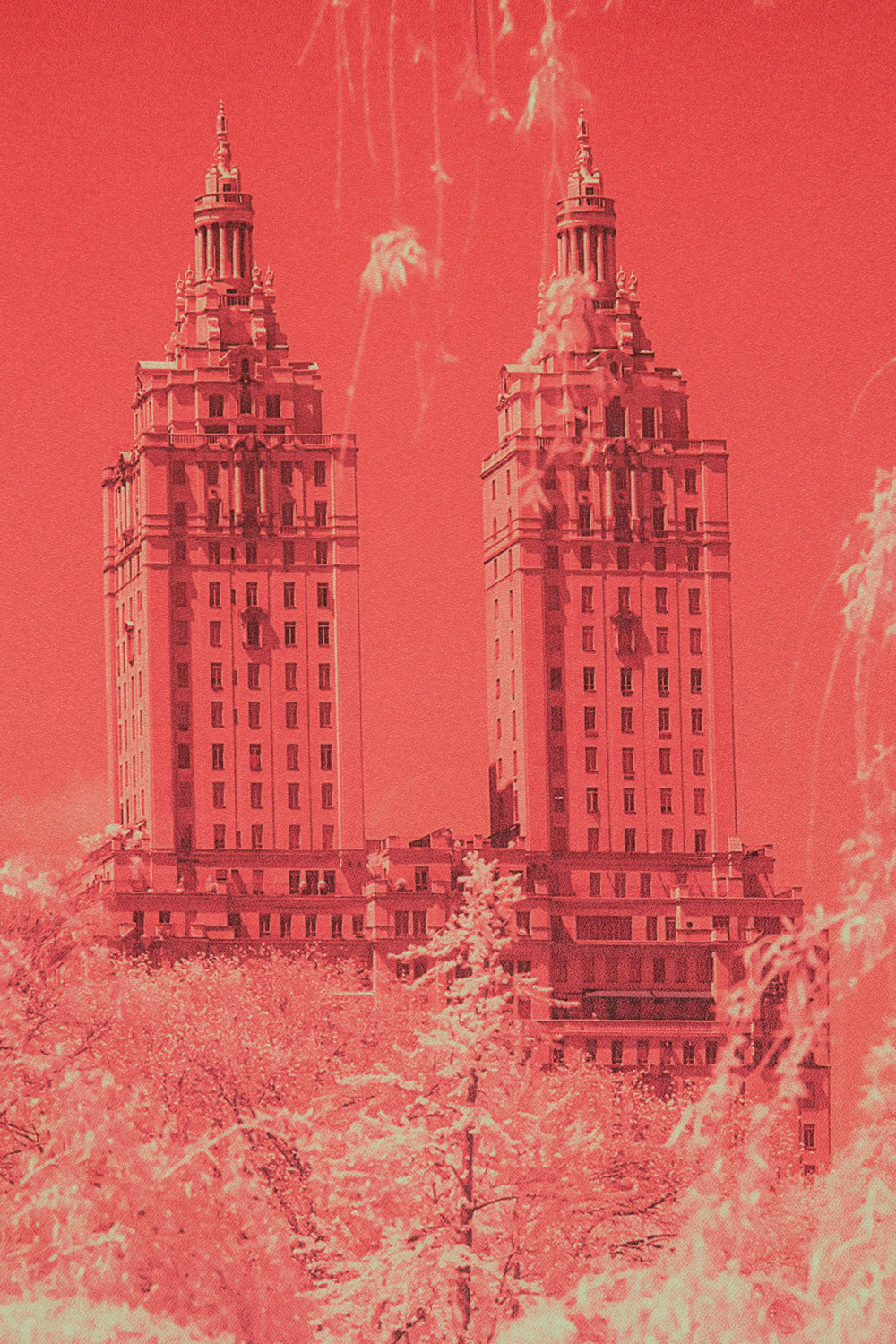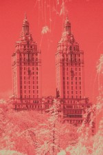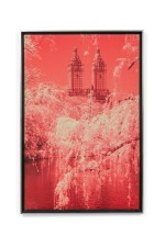Contemporary infrared photograph of a building above the trees titled "Central Park." One of a kind print on crepe fabric in a black and white frame. (TRISTAN GOVIGNON).
