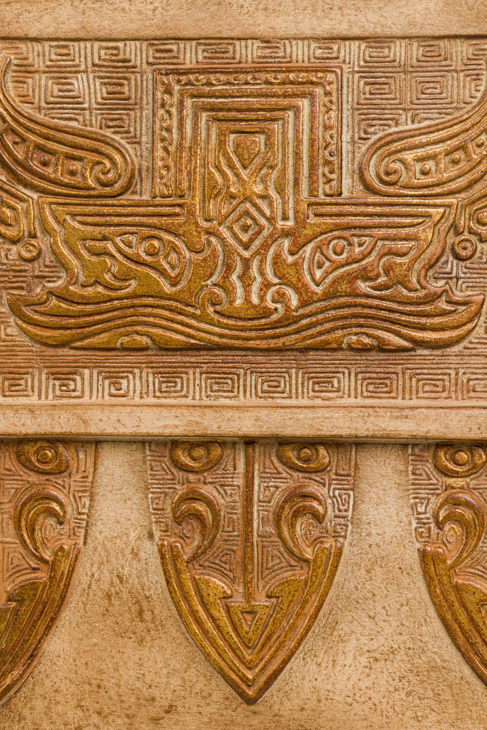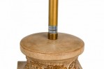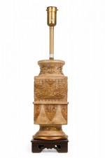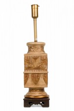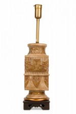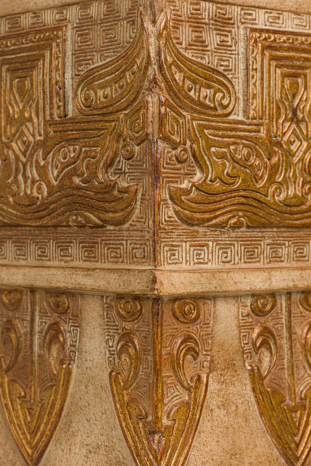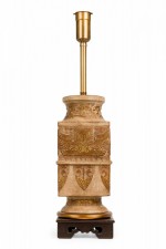 Mid-Century Italian ceramic ancient Chinese Western Zhou Dynasty-style ceramic table lamp in archaistic square form with concave neck and extended brass stem plus a tapered cylindrical light socket housing, the body fired in a stippled brown glaze with parcel gilt highlights, molded in a relief taotie mask / shield pattern split by a central rim, flared out toward bottom and mounted on a circular brass base over an openwork carved wood, shaped square, dark veneered stand. (UGO ZACCAGNINI).