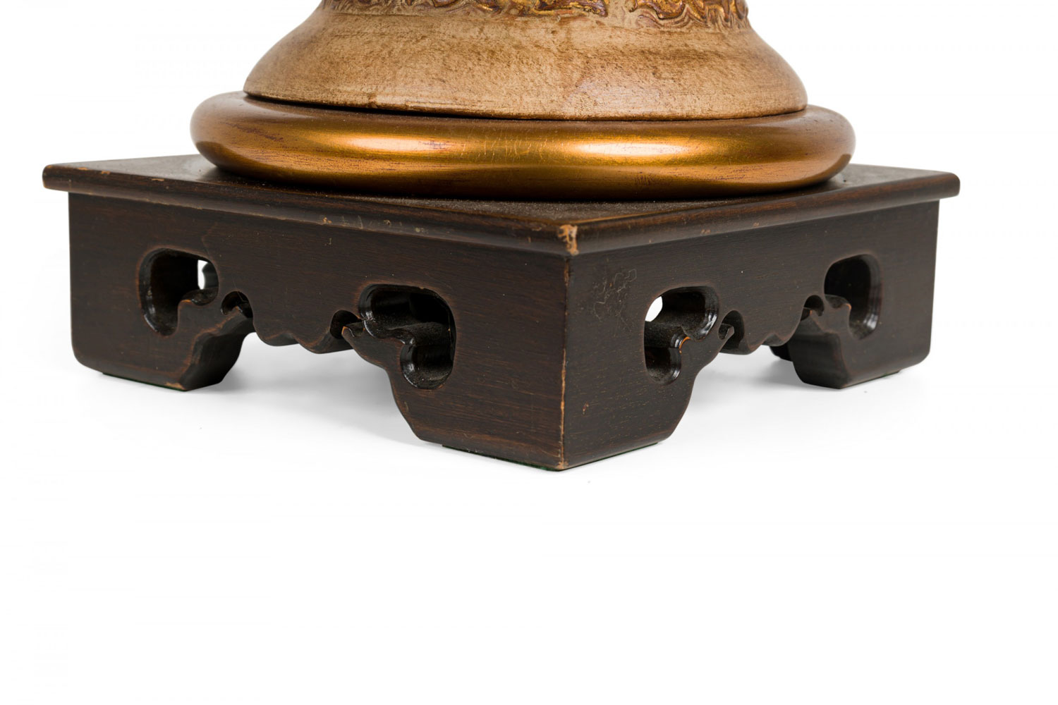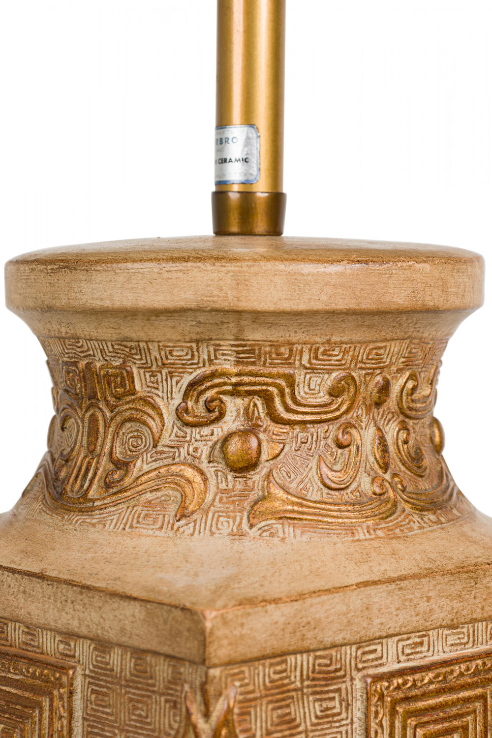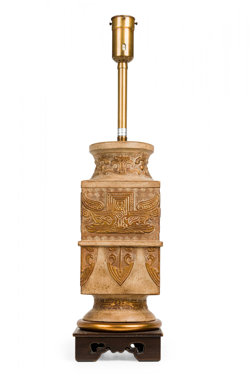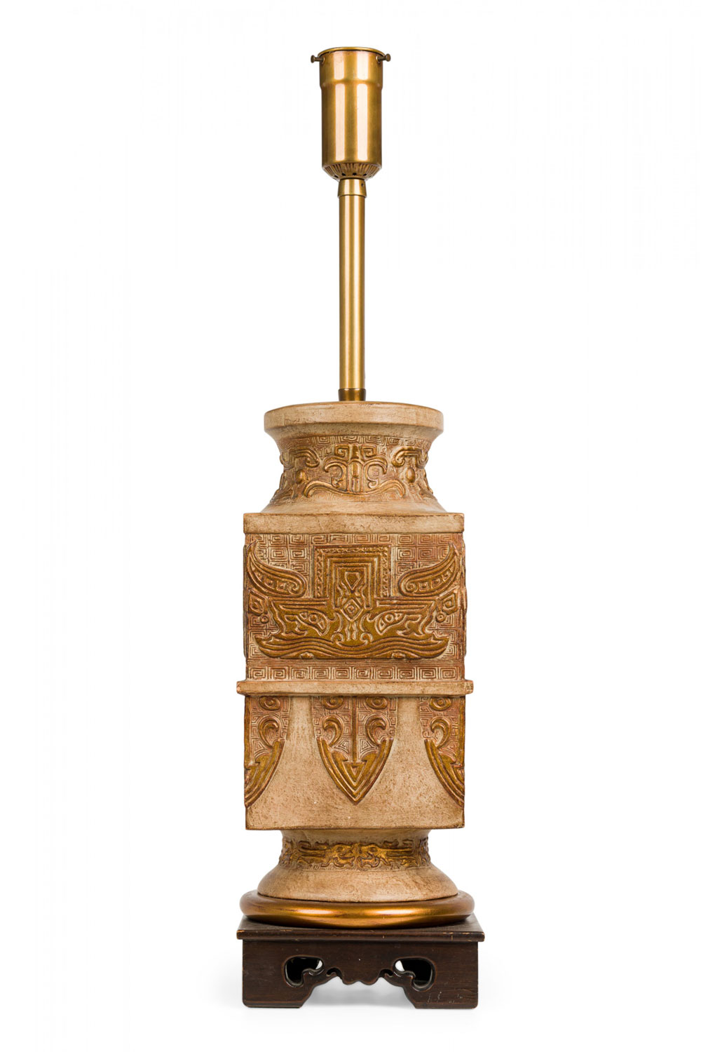 Mid-Century Italian ceramic ancient Chinese Western Zhou Dynasty-style ceramic table lamp in archaistic square form with concave neck and extended brass stem plus a tapered cylindrical light socket housing, the body fired in a stippled brown glaze with parcel gilt highlights, molded in a relief taotie mask / shield pattern split by a central rim, flared out toward bottom and mounted on a circular brass base over an openwork carved wood, shaped square, dark veneered stand. (UGO ZACCAGNINI)
