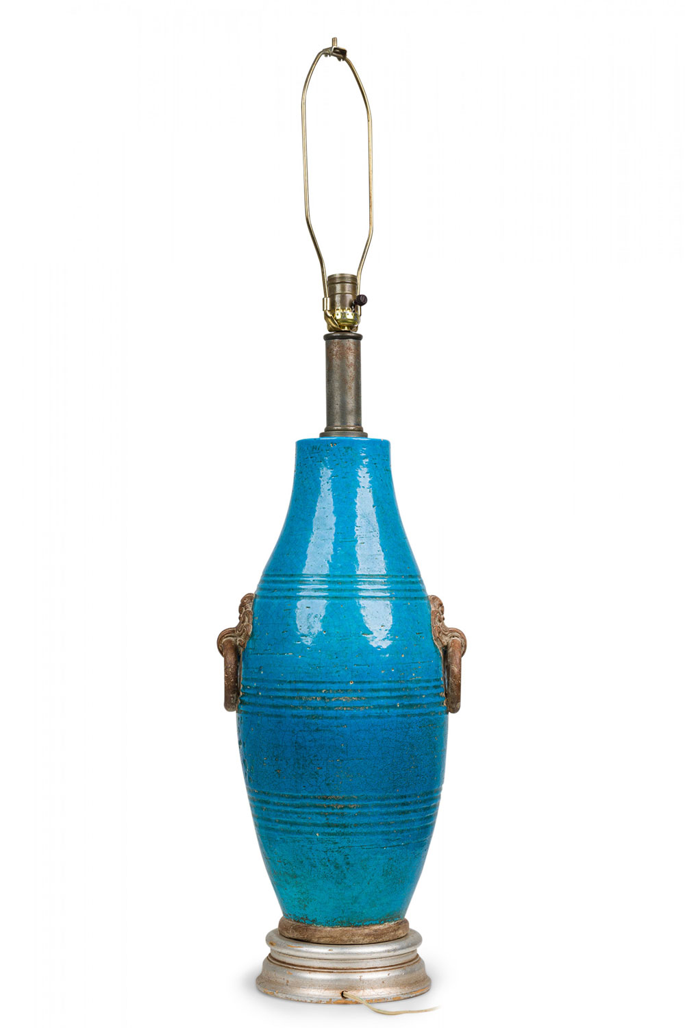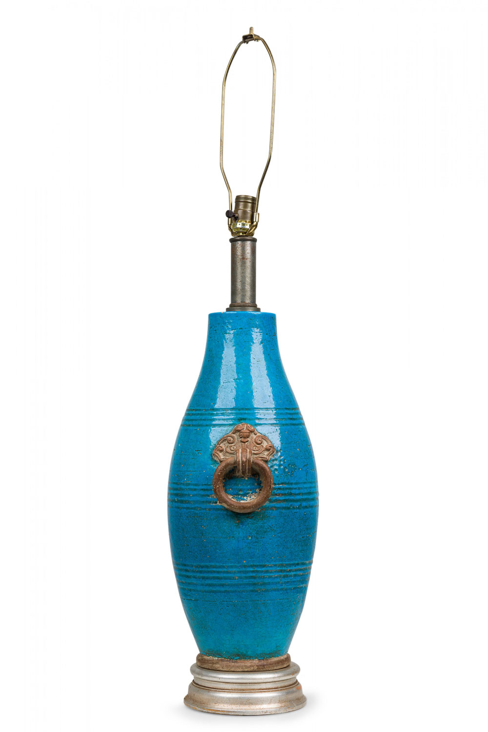 Mid-Century Italian vivid Persian blue glossy crrackle glaze ceramic table lamp in ovoid form with a tapered neck leading to a brushed pewter metal stem and functioning cupped light socket, the body incised with three decorative rows of banding flanked by faux mask matte oatmeal glazed ring handles and mounted on a circular aluminum base. (UGO ZACCAGNINI) (Similar pieces: DUL0094, DUL0096)
