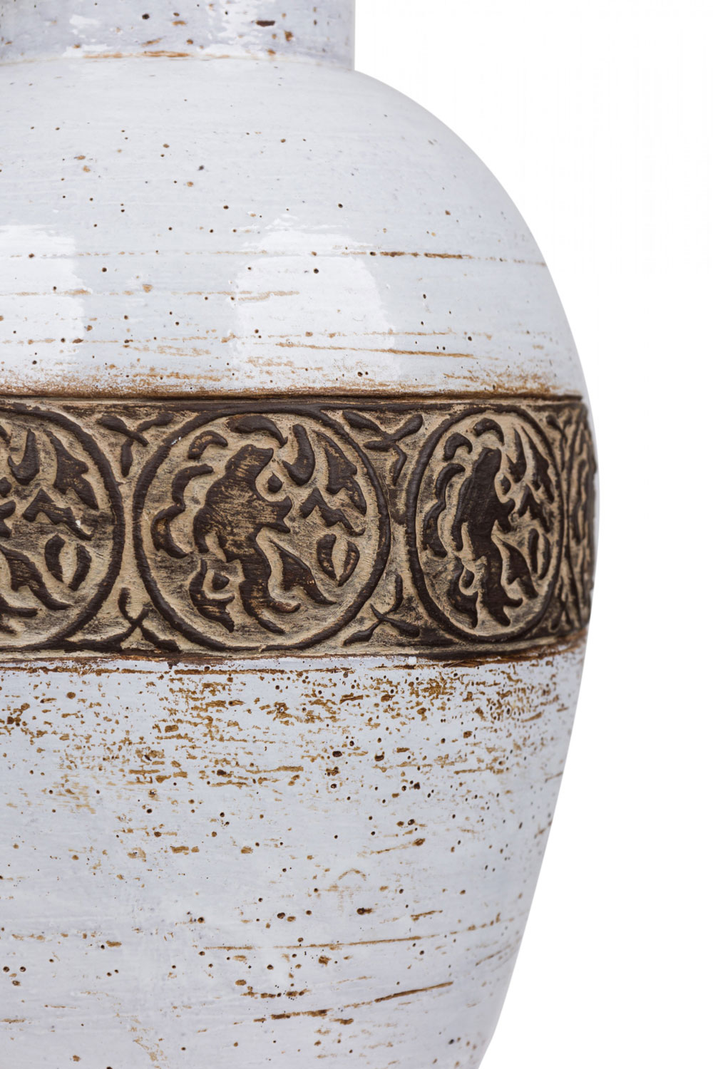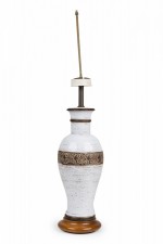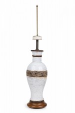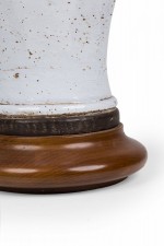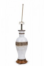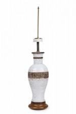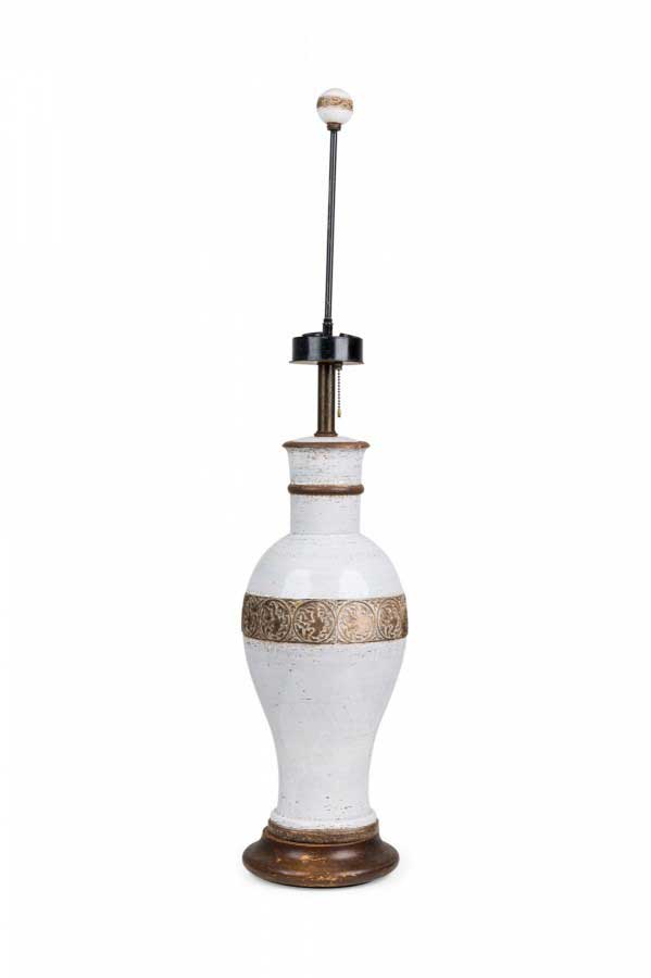 Mid-Century Italian ceramic urn repurposed as a table lamp in footed ovoid form with cylindrical neck topped by a ceramic banded sphere finial and a circular 3-way nonfunctioning white light switch socket, the body glazed in glossy white, decorated with a matte oatmeal glazed relief band and mounted on a beveled wood circular base in a light veneer. (UGO ZACCAGNINI) (Similar piece: DUL0013).