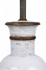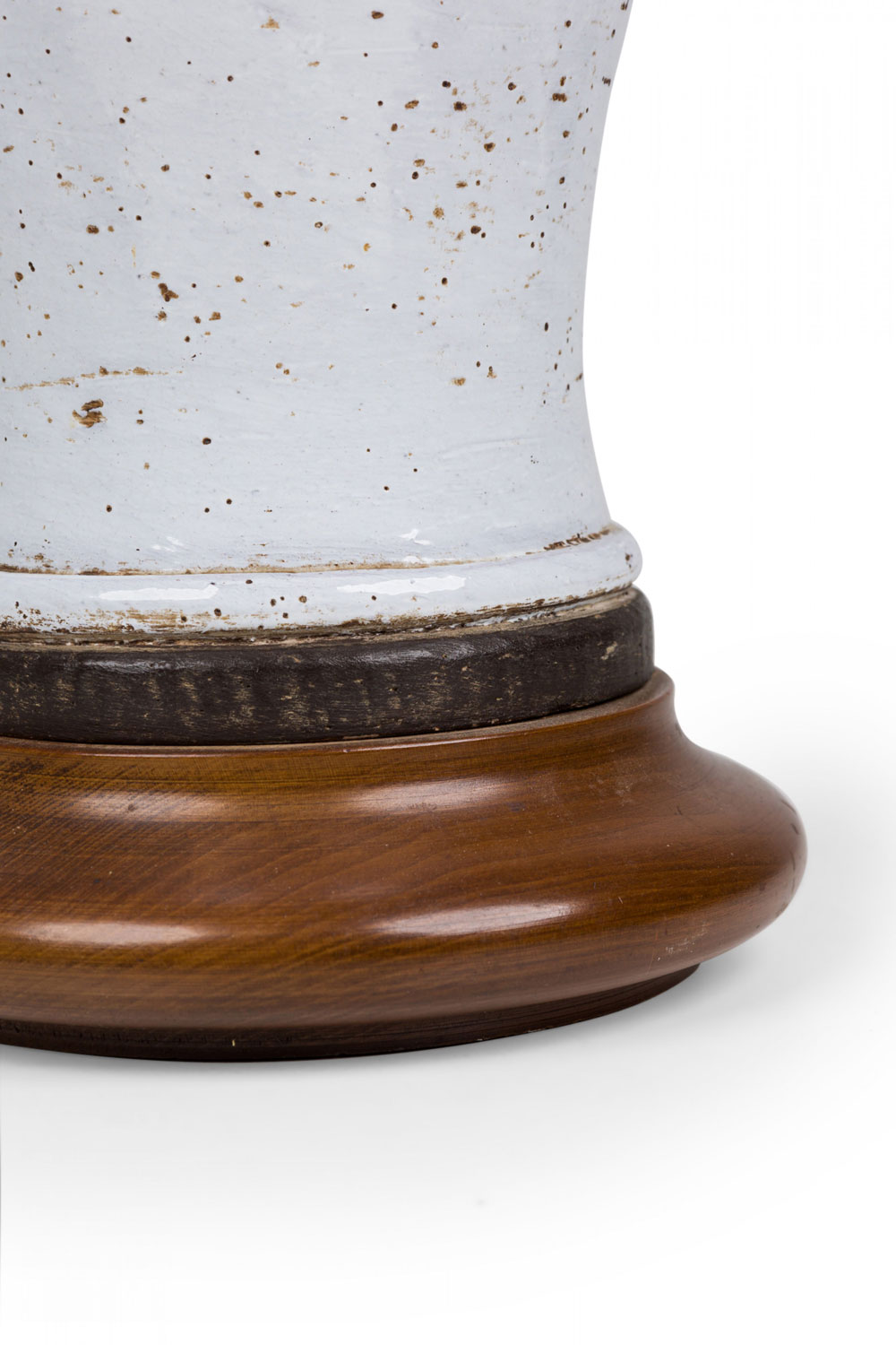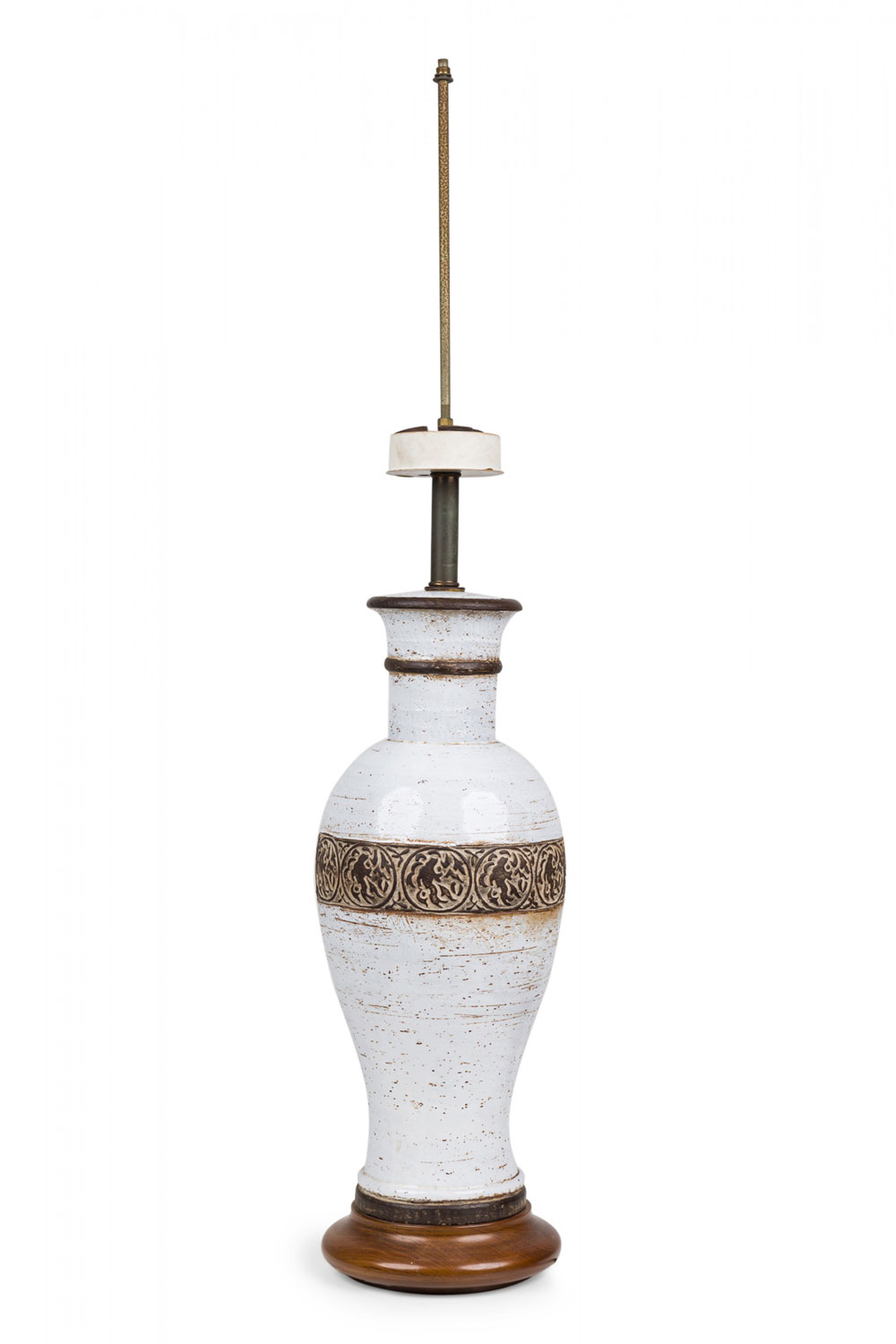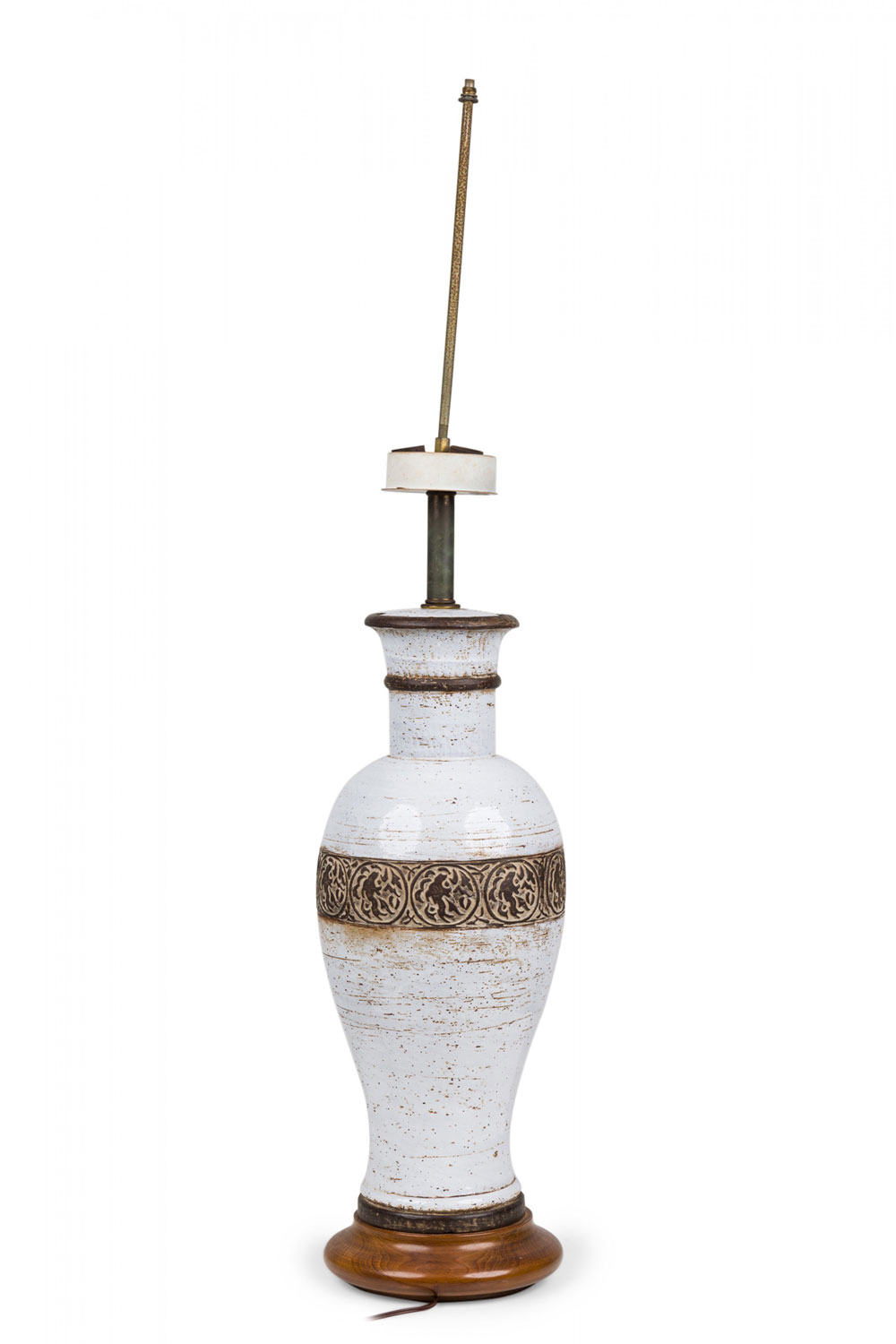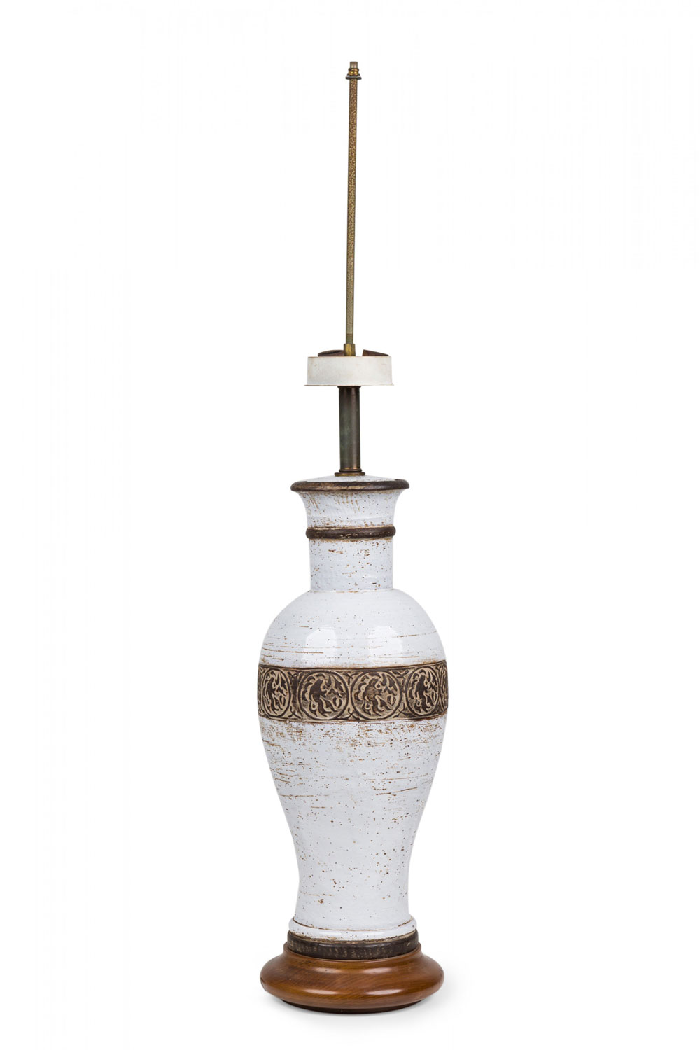 Mid-Century Italian ceramic urn repurposed as a table lamp in footed ovoid form with cylindrical neck topped by a ceramic banded sphere finial and a circular 3-way nonfunctioning white light switch socket, the body glazed in glossy white, decorated with a matte oatmeal glazed relief band and mounted on a beveled wood circular base in a light veneer. (UGO ZACCAGNINI) (Similar piece: DUL0013)