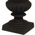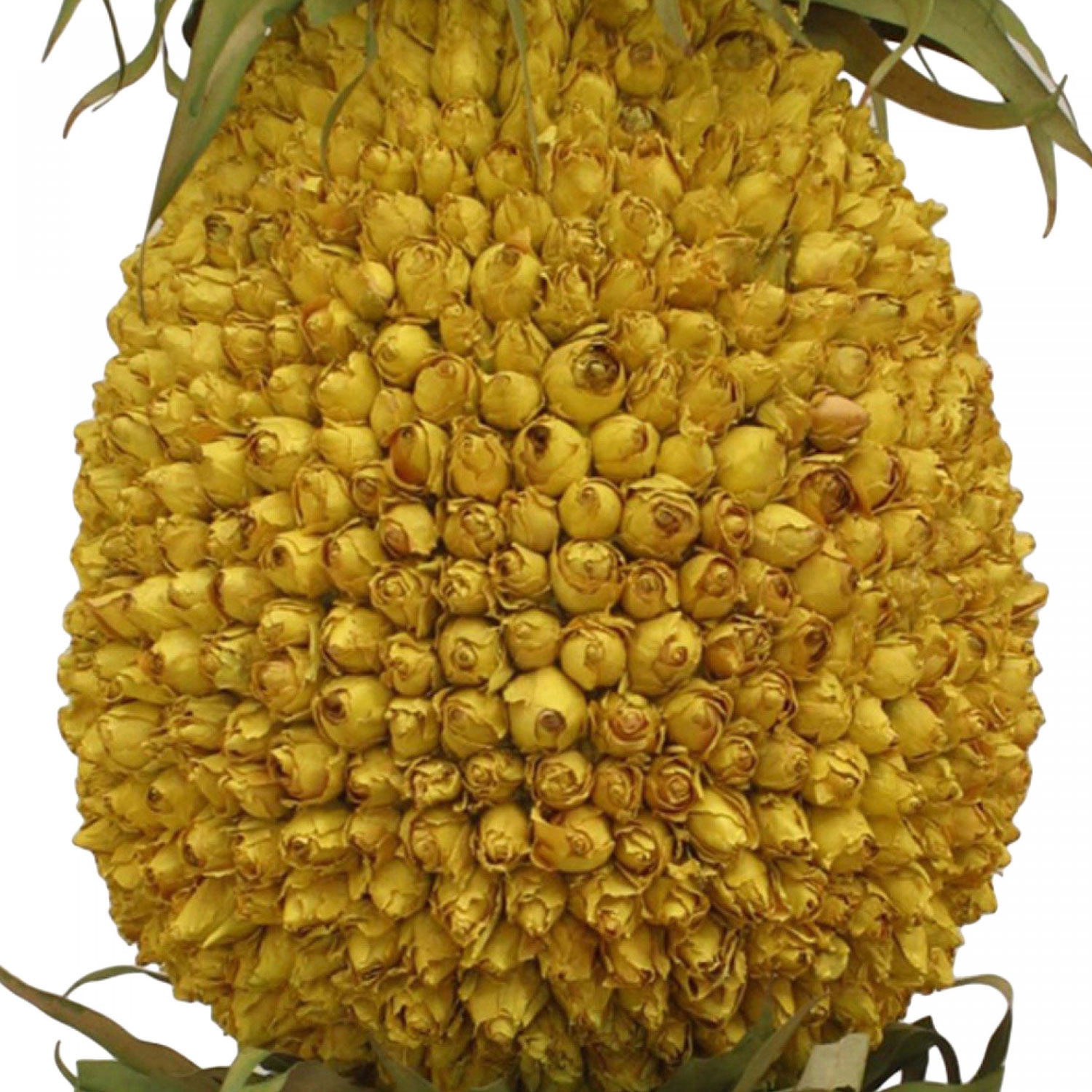 Outdoor small iron urn with potted dry flowers in the form of a yellow pineapple.
