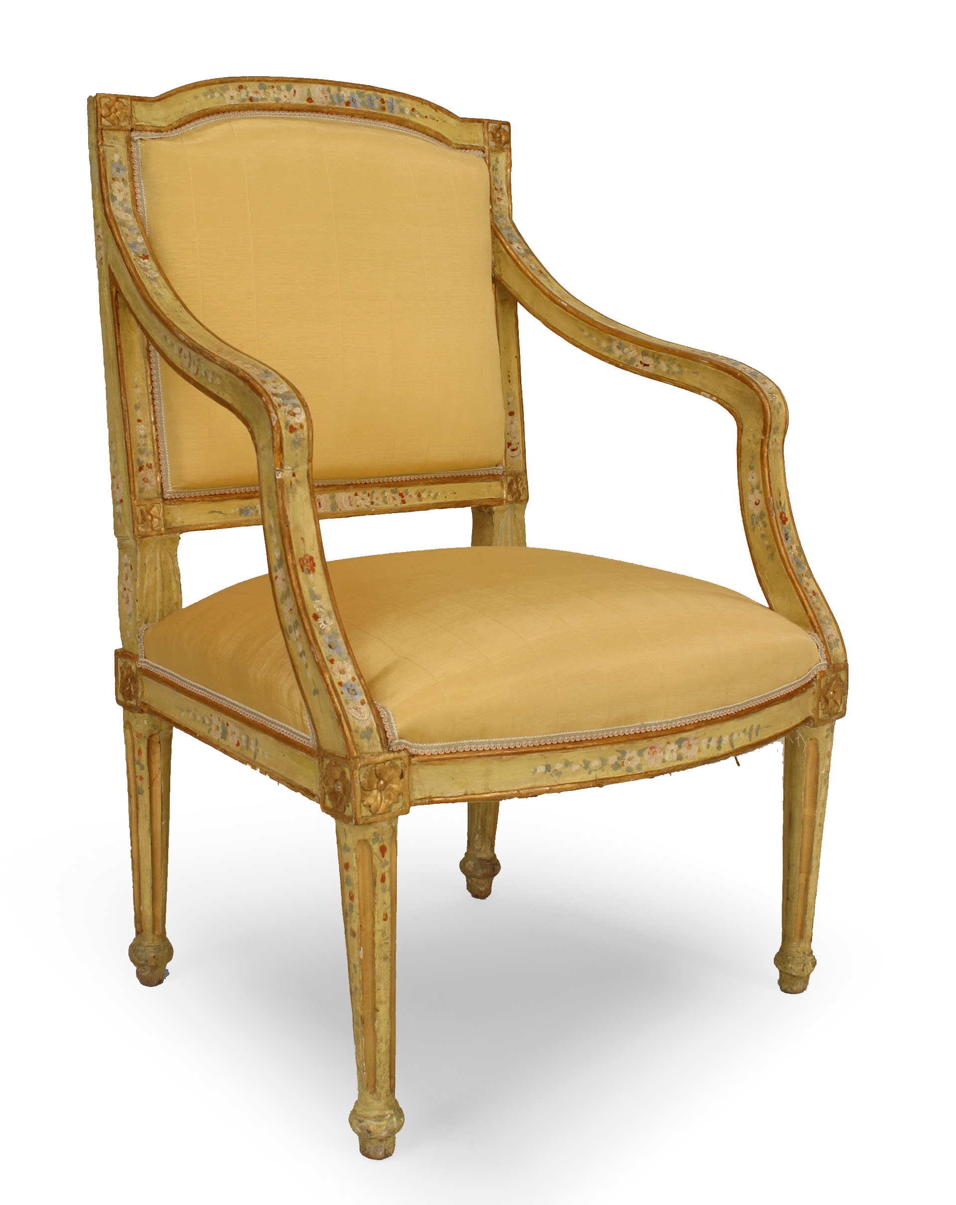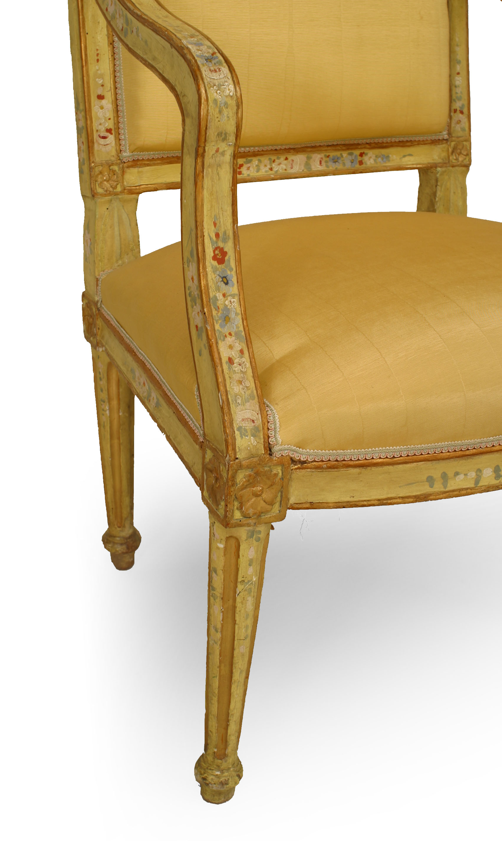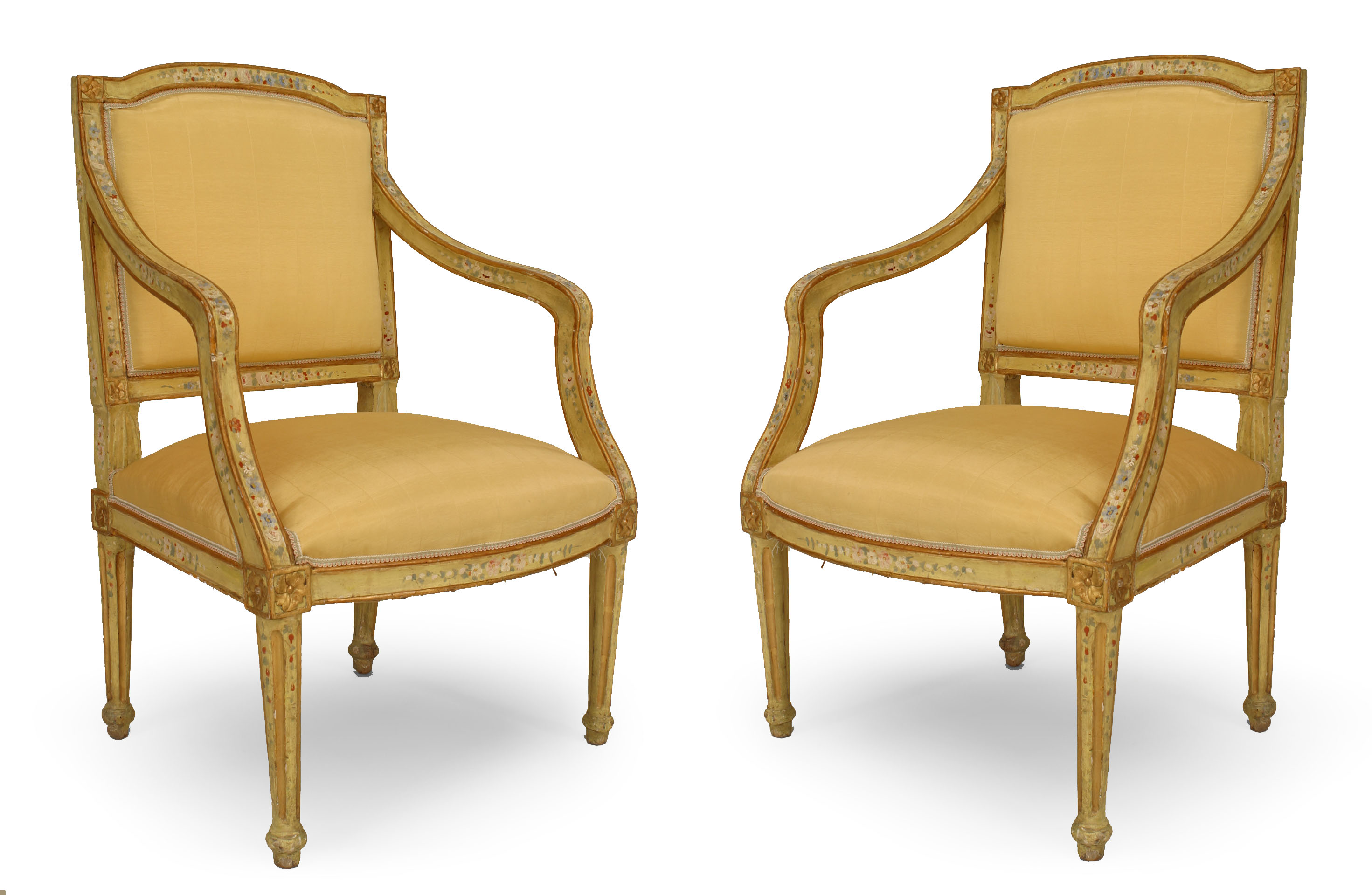 2 Similar PAIR of Italian Venetian (18th Cent) yellow painted open arm chairs with floral decoration and upholstered seat and back (PRICED PER PAIR)