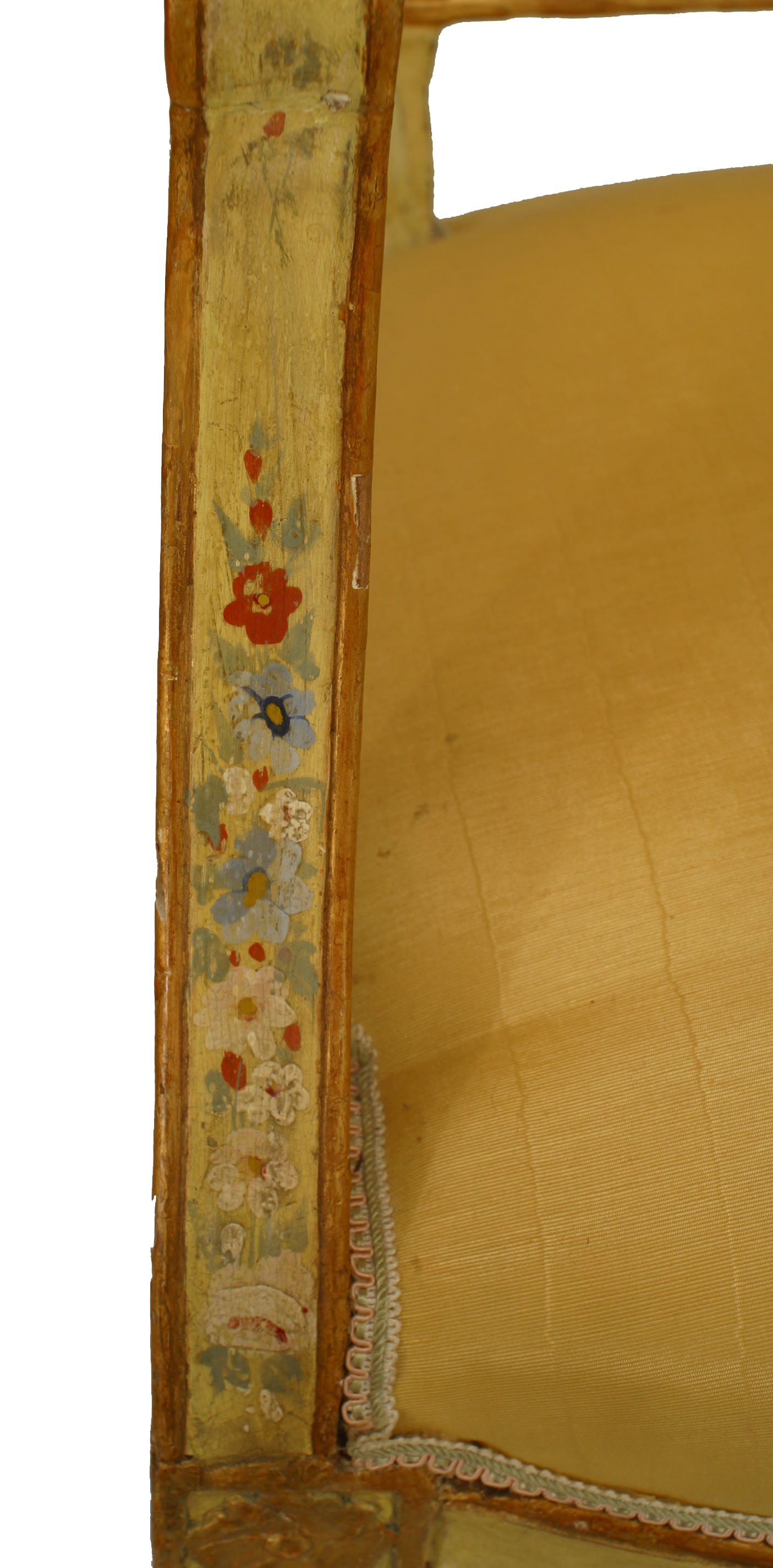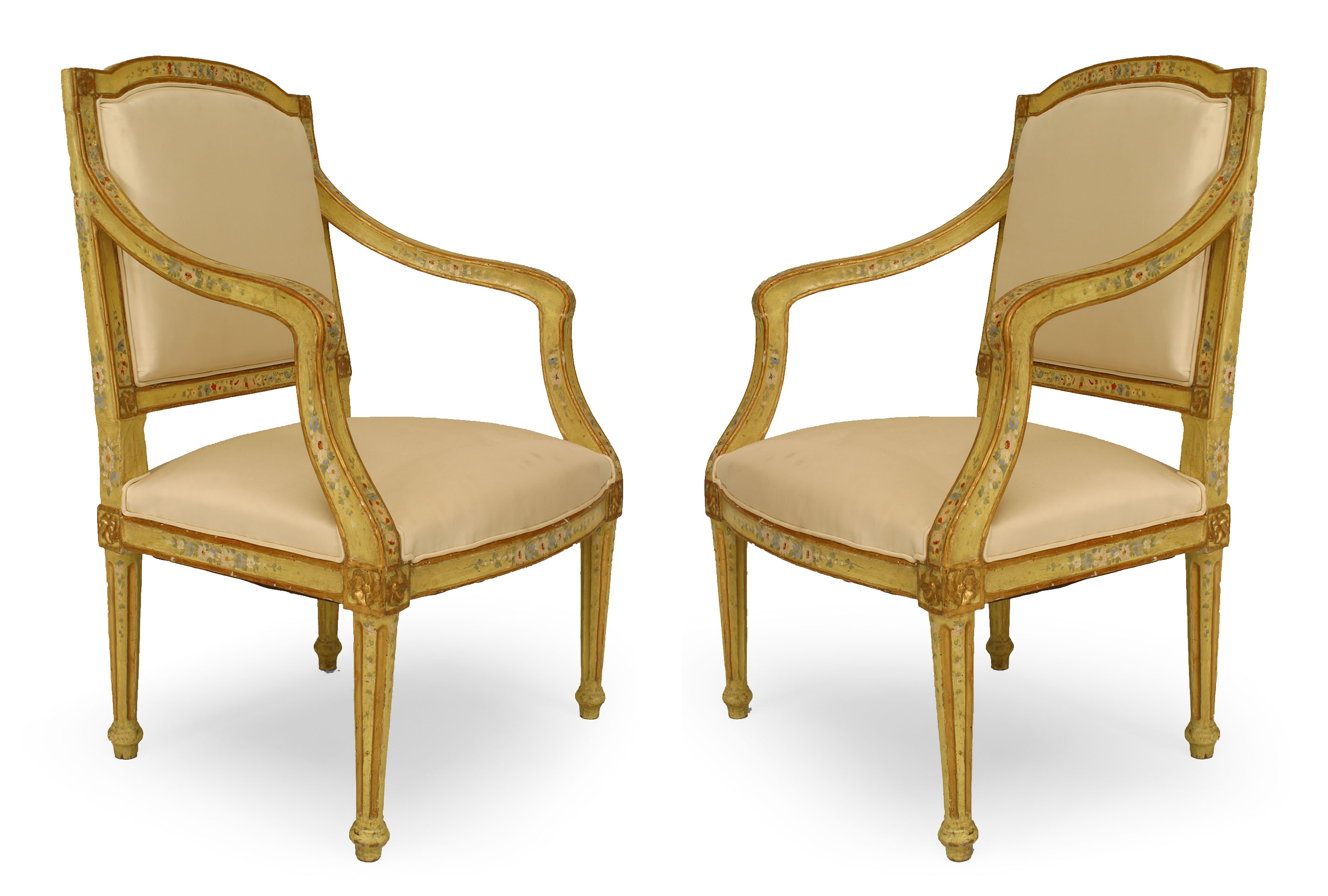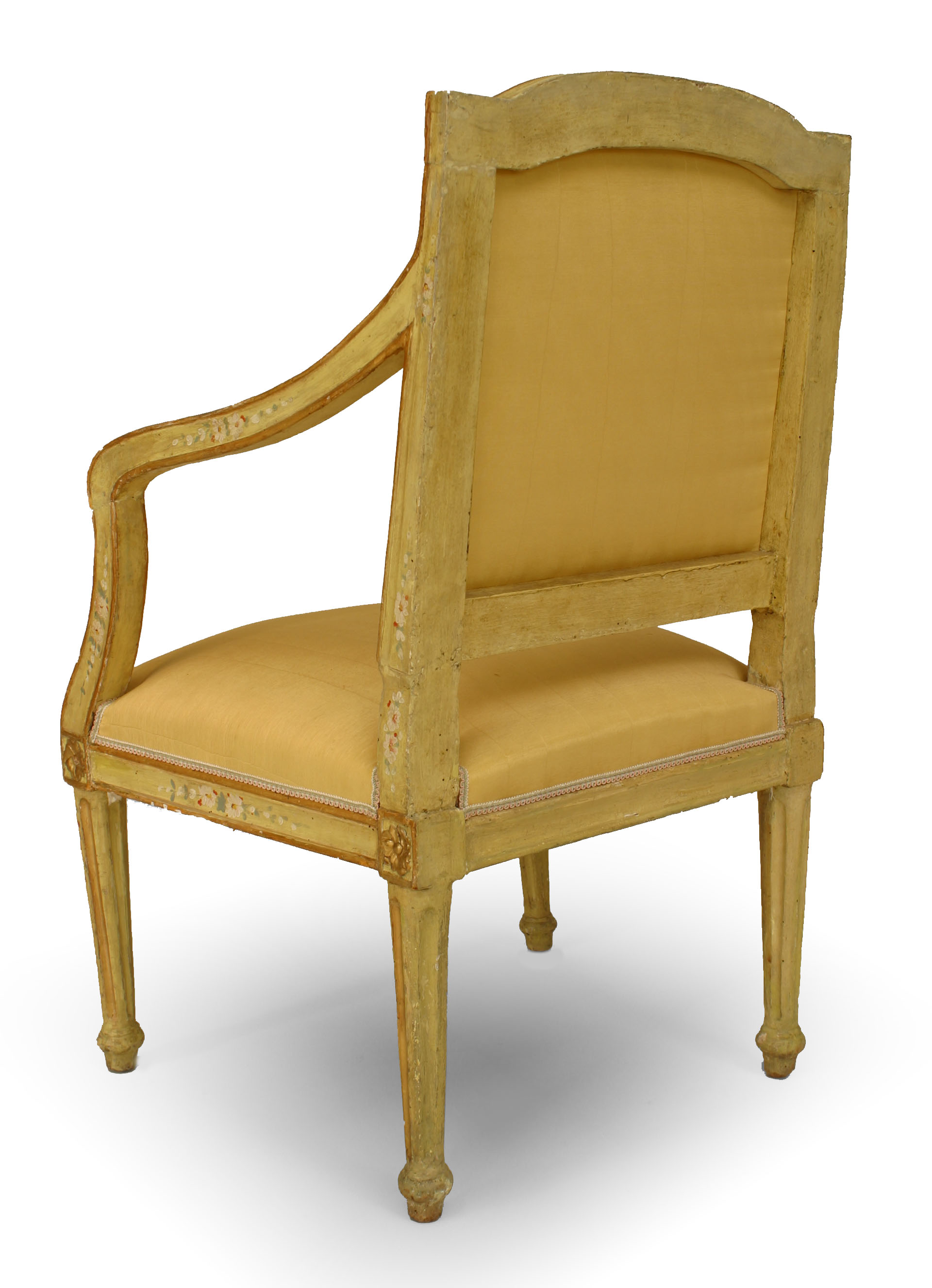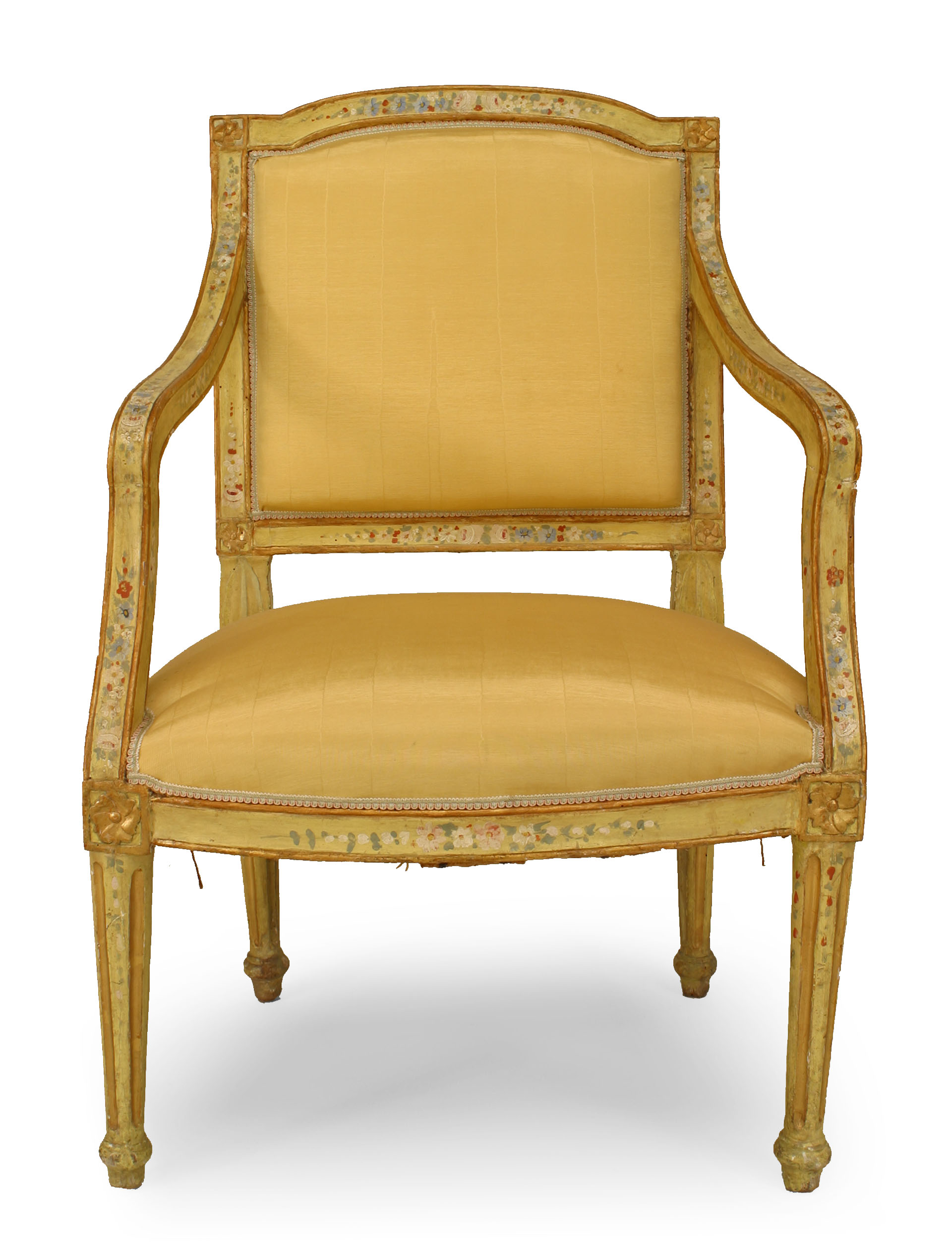 2 Similar PAIR of Italian Venetian (18th Cent) yellow painted open arm chairs with floral decoration and upholstered seat and back (PRICED PER PAIR)