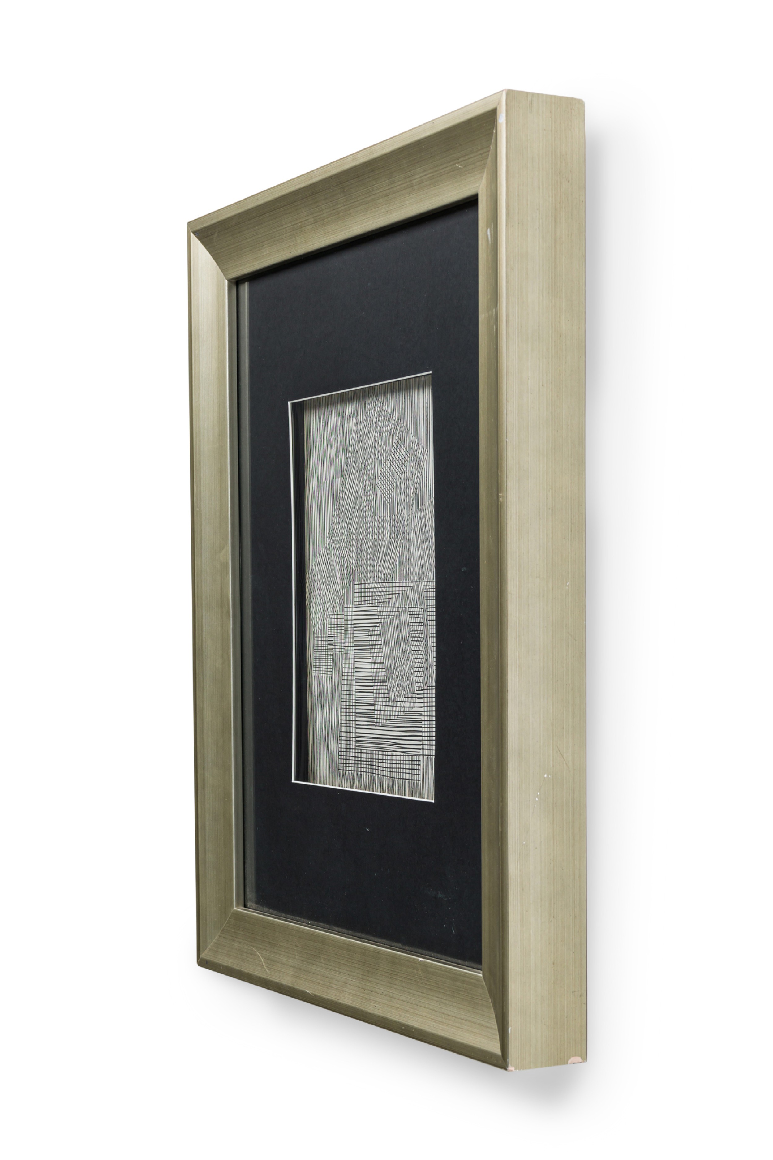 Mid-Century Hungarian-French OP Art creates a lenticular effect or an optical illusion with circular, triangular and square shapes printed on plastic housed in a silver shadow box frame (titled: Plastic OP Art of the 20th Century) (VICTOR VASARELY)