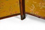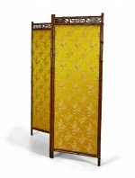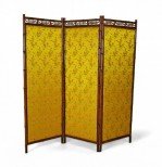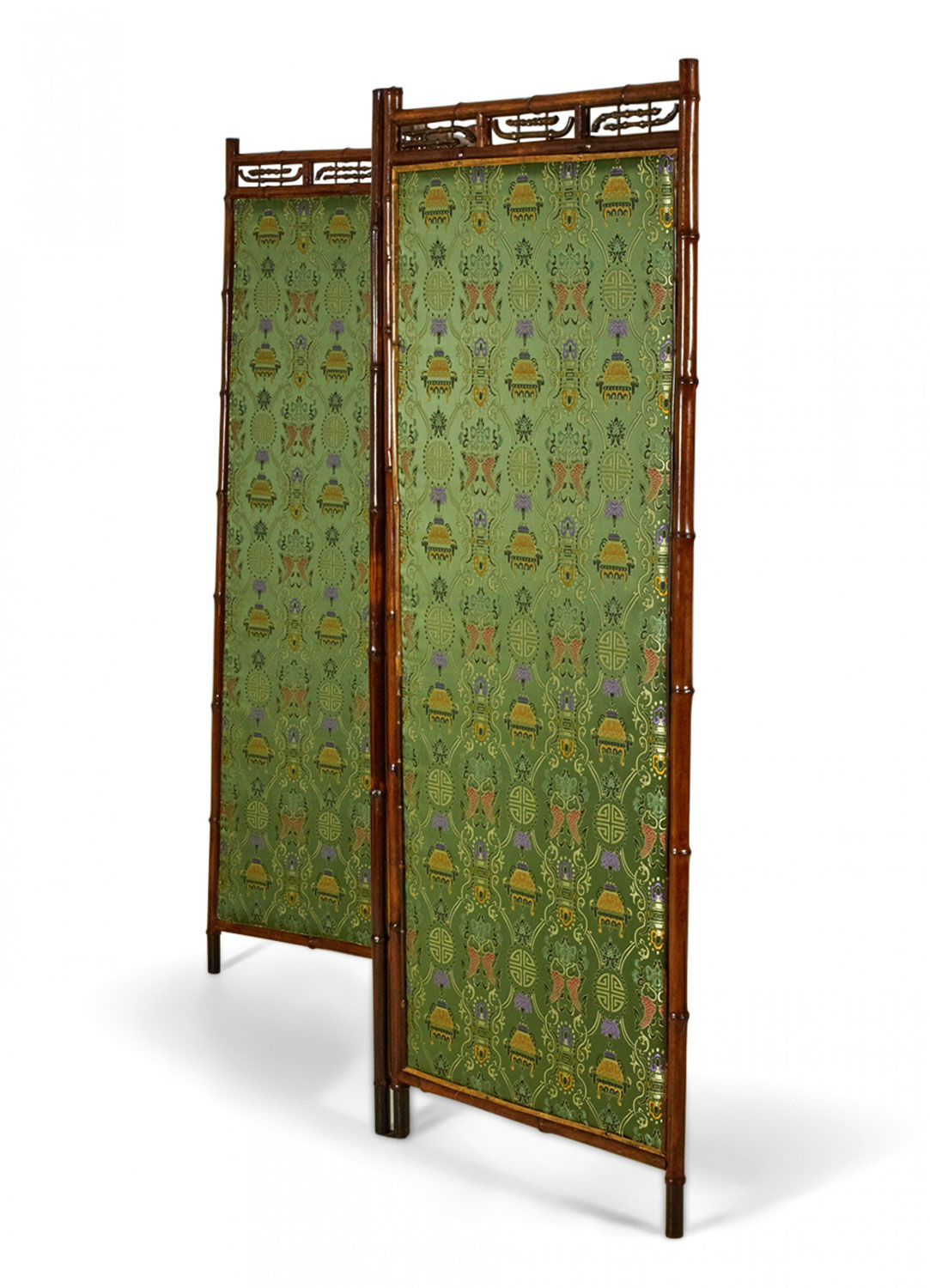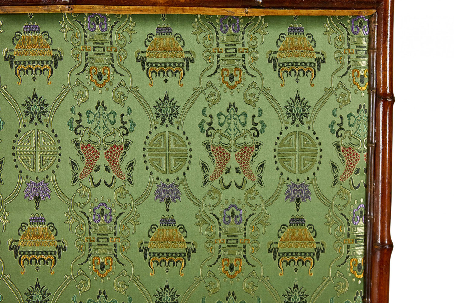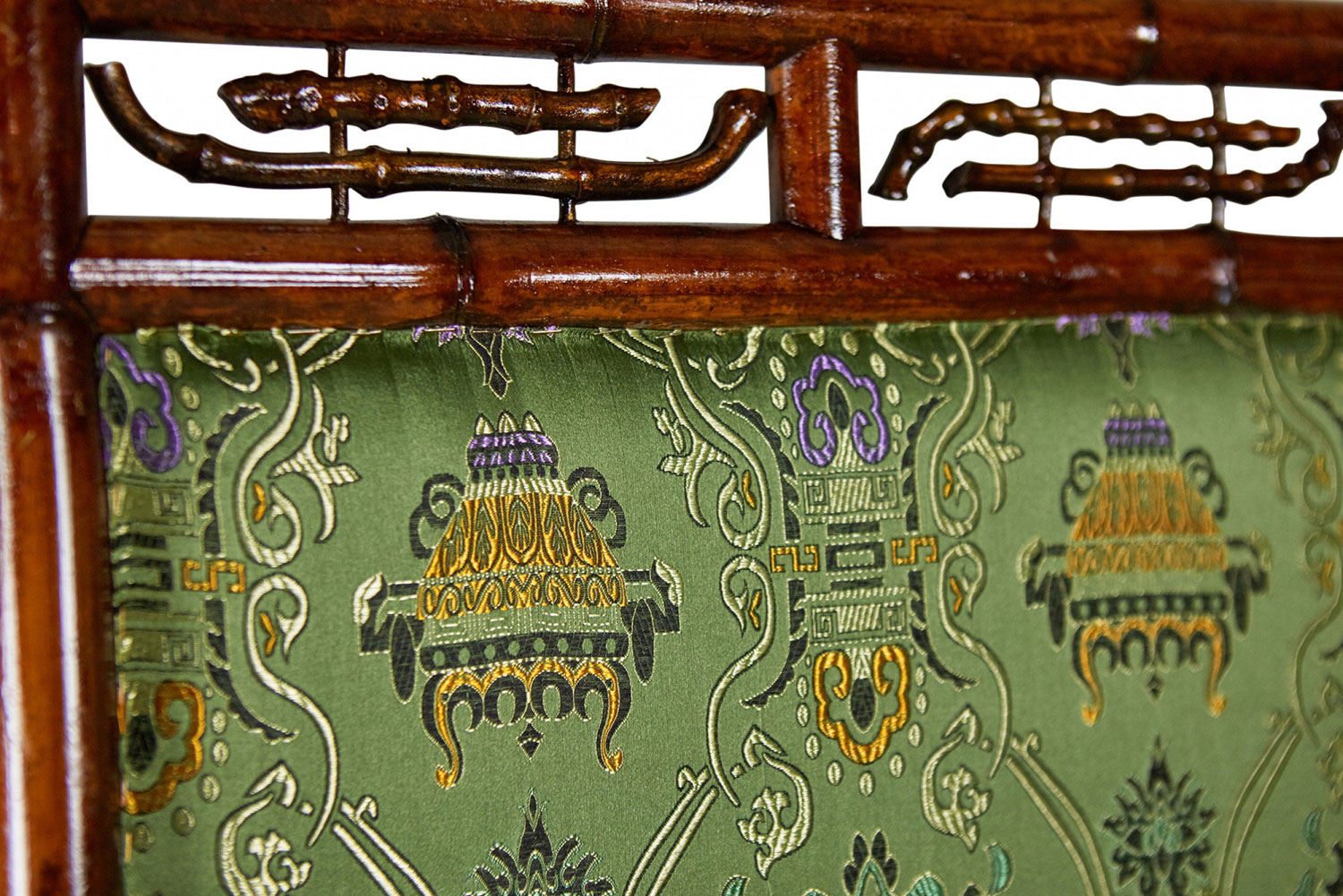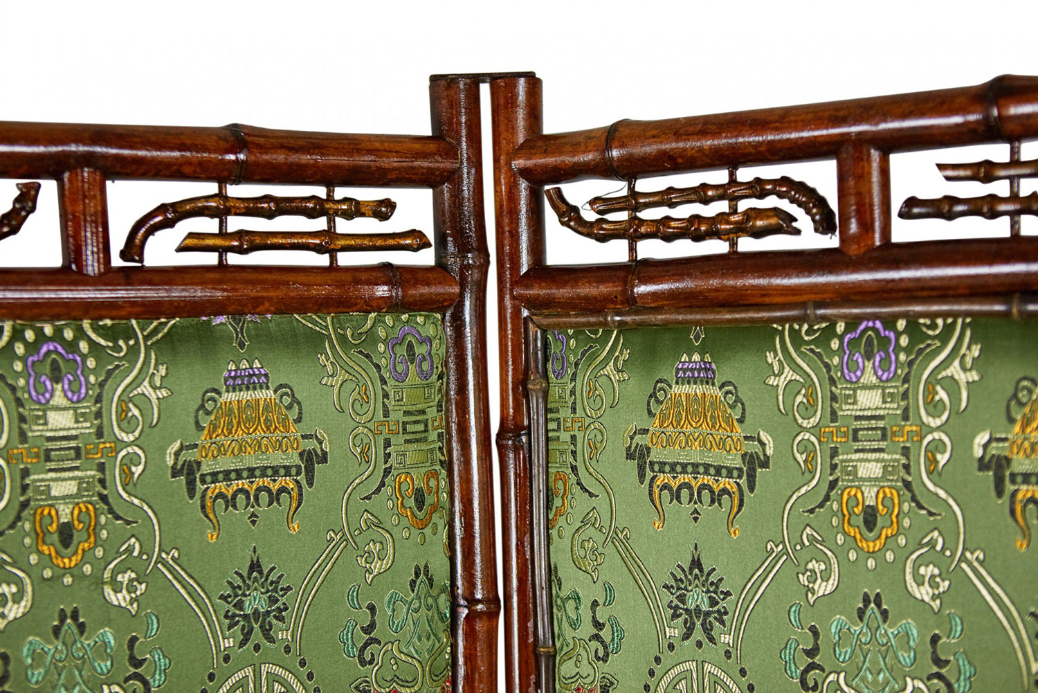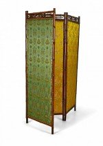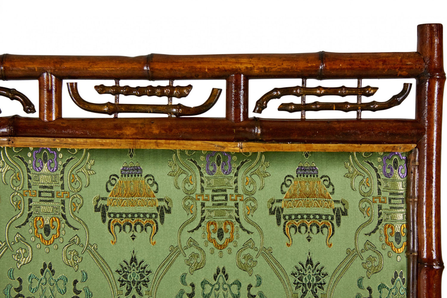 English Victorian bamboo 3 fold screen with Chinese patterned silk panels, one side in yellow, one side in green, and a filigree top border.