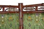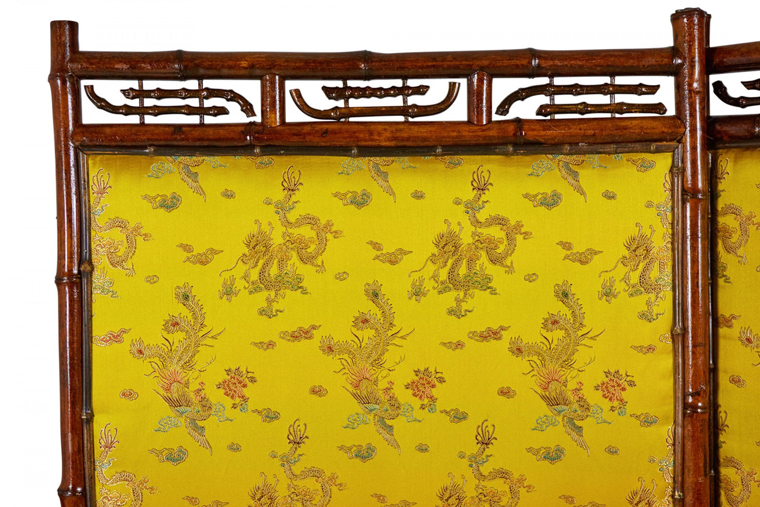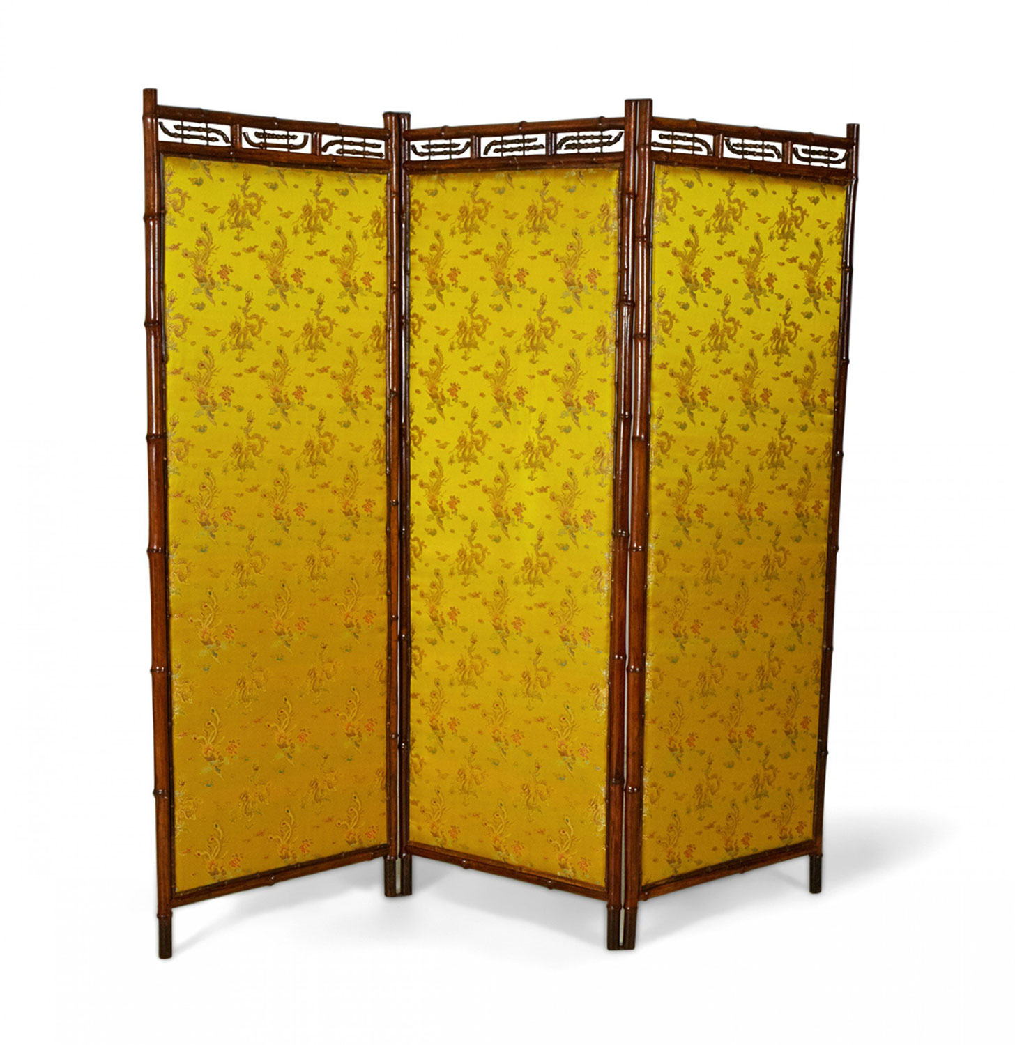 English Victorian bamboo 3 fold screen with Chinese patterned silk panels, one side in yellow, one side in green, and a filigree top border..