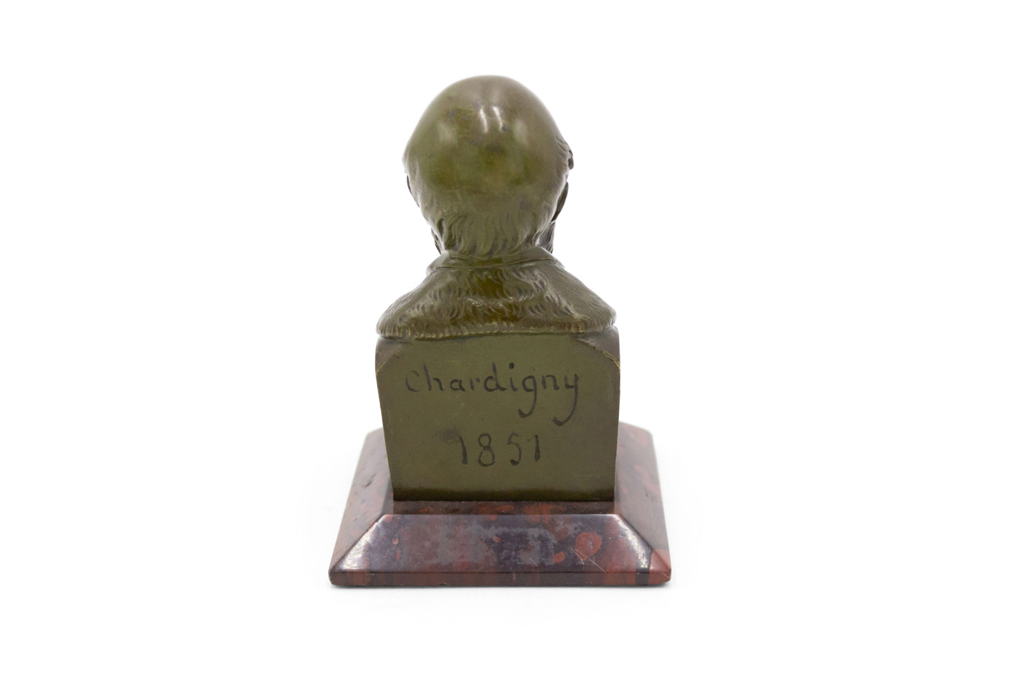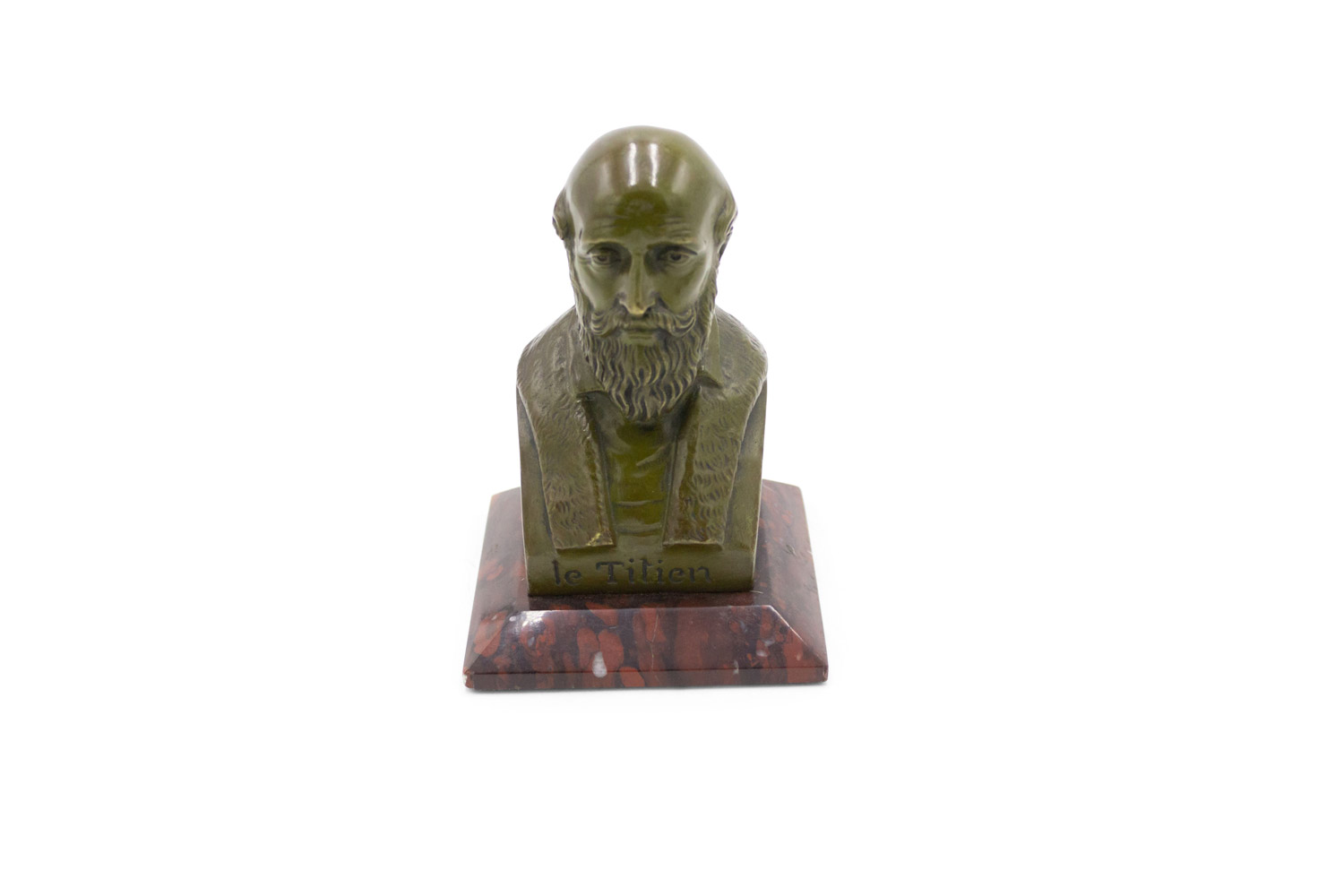 PAIR of French Victorian patinated bronze busts of Louis XVI and le Titien each on a square rouge marble base (signed: Chardigny/1858).