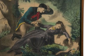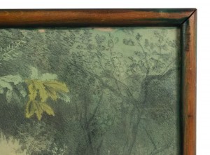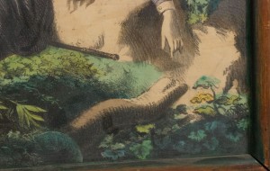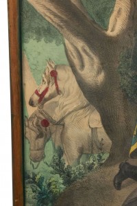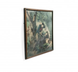 English Victorian style (20th Cent) colored lithograph of man and lady with 2 horses in green painted frame