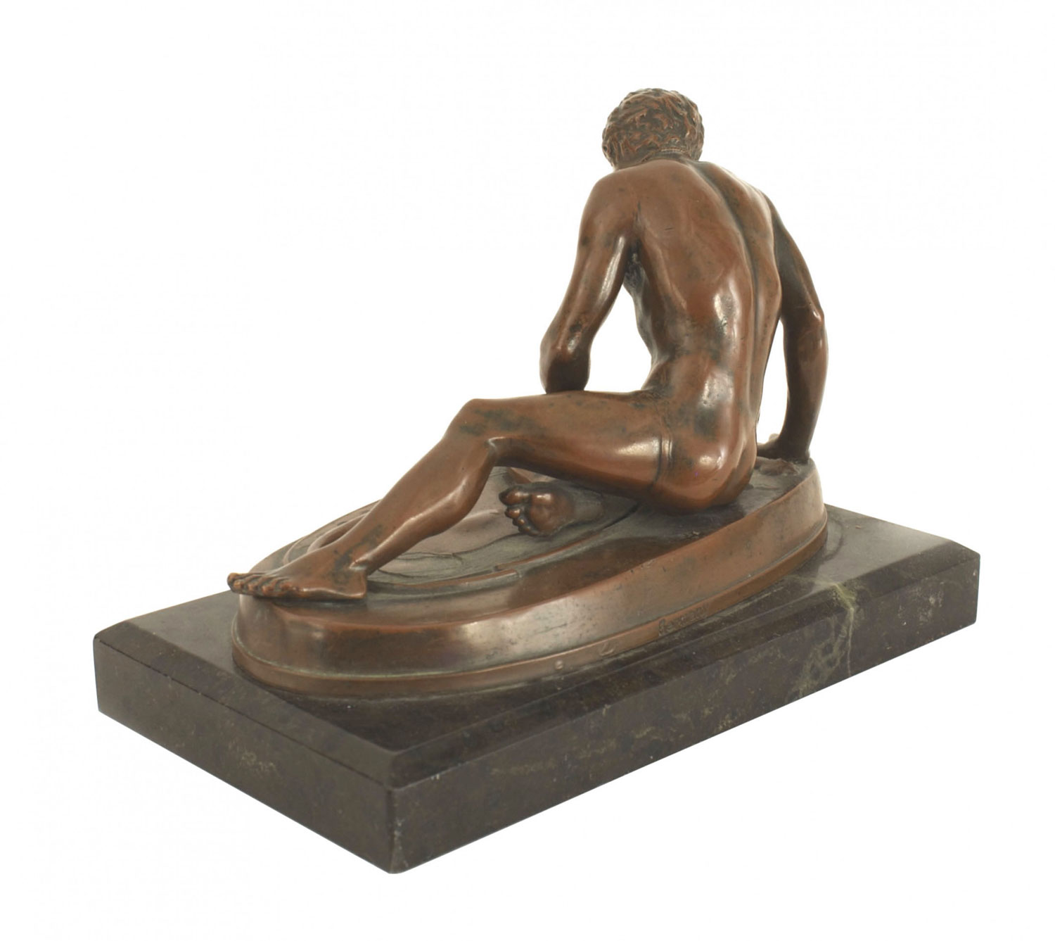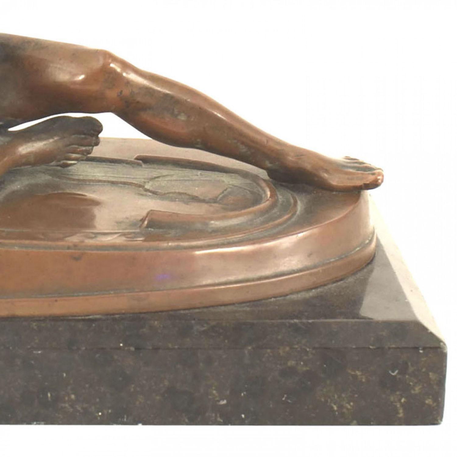 French Victorian copper over composition reclining figure emanating out of an oval platform and mounted on a black marble base. (Copy of Hellenistic Dying Gaul)