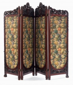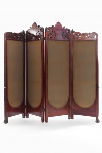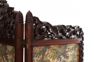 English Victorian mahogany 4-fold screen with heavy carved scroll filigree top and tapestry panels.