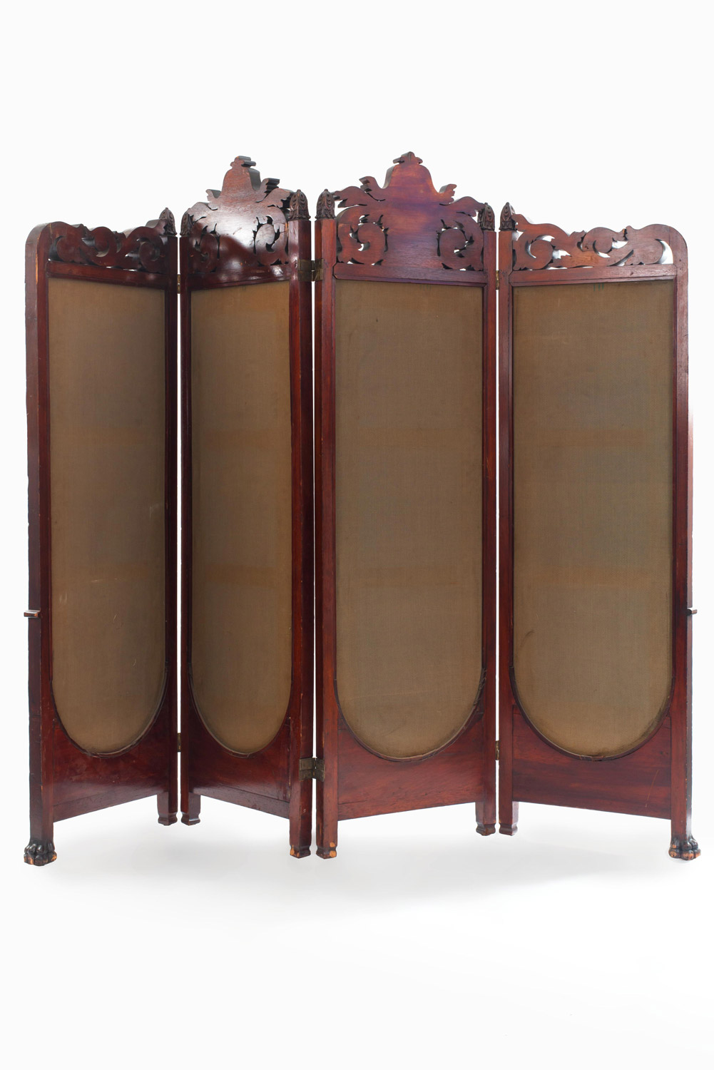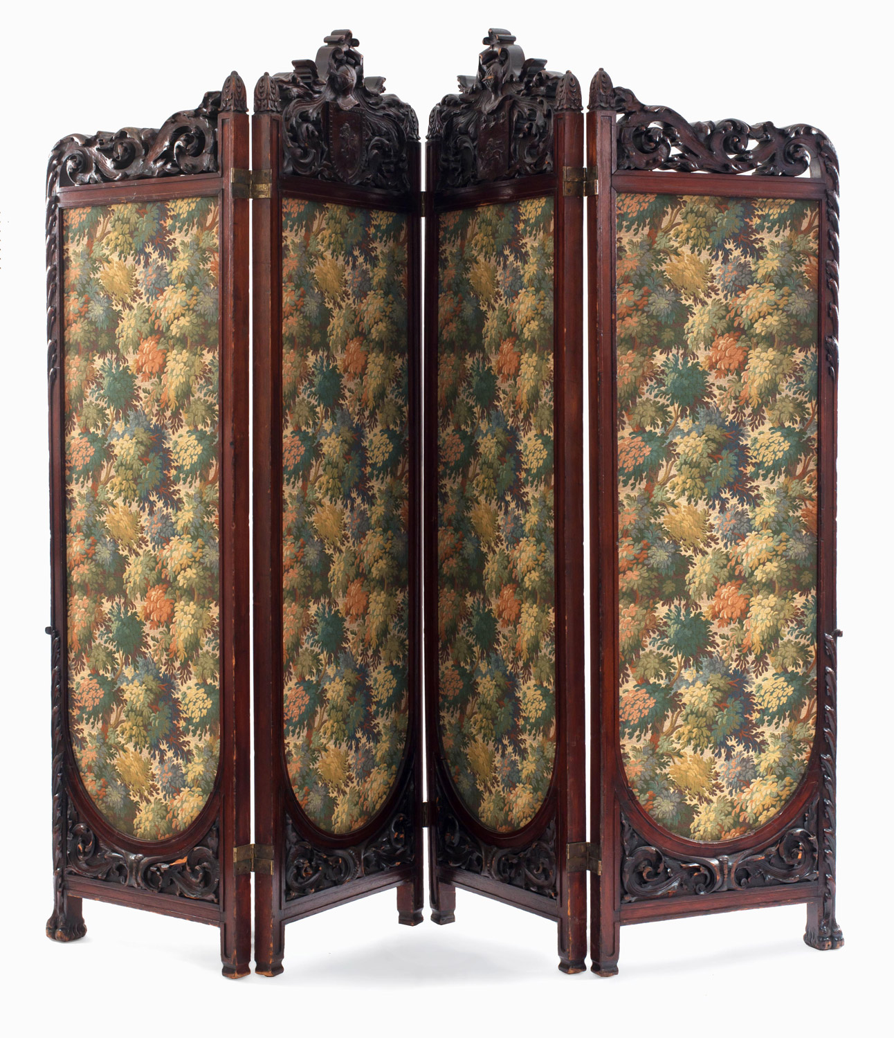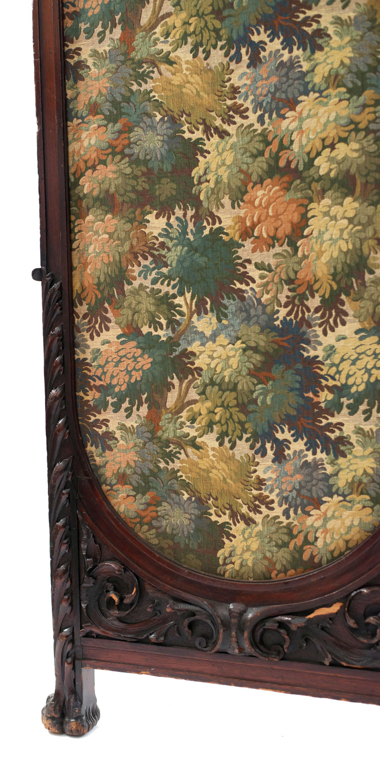 English Victorian mahogany 4-fold screen with heavy carved scroll filigree top and tapestry panels..