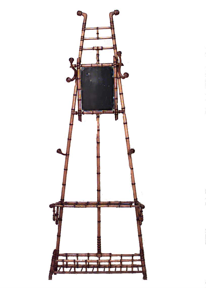 American Victorian maple faux bamboo easel shaped hatrack/umbrella stand with mirror.