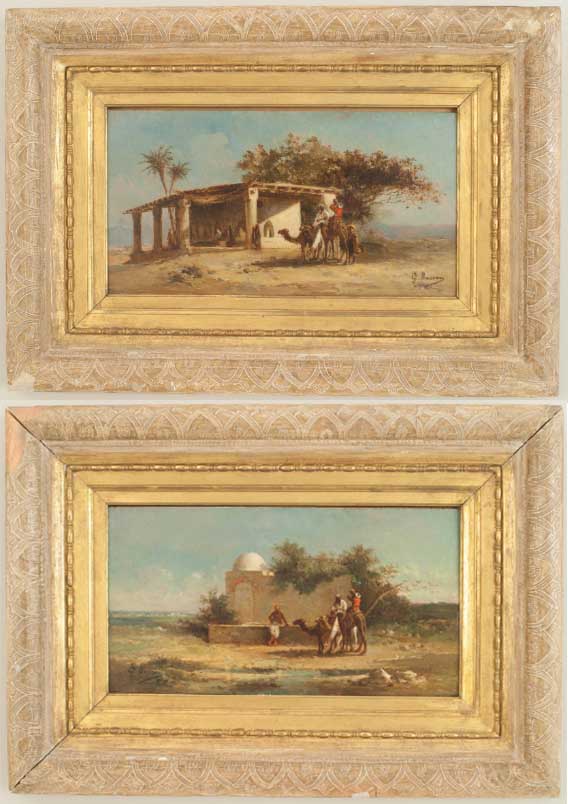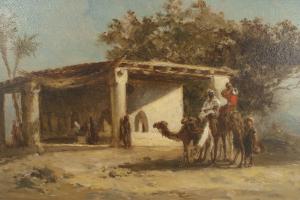 PAIR of French Victorian oil painting of a Middle Eastern scene with figures and camels standing next to a building (signed: G BUSSEN)
