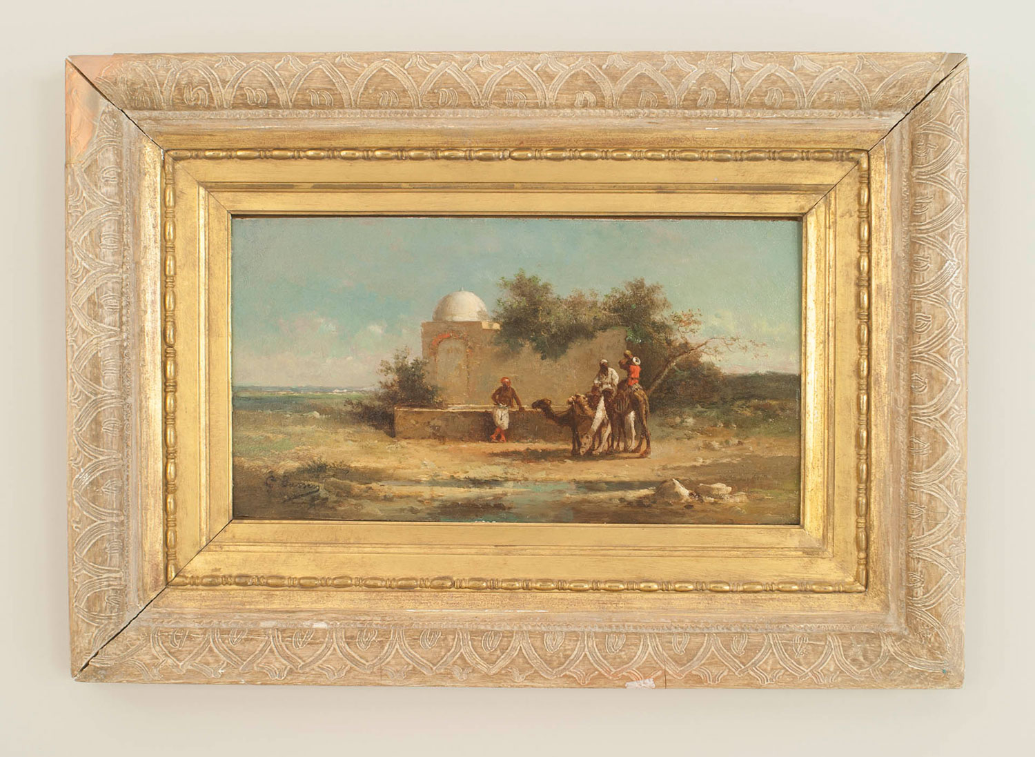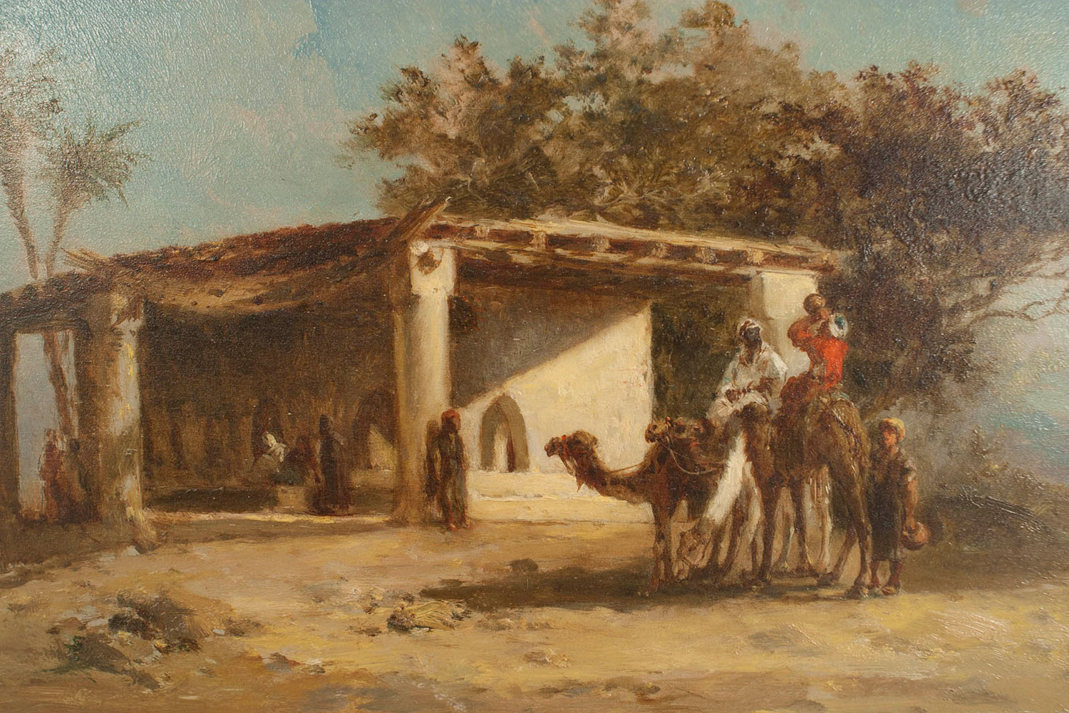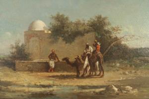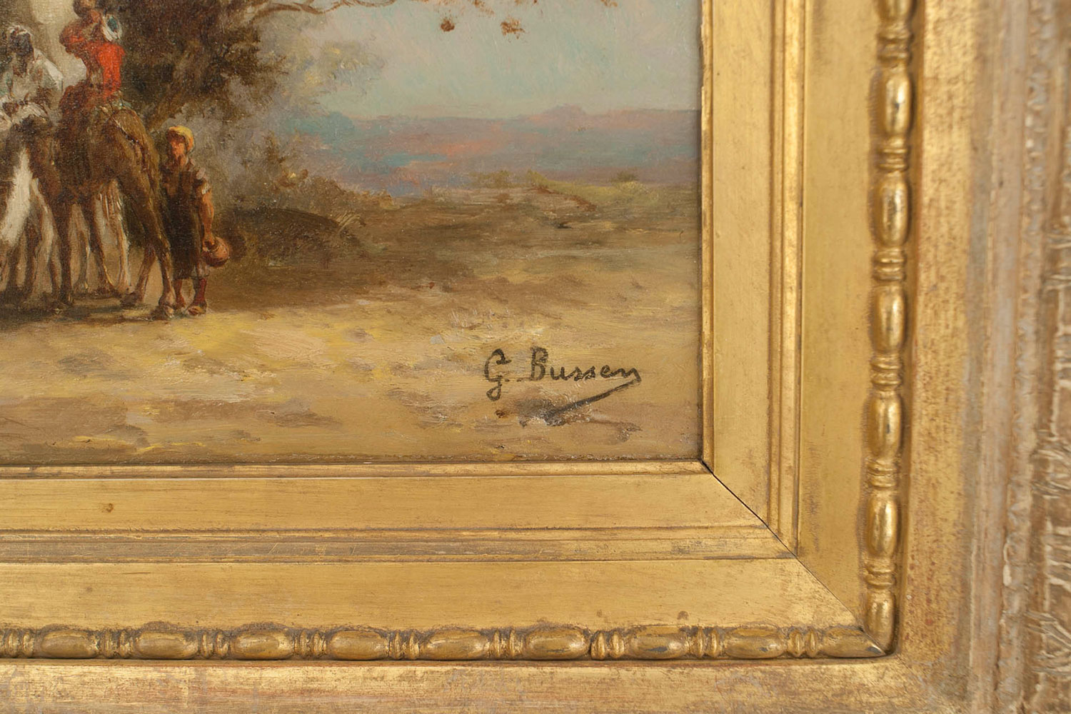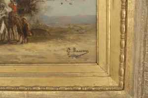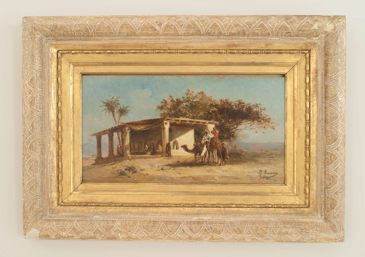 PAIR of French Victorian oil painting of a Middle Eastern scene with figures and camels standing next to a building (signed: G BUSSEN).