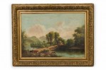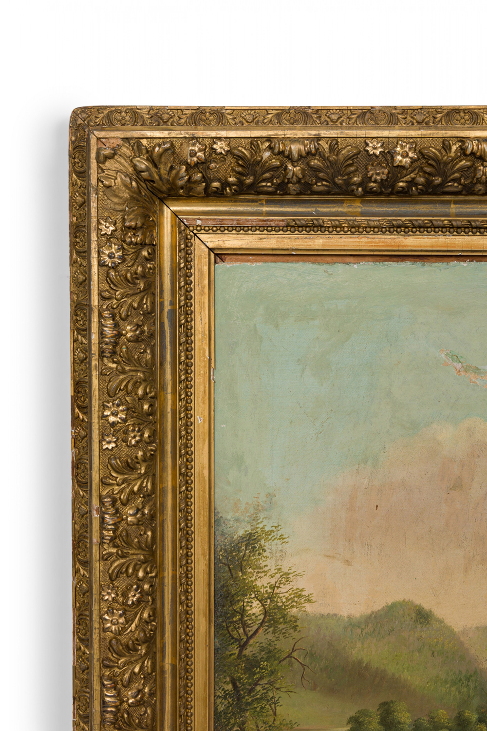 American Victorian carved gilt framed oil painting of man with 3 cows and dog by dirt road and bridge..