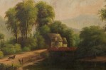 American Victorian carved gilt framed oil painting of man with 3 cows and dog by dirt road and bridge.