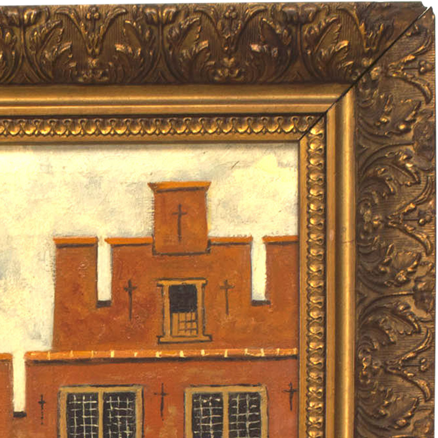 French Victorian gilt framed oil painting of architectural street scene with red building..