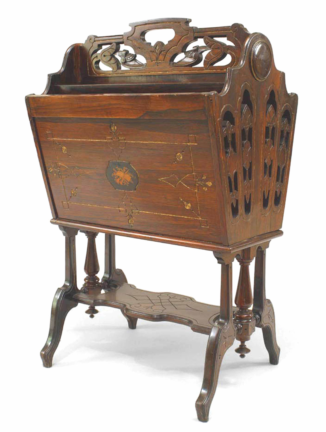 American Victorian (Eastlake style) rosewood magazine rack with ebonized & gilt trim and inlaid side panels with stretcher at base.