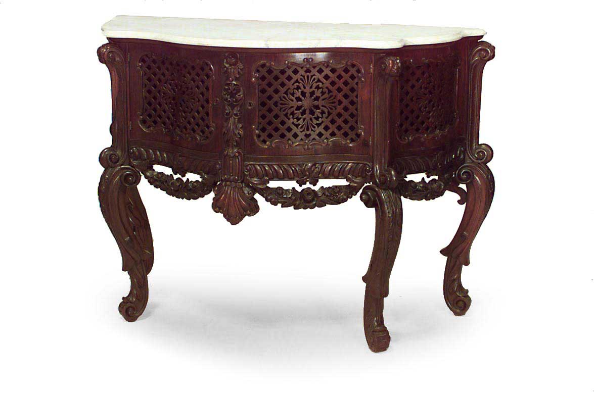 American Victorian rosewood and filigree 2 door sideboard cabinet with carved festons and serpentine shaped white marble top (Attributed to JOHN HENRY BELTER)