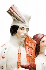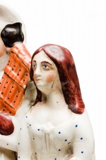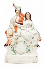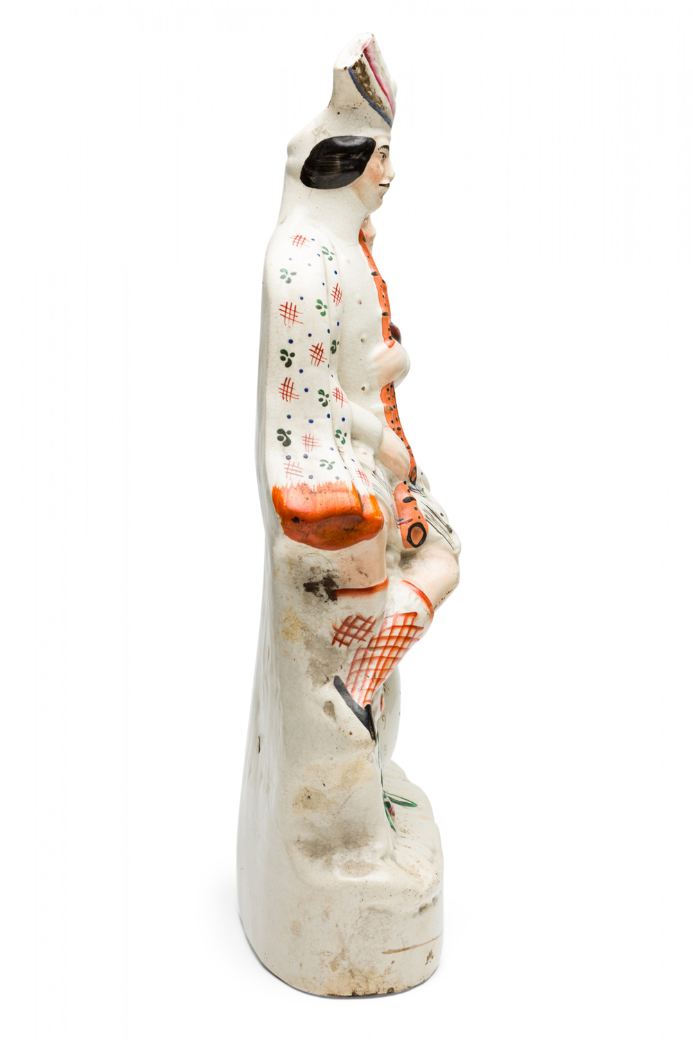 English Victorian Staffordshire porcelain group of seated lady and man with orange bagpipe