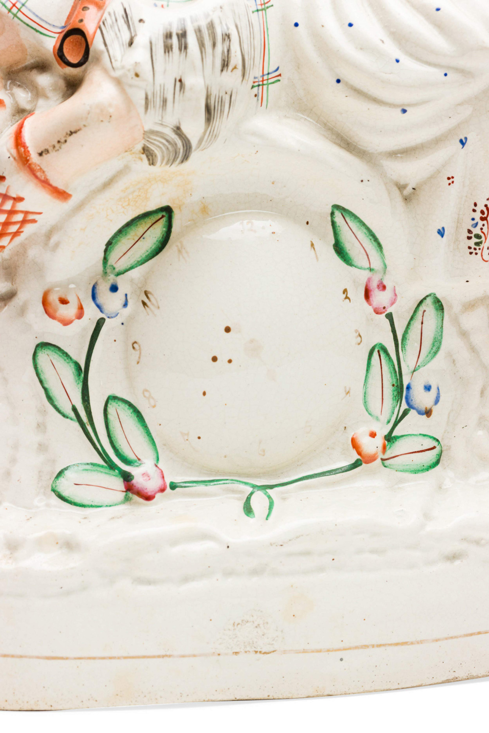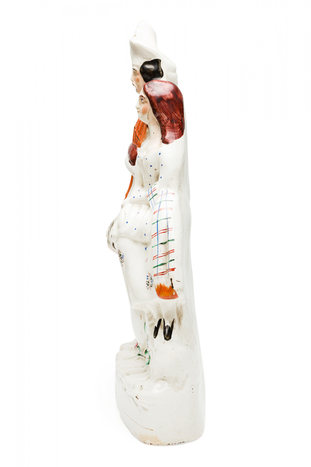 English Victorian Staffordshire porcelain group of seated lady and man with orange bagpipe.