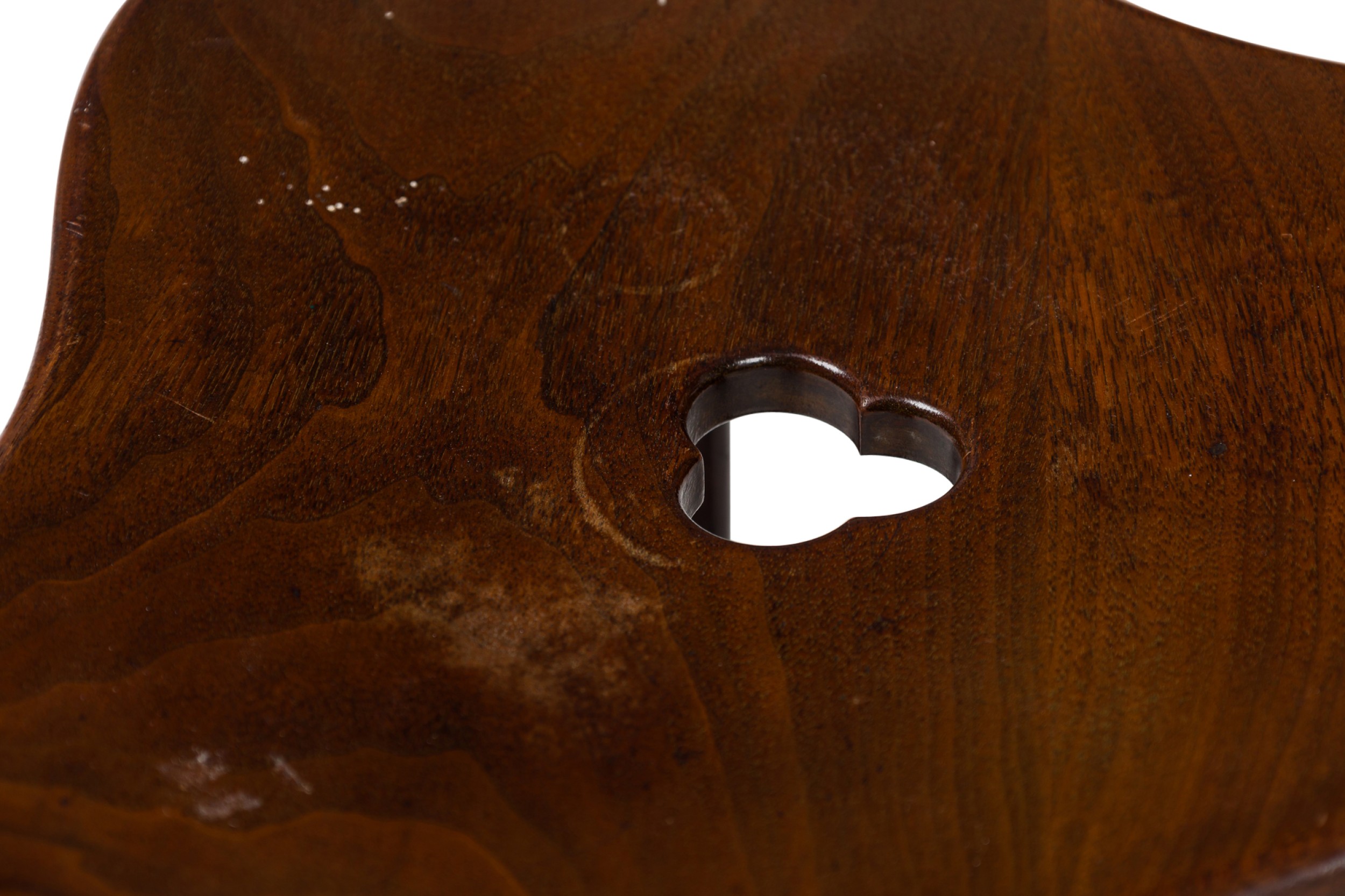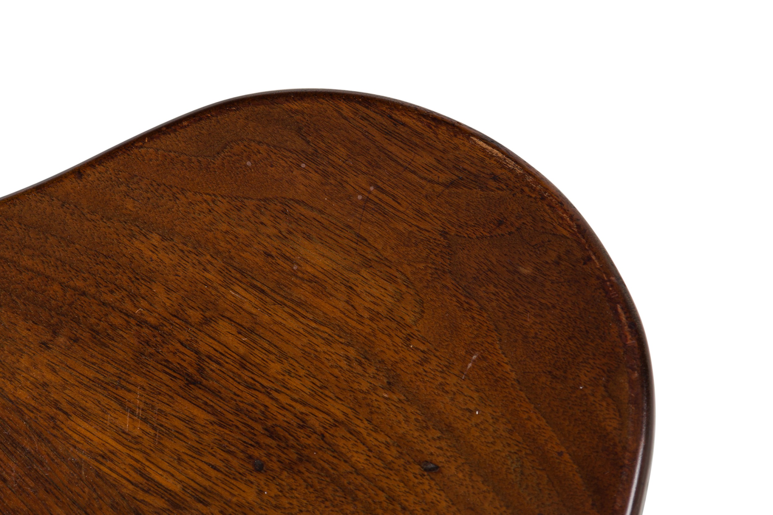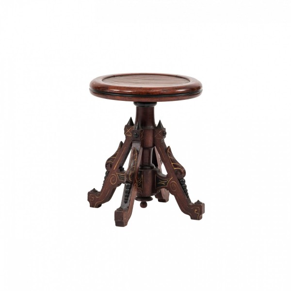 PAIR of Austrian Secessionist walnut stools in an Egyptian Thebes revivalist style while having a clover shaped seat atop a sabered tripod leg frame (PRICED AS PAIR) (AVAILABLE INDIVIDUALLY)