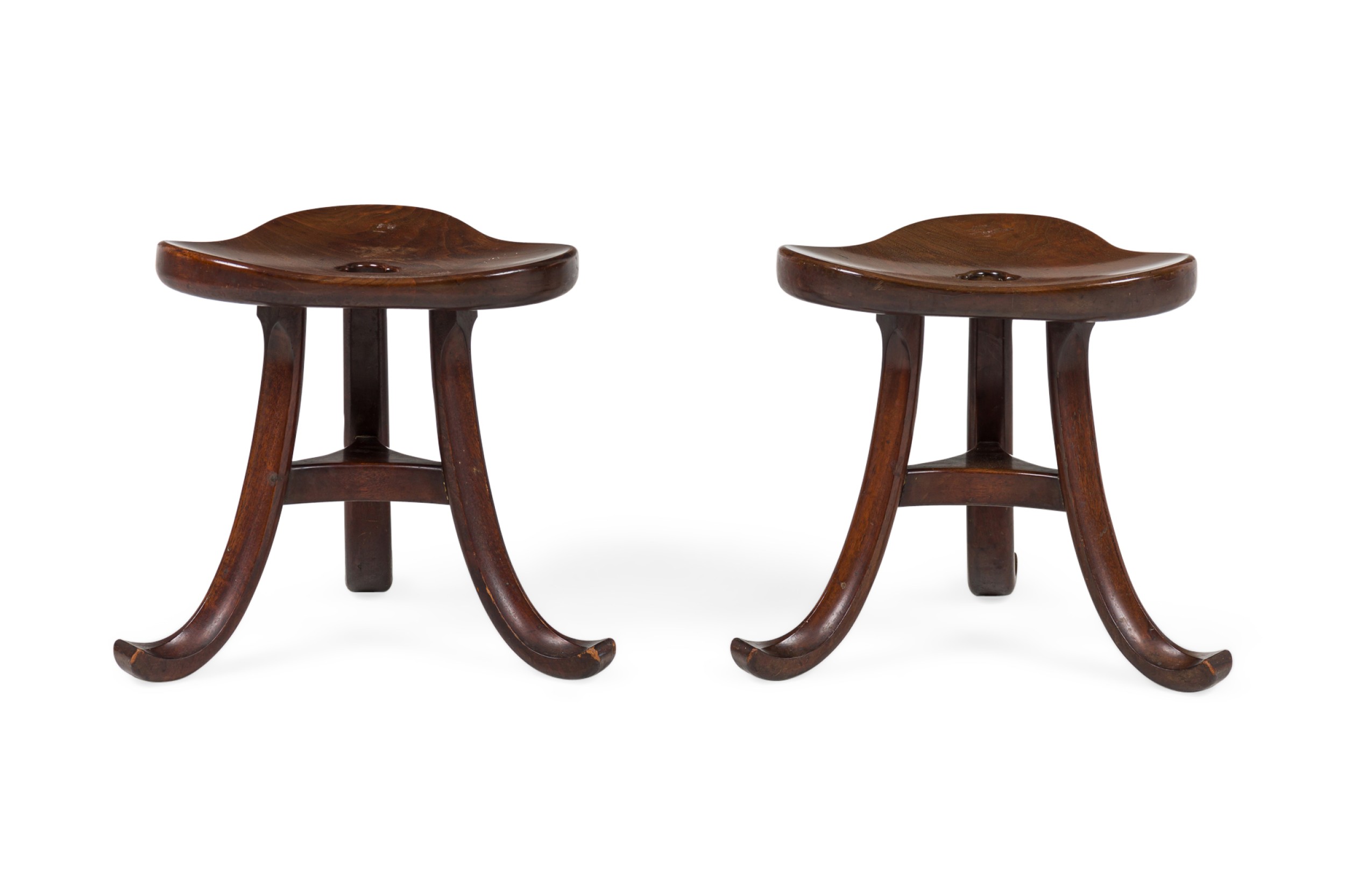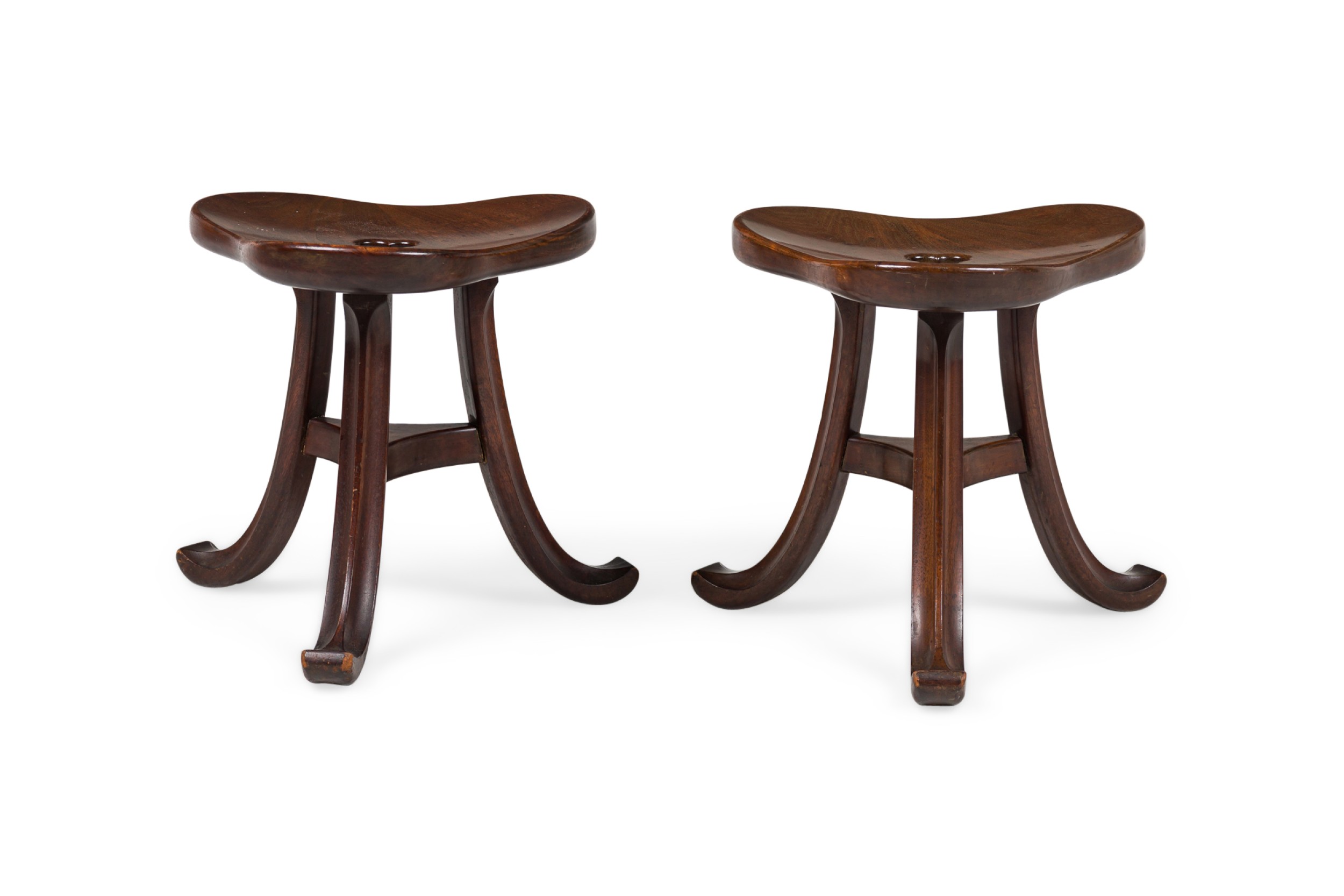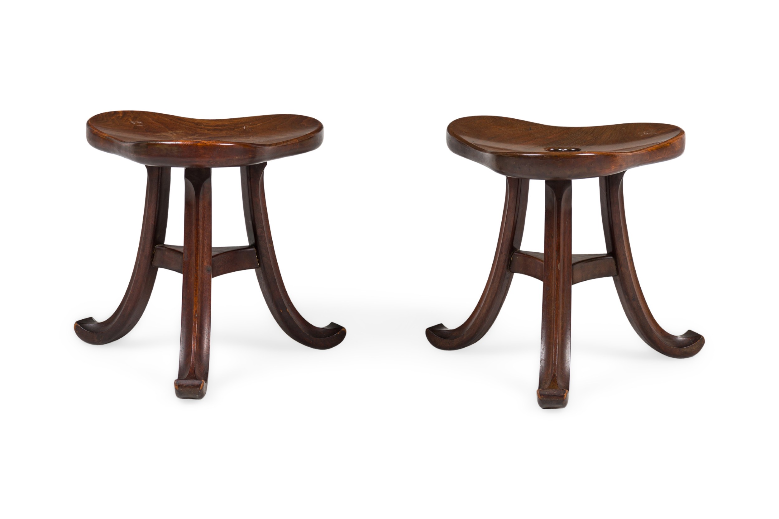 PAIR of Austrian Secessionist walnut stools in an Egyptian Thebes revivalist style while having a clover shaped seat atop a sabered tripod leg frame (PRICED AS PAIR) (AVAILABLE INDIVIDUALLY).