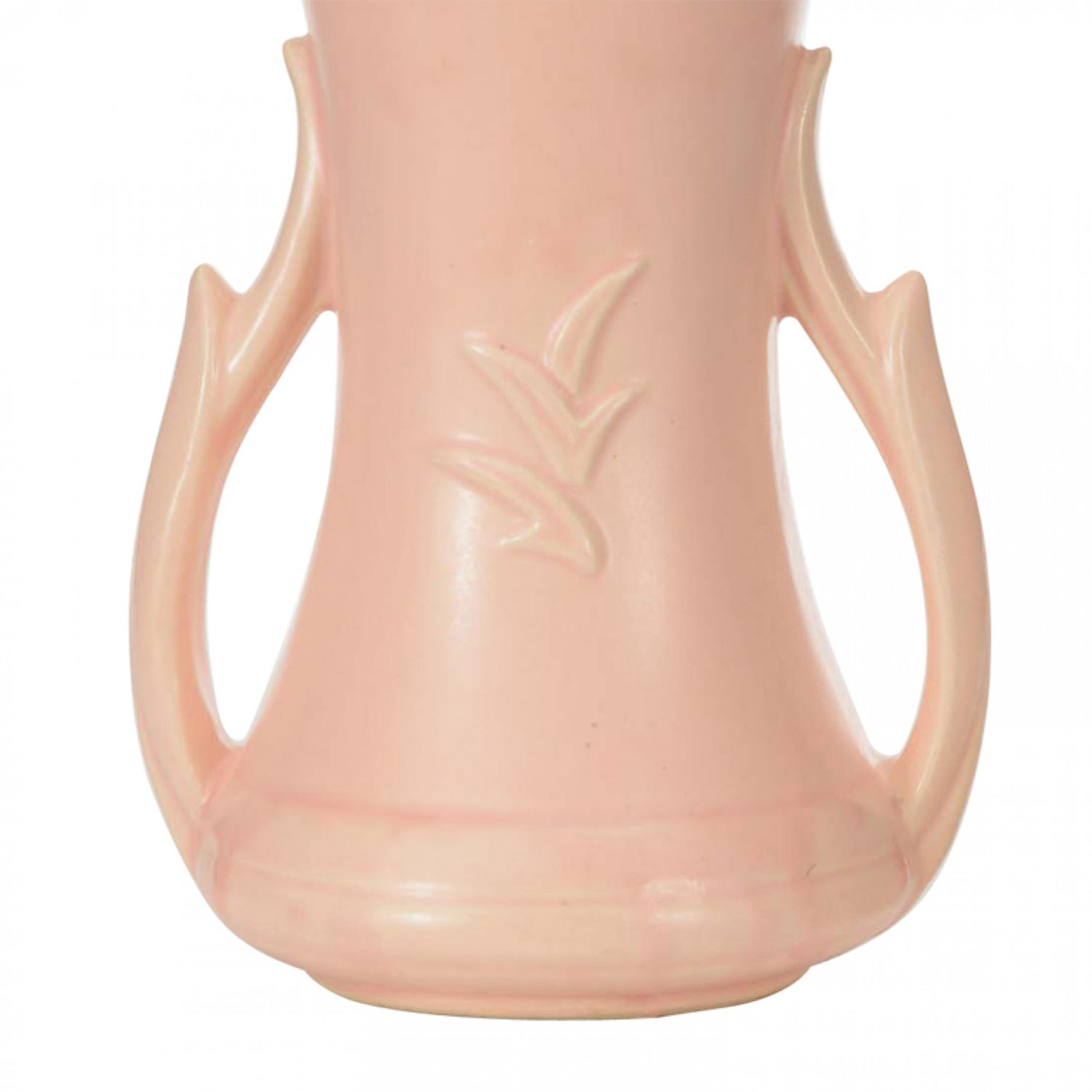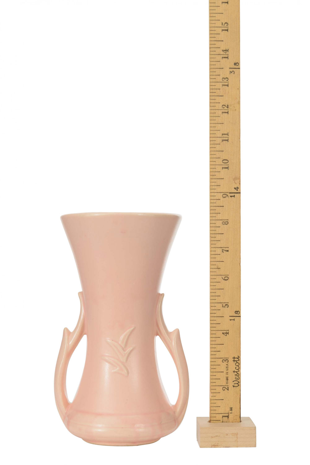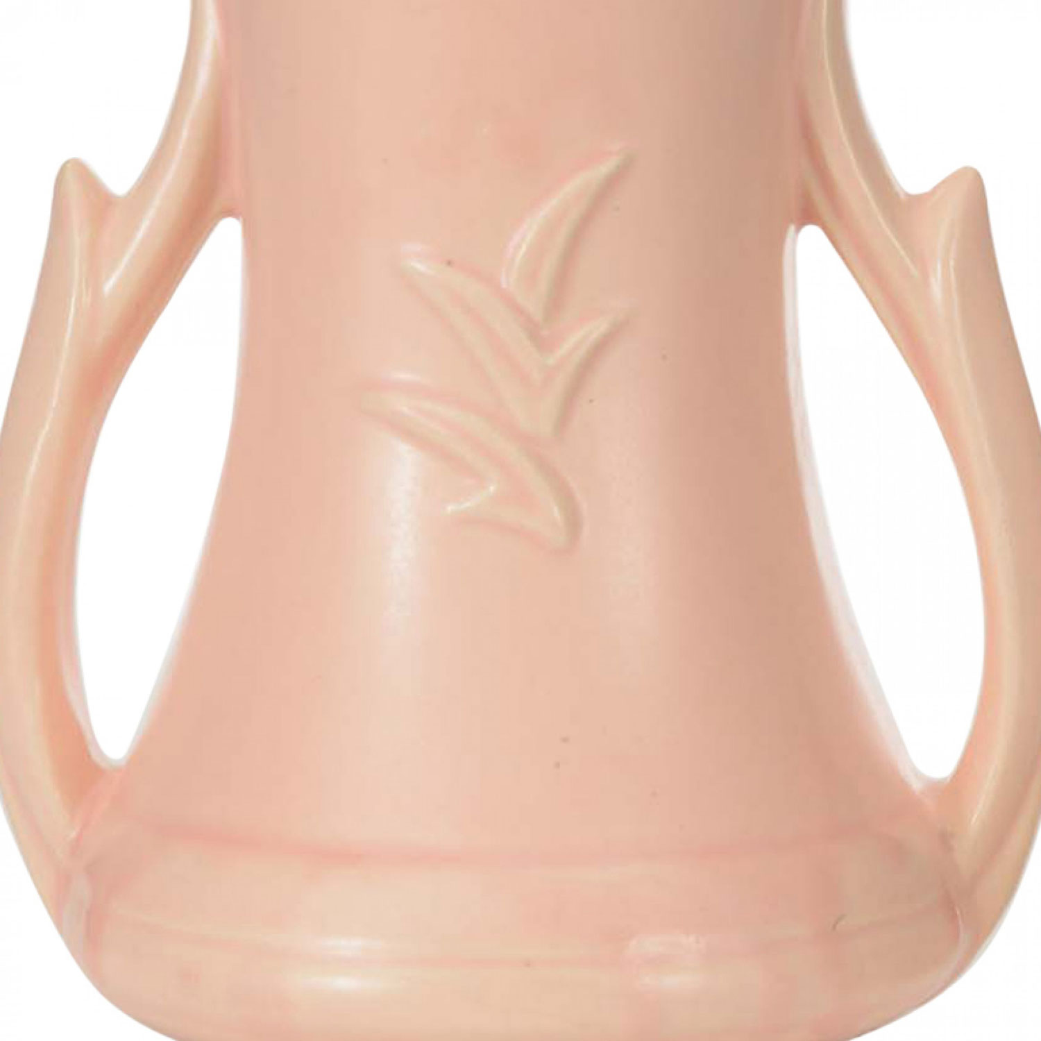 Vintage Art Deco style urn-shaped pink glazed ceramic vase with handles and raised leaf design.