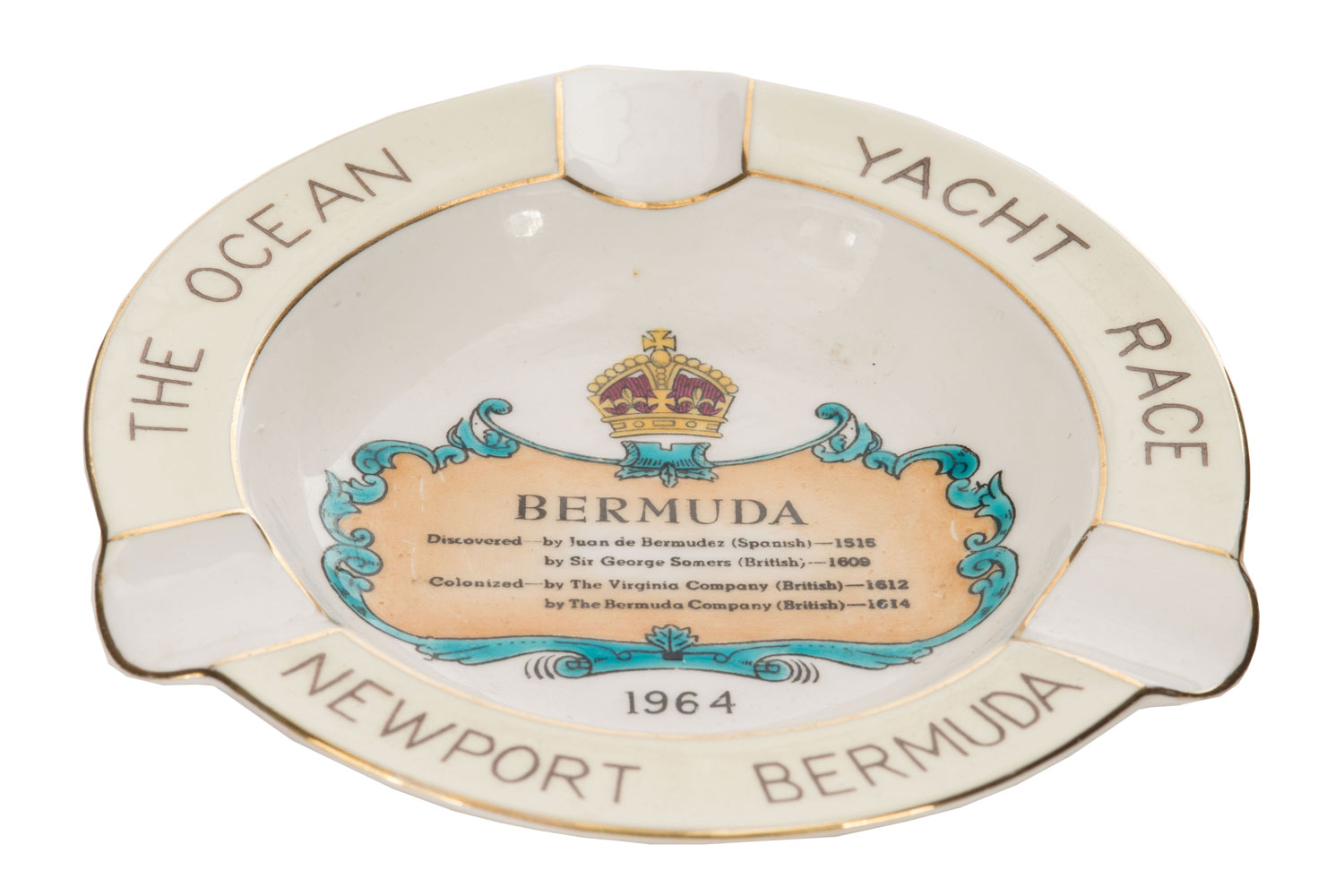 Vintage round glazed ceramic souvenir ashtray, the Ocean Yacht Race, Newport, Bermuda 1964