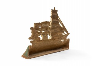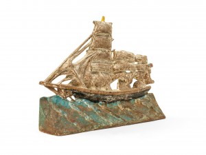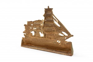 Vintage turquoise and white painted cast iron sailing / clipper ship relief door stop sculpture