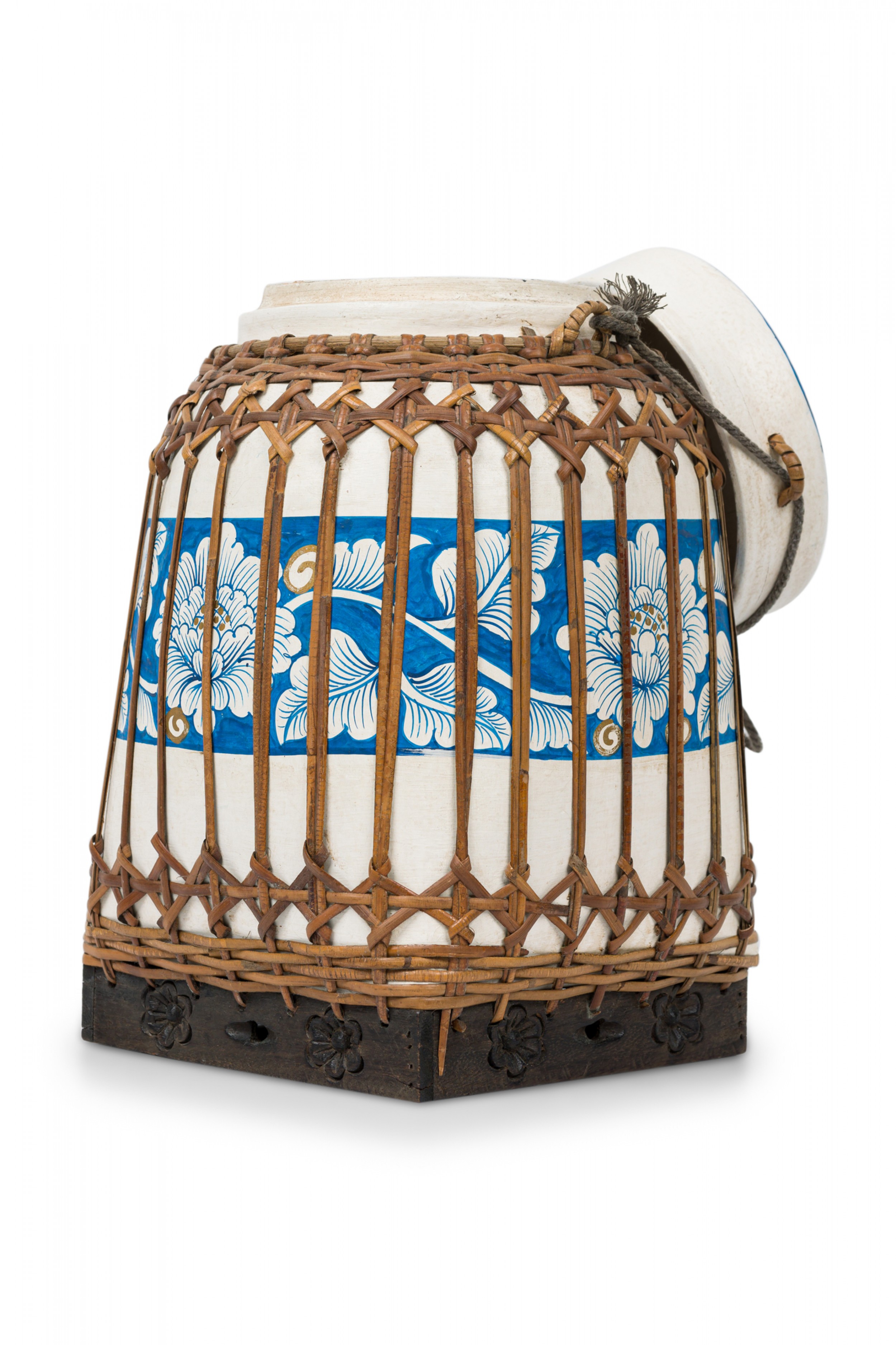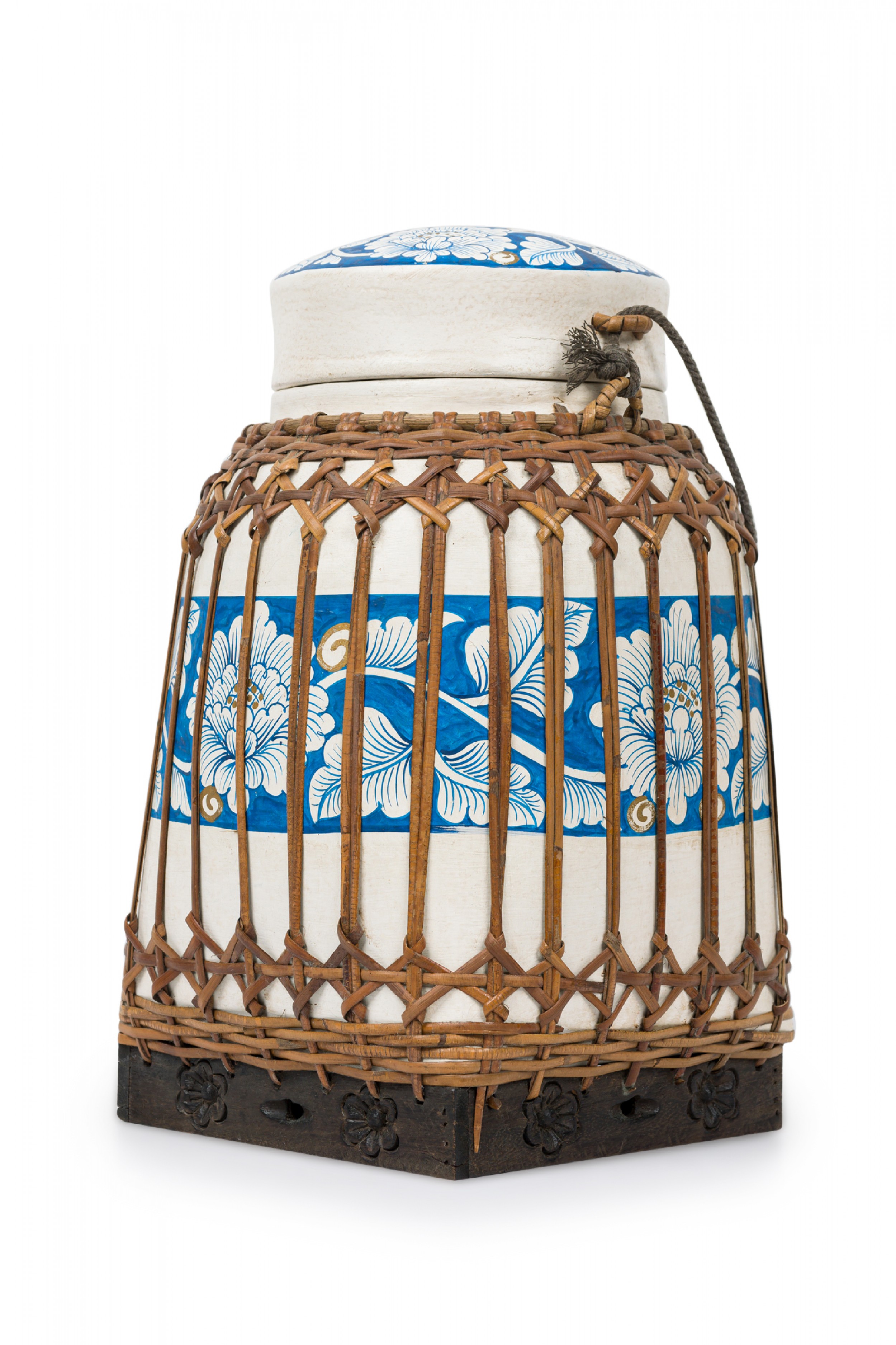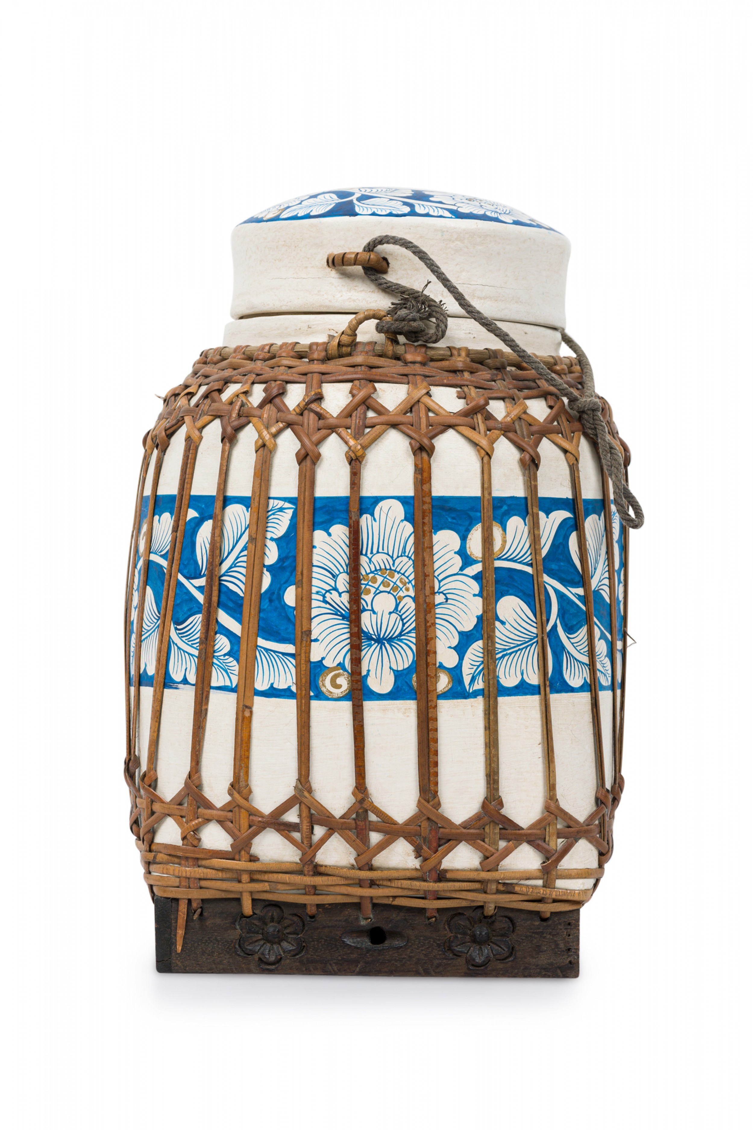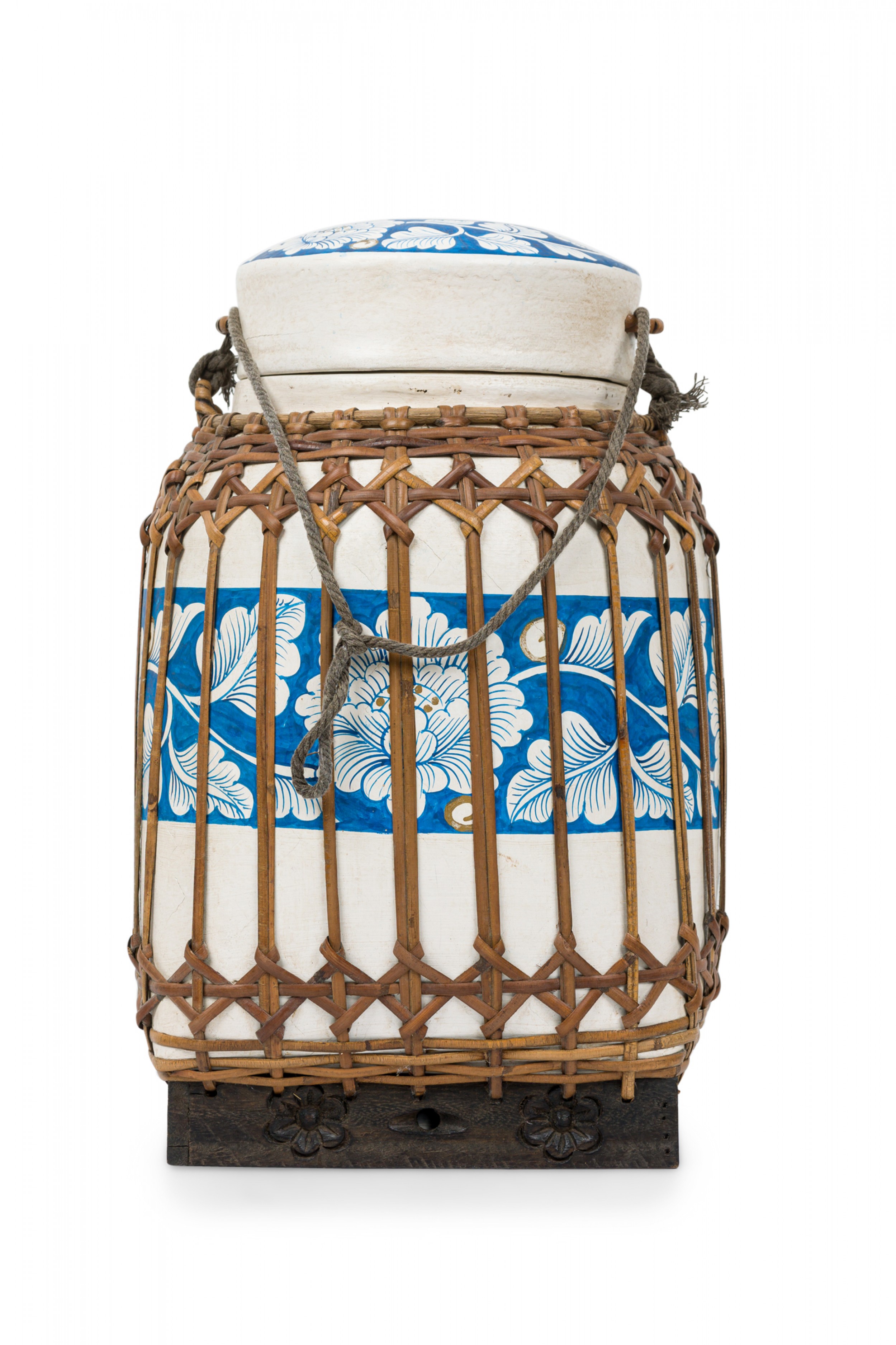Vintage Chinese papier-mache vessel painted white with a blue and white floral band around the center and top, wrapped in wicker rattan weave, resting on a carved wooden base.
