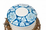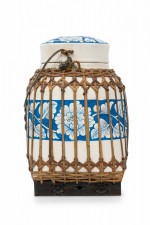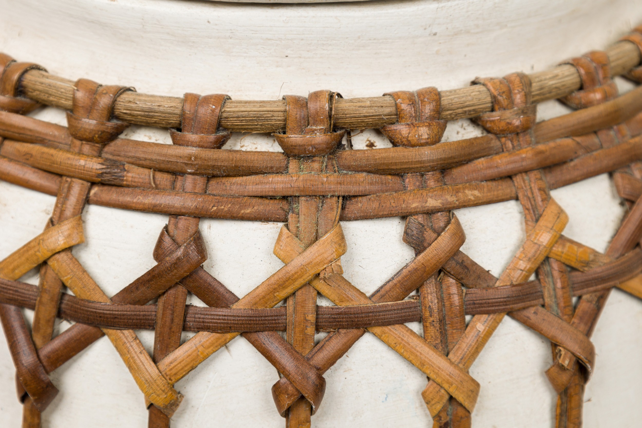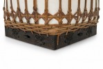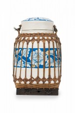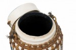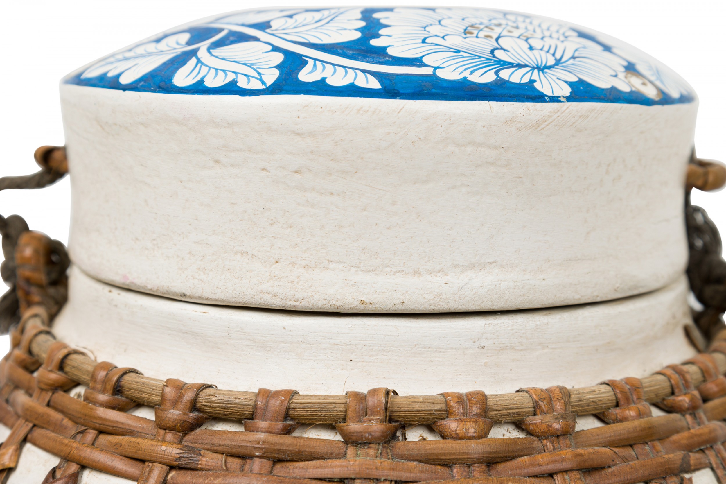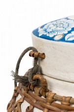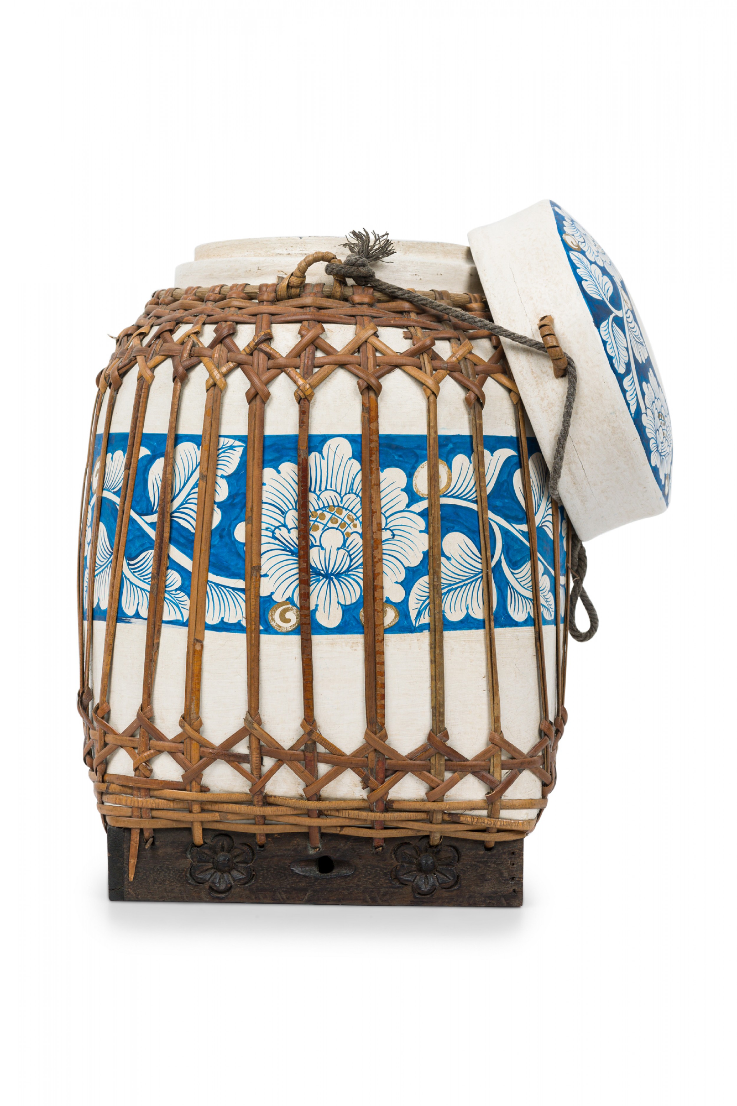Vintage Chinese papier-mache vessel painted white with a blue and white floral band around the center and top, wrapped in wicker rattan weave, resting on a carved wooden base.