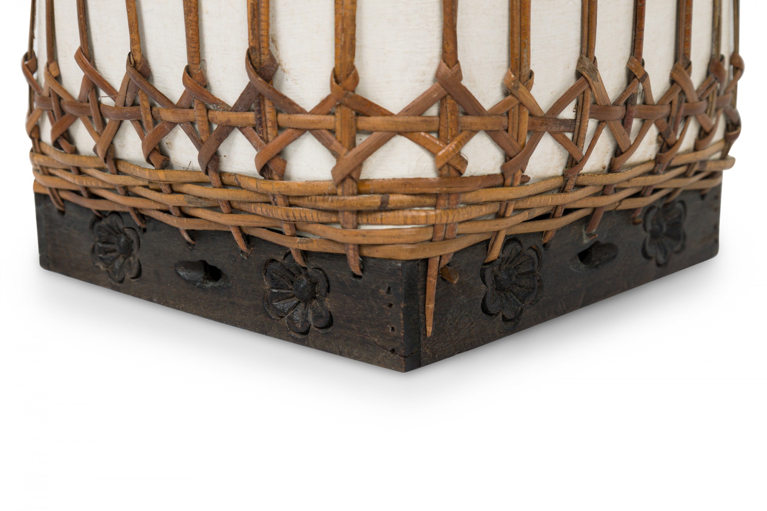 Vintage Chinese papier-mache vessel painted white with a blue and white floral band around the center and top, wrapped in wicker rattan weave, resting on a carved wooden base..