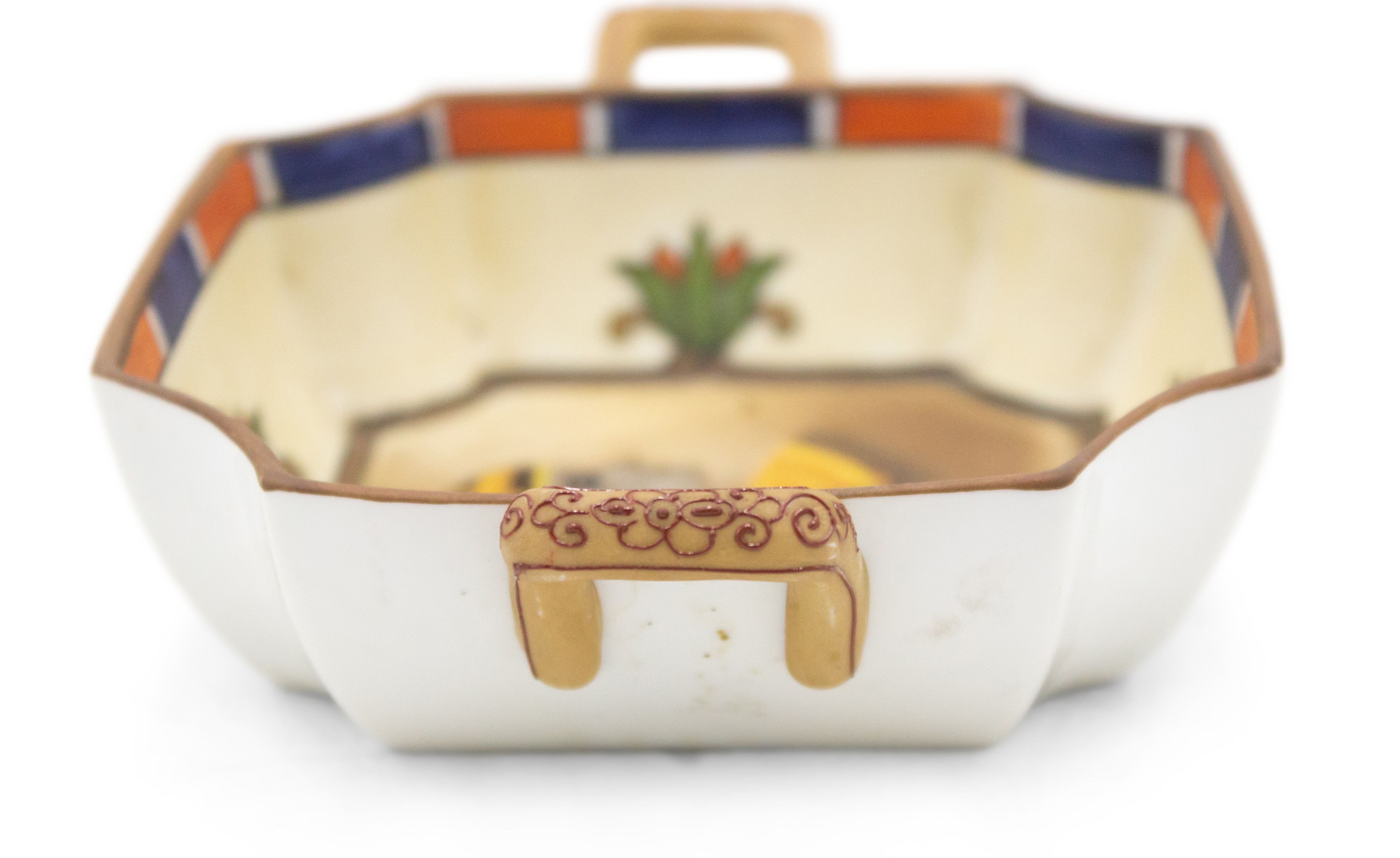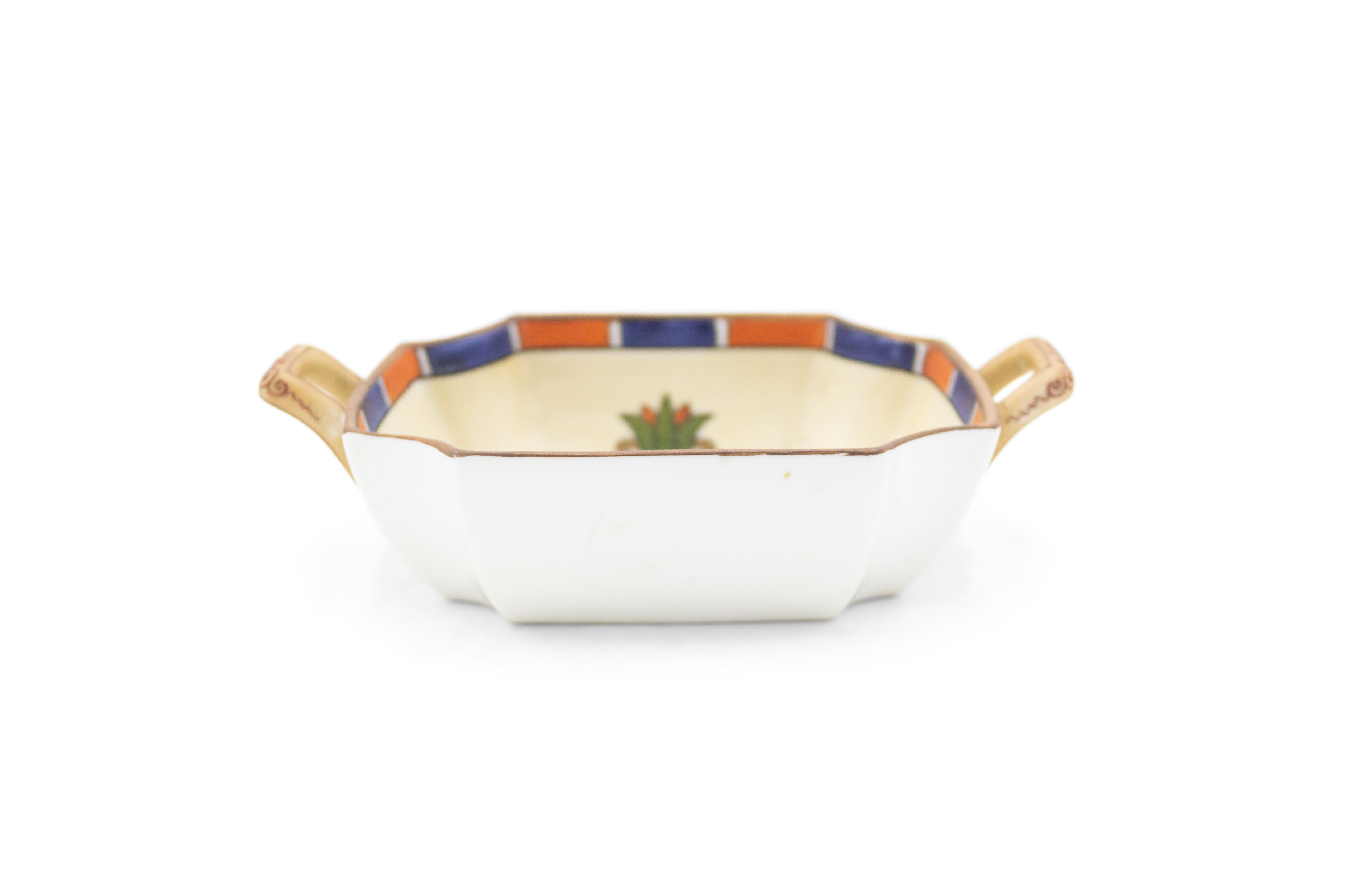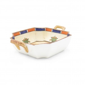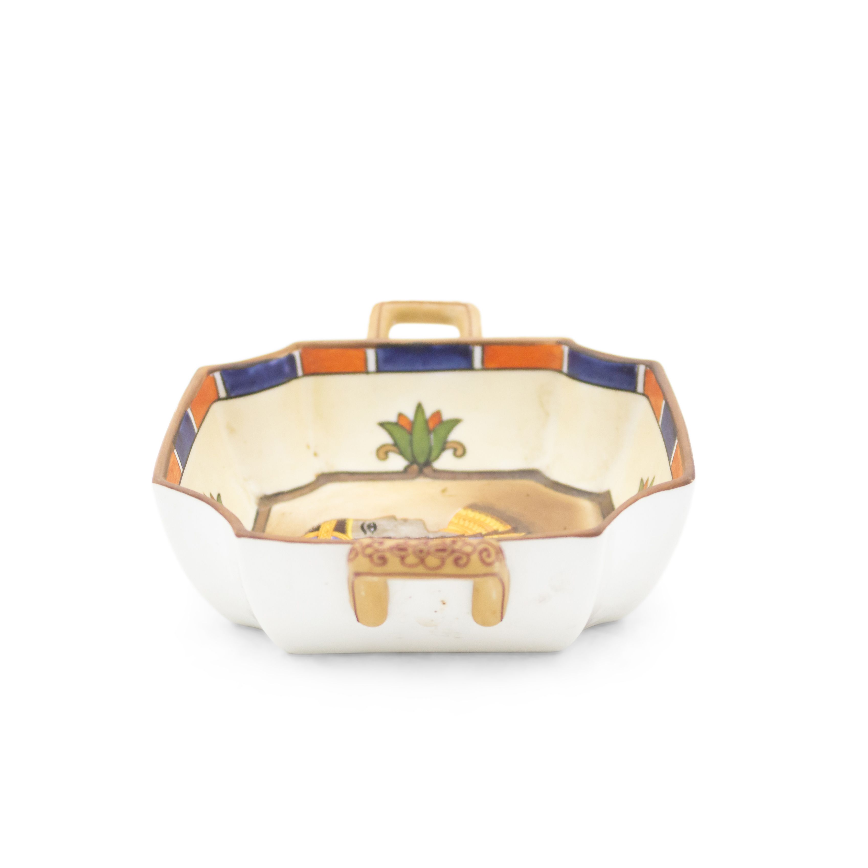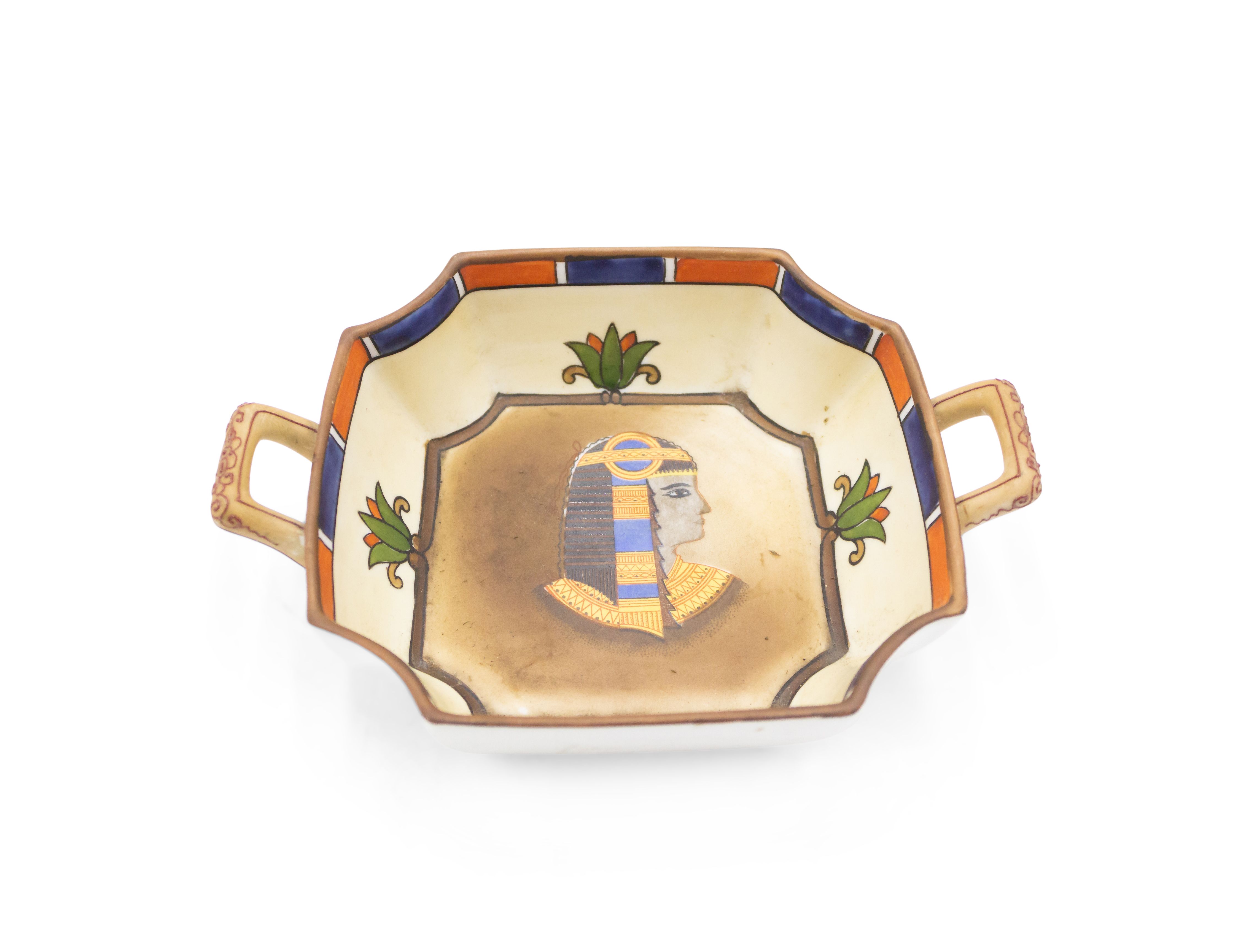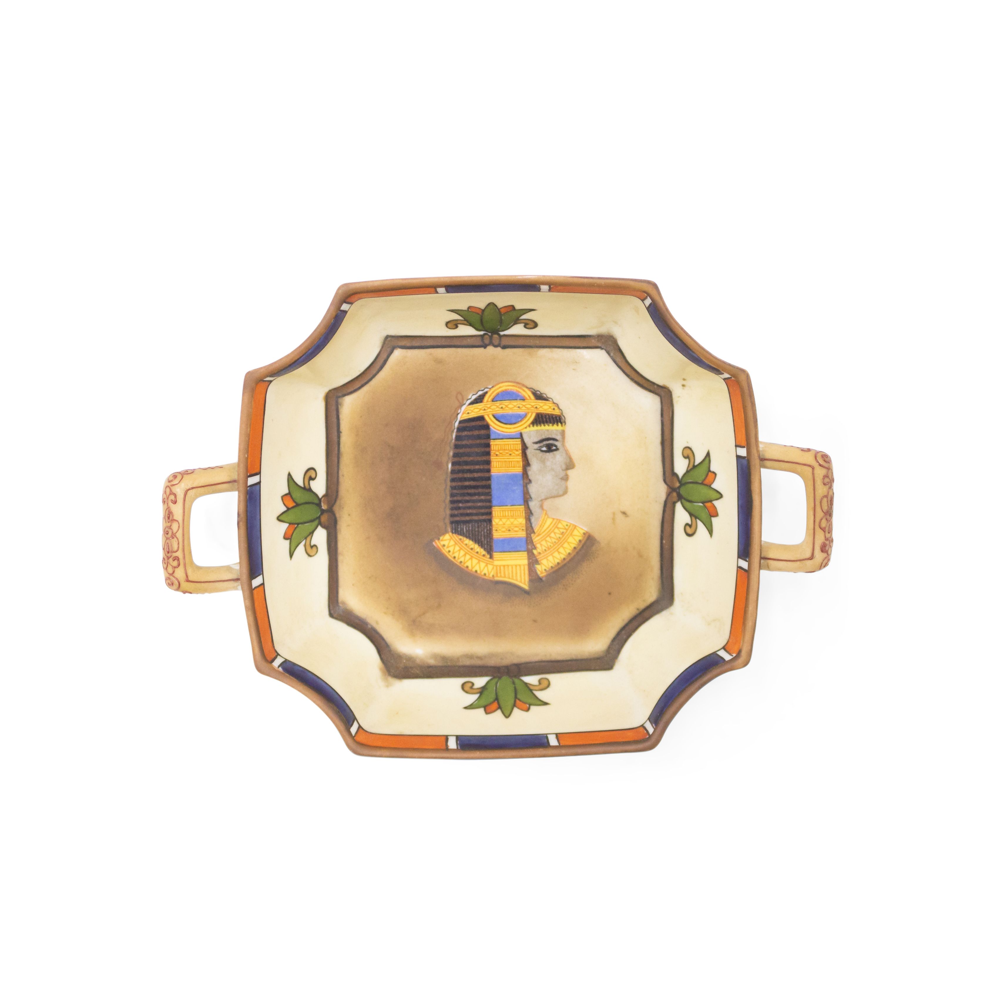 Middle Eastern Egyptian-style (1930s) porcelain square ashtray with small gilt handles and classic bust in center (NIPPON).