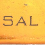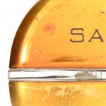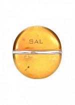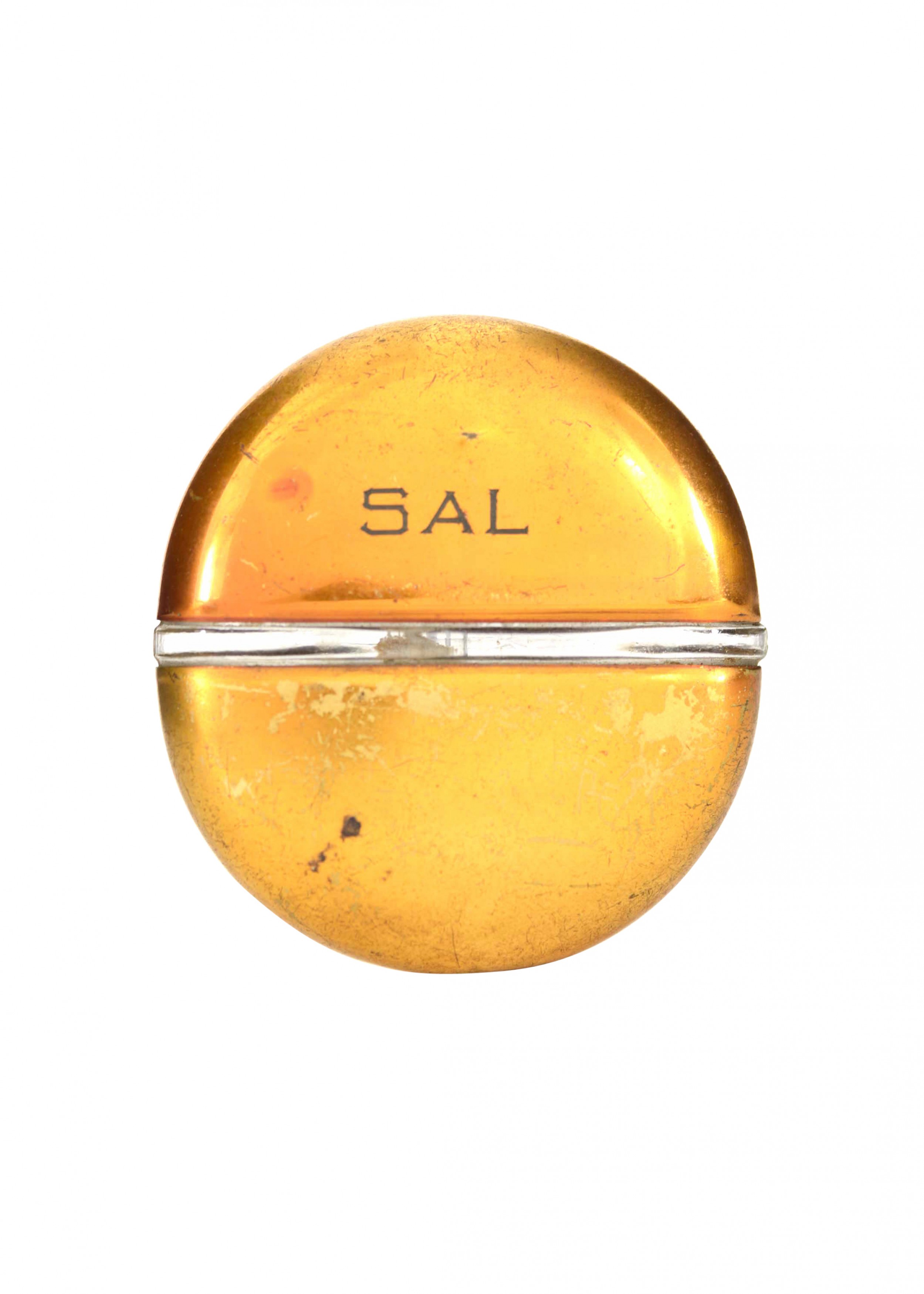 Vintage English small disc-shaped gilded brass and glass perfume bottle (by MARY DUNHILL) monogrammed "SAL".