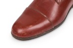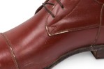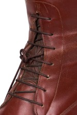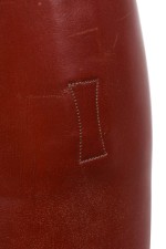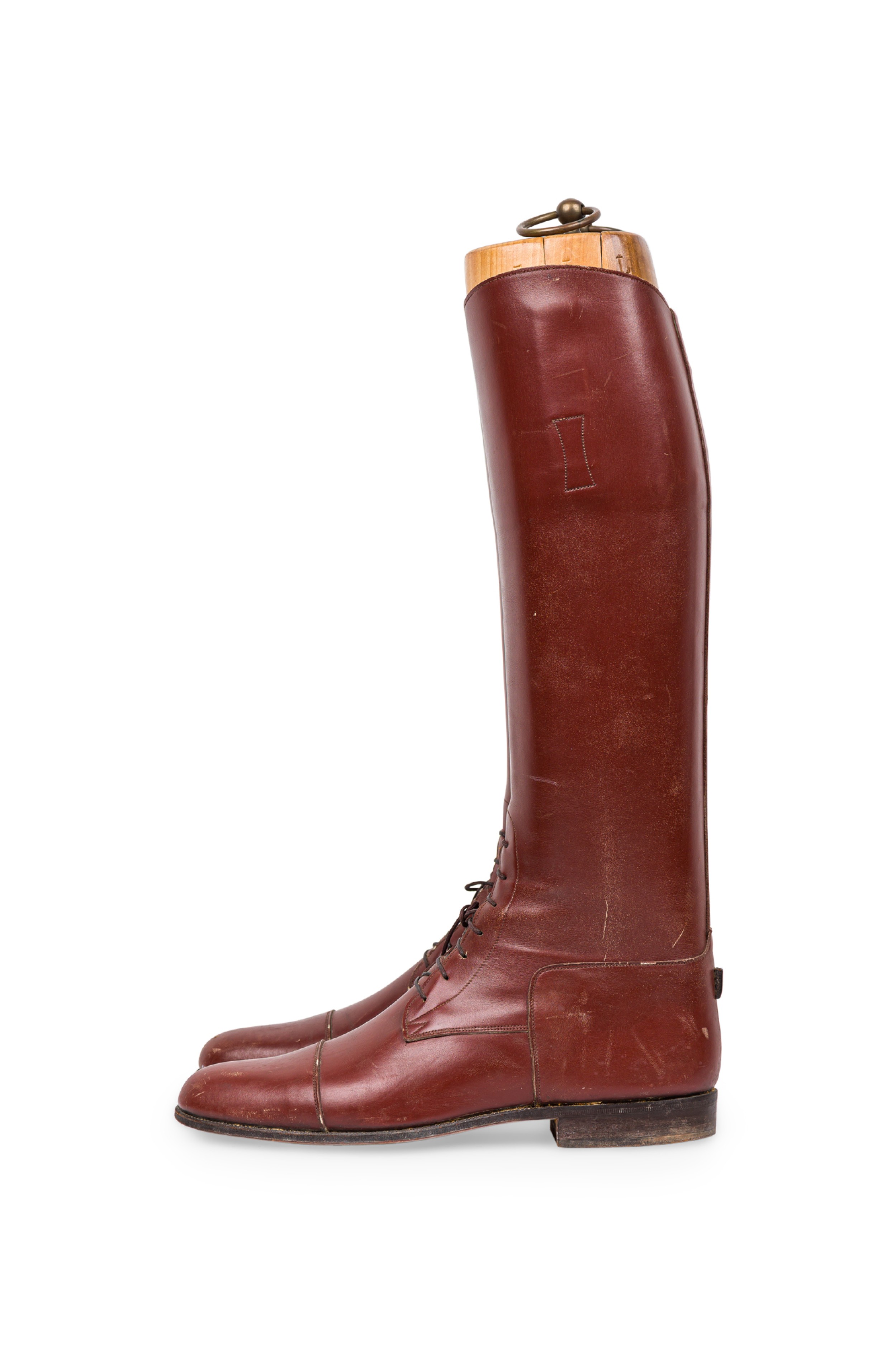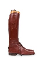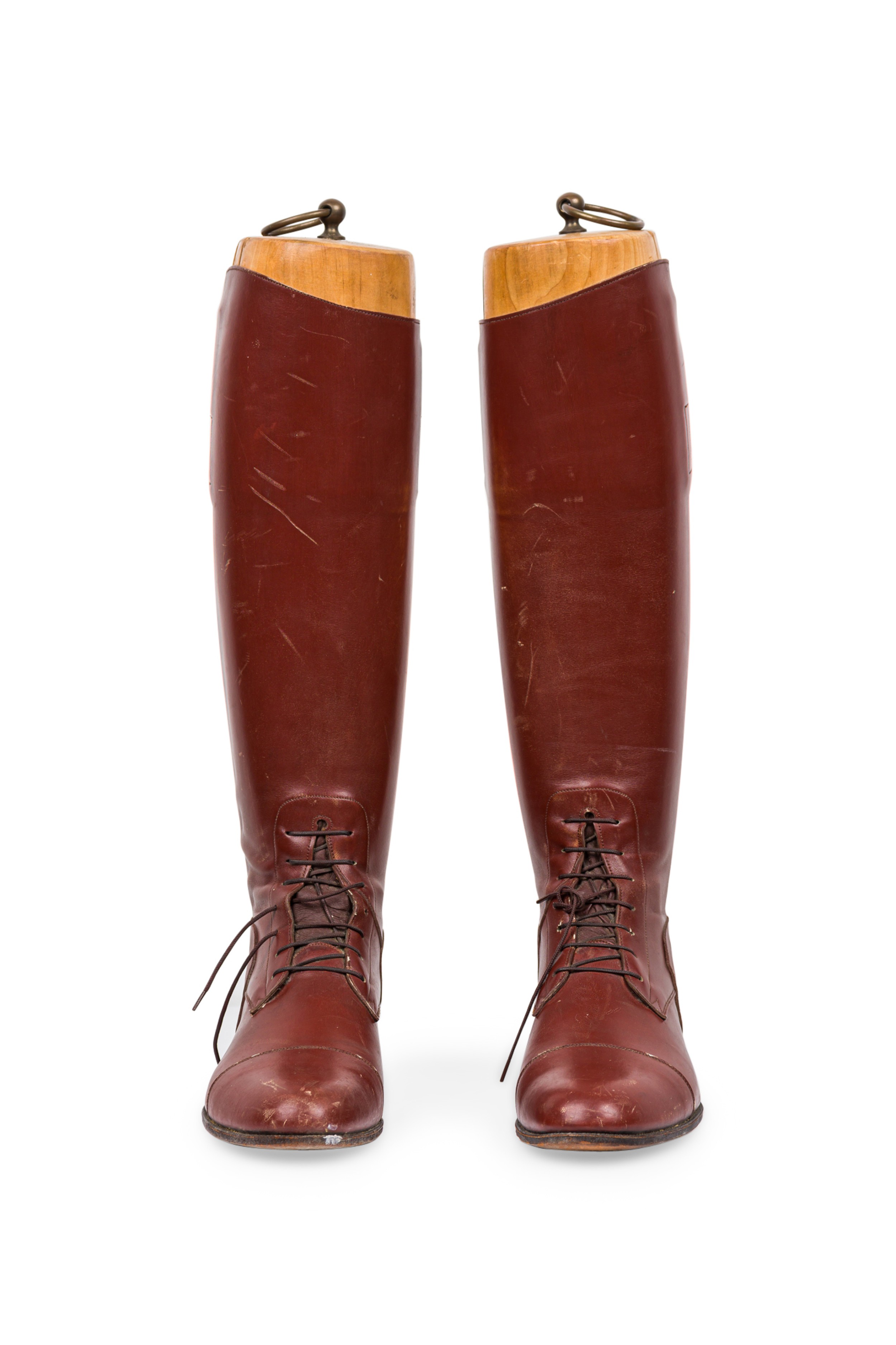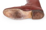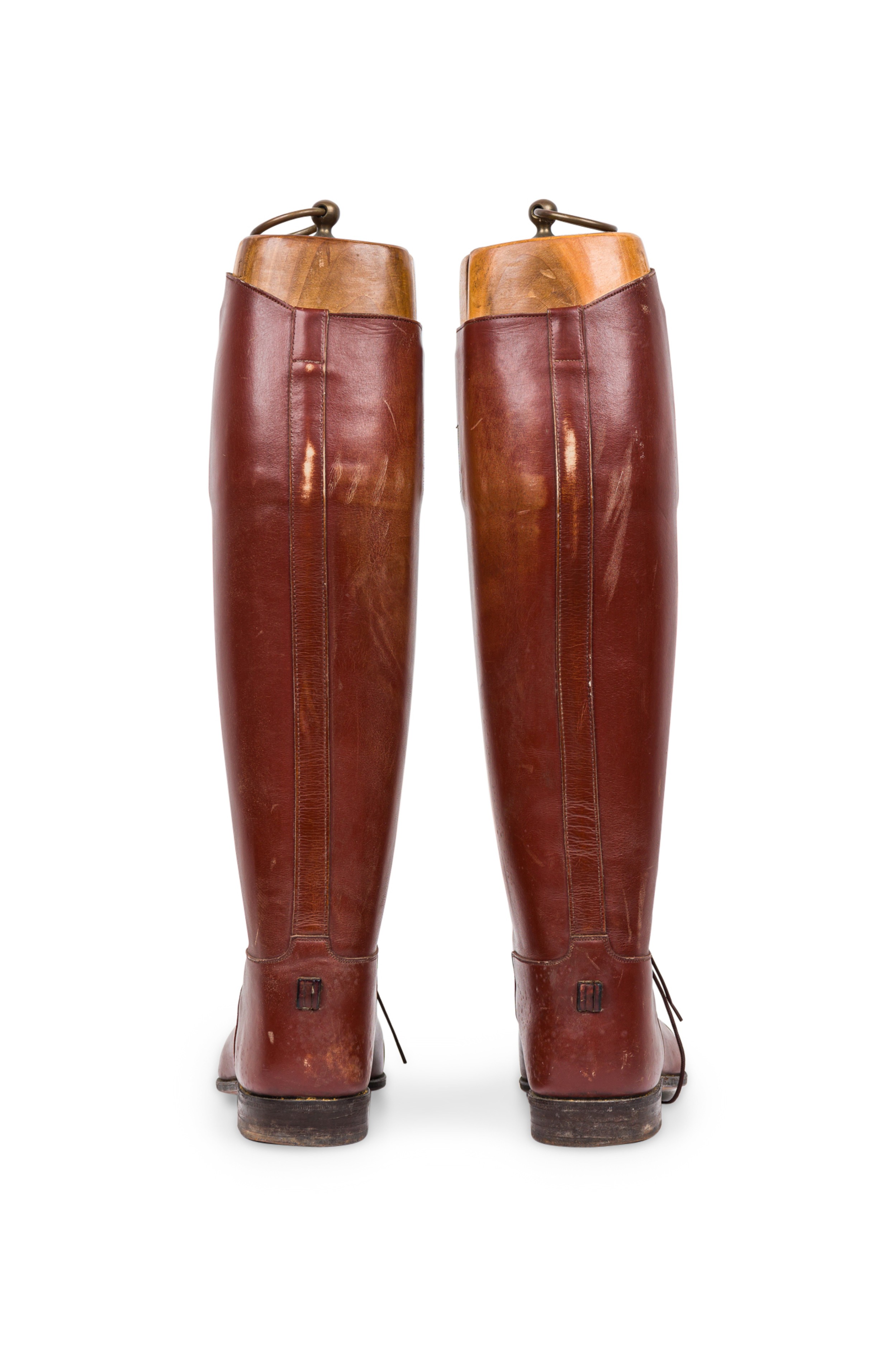 Pair of English Victorian style brown leather equestrian riding boots with wooden stretcher trees and a brass ring pull