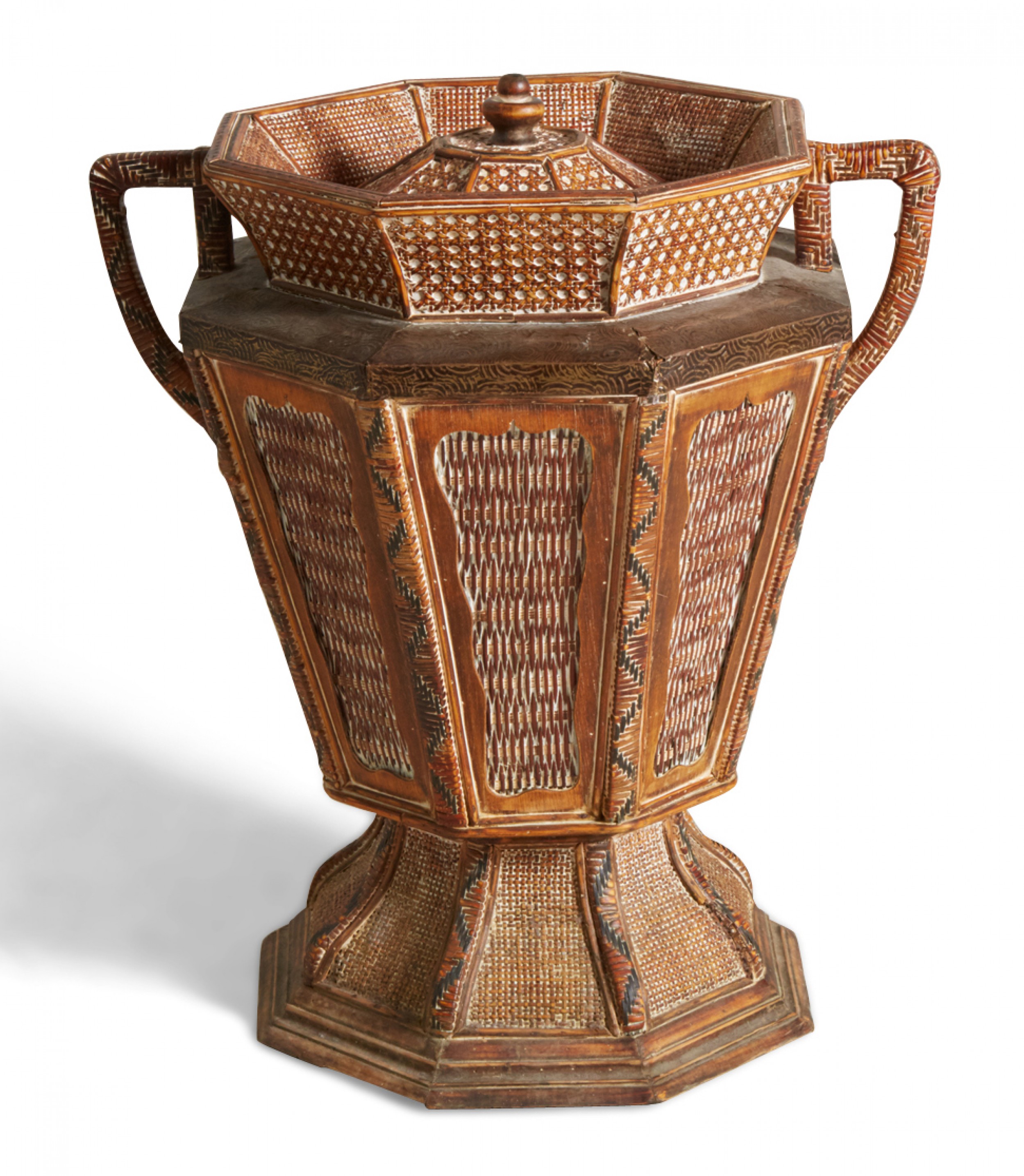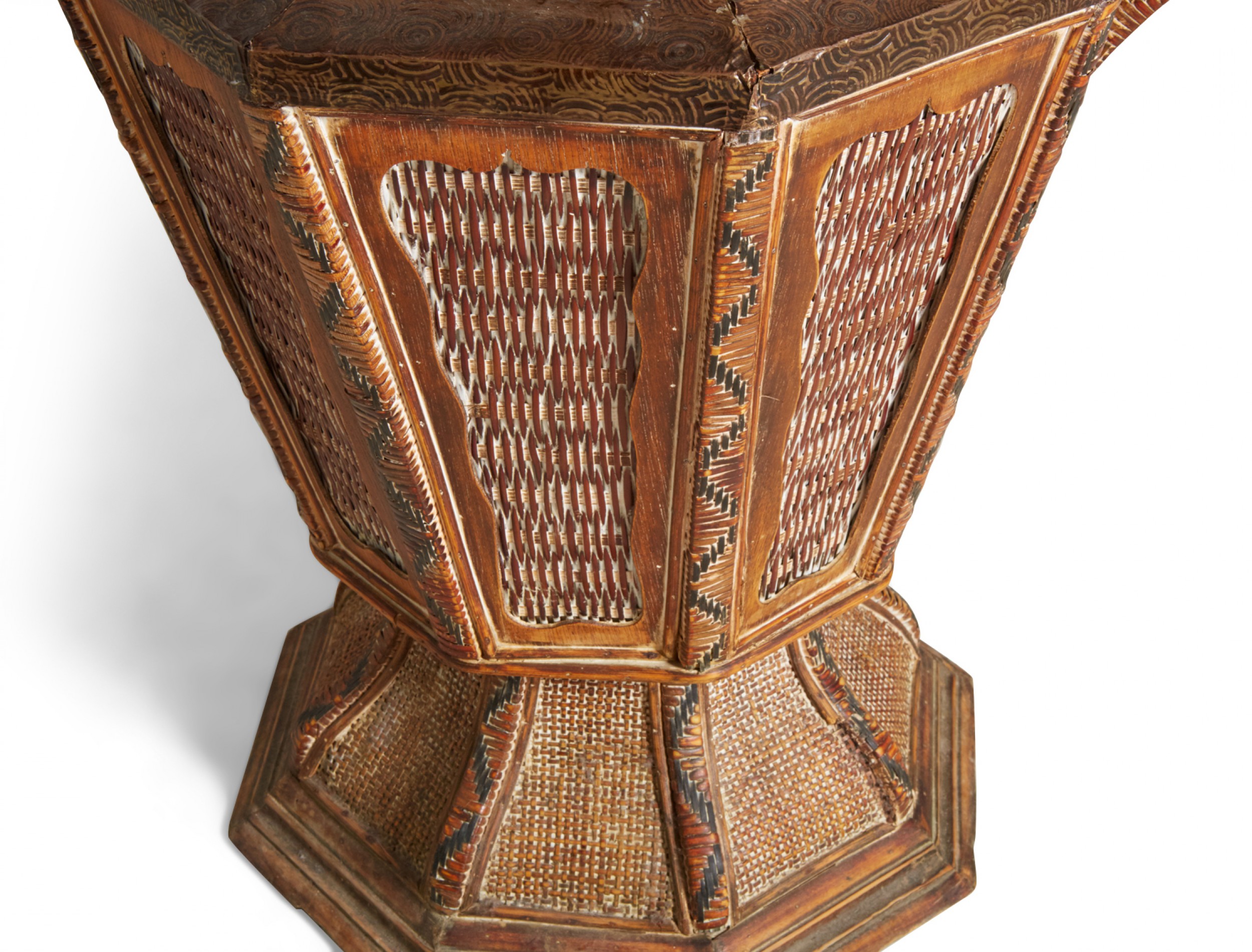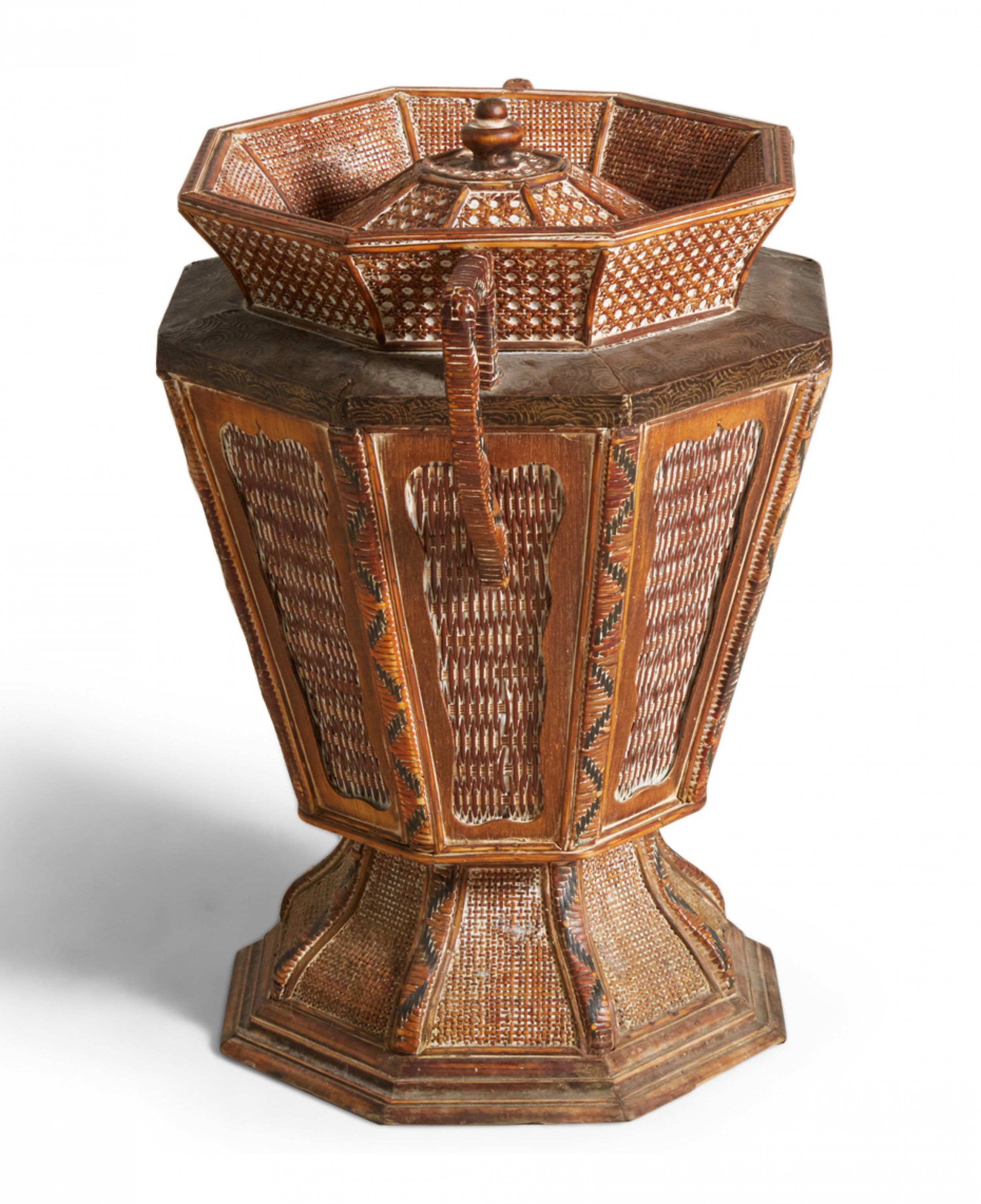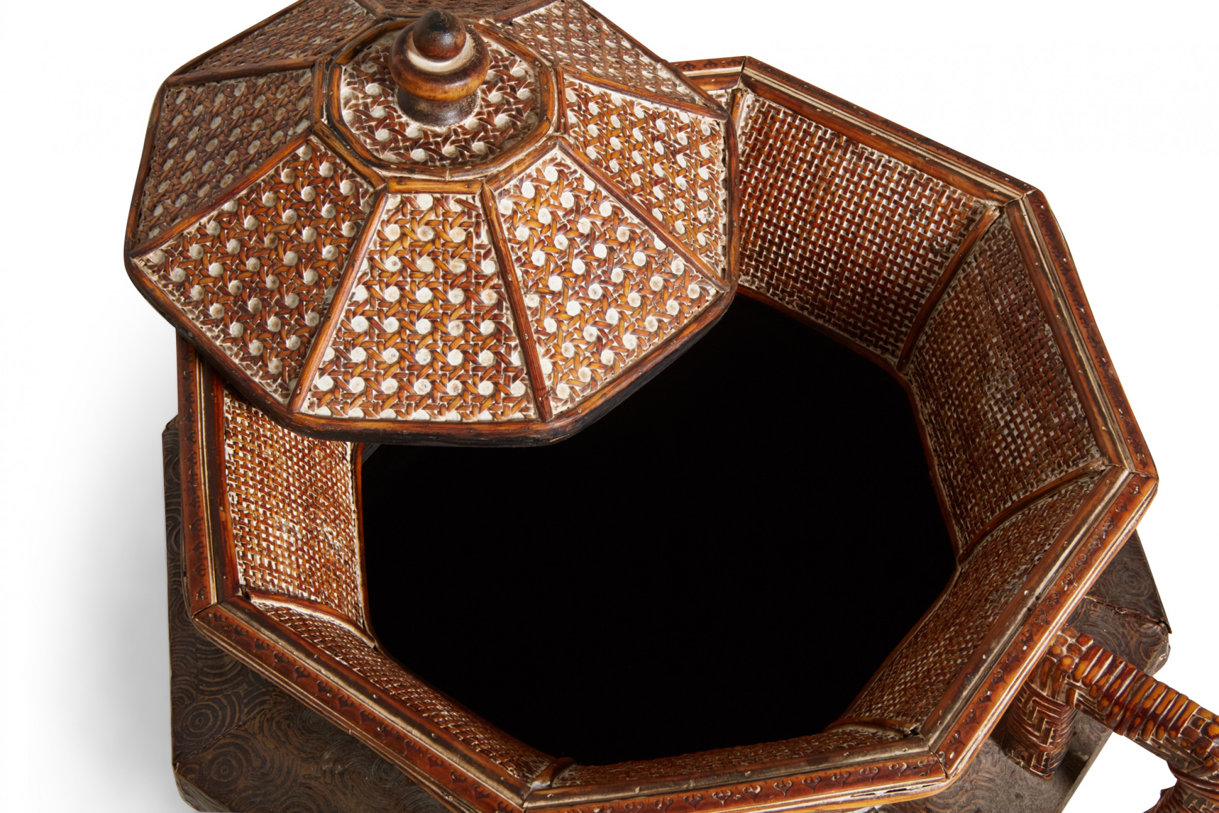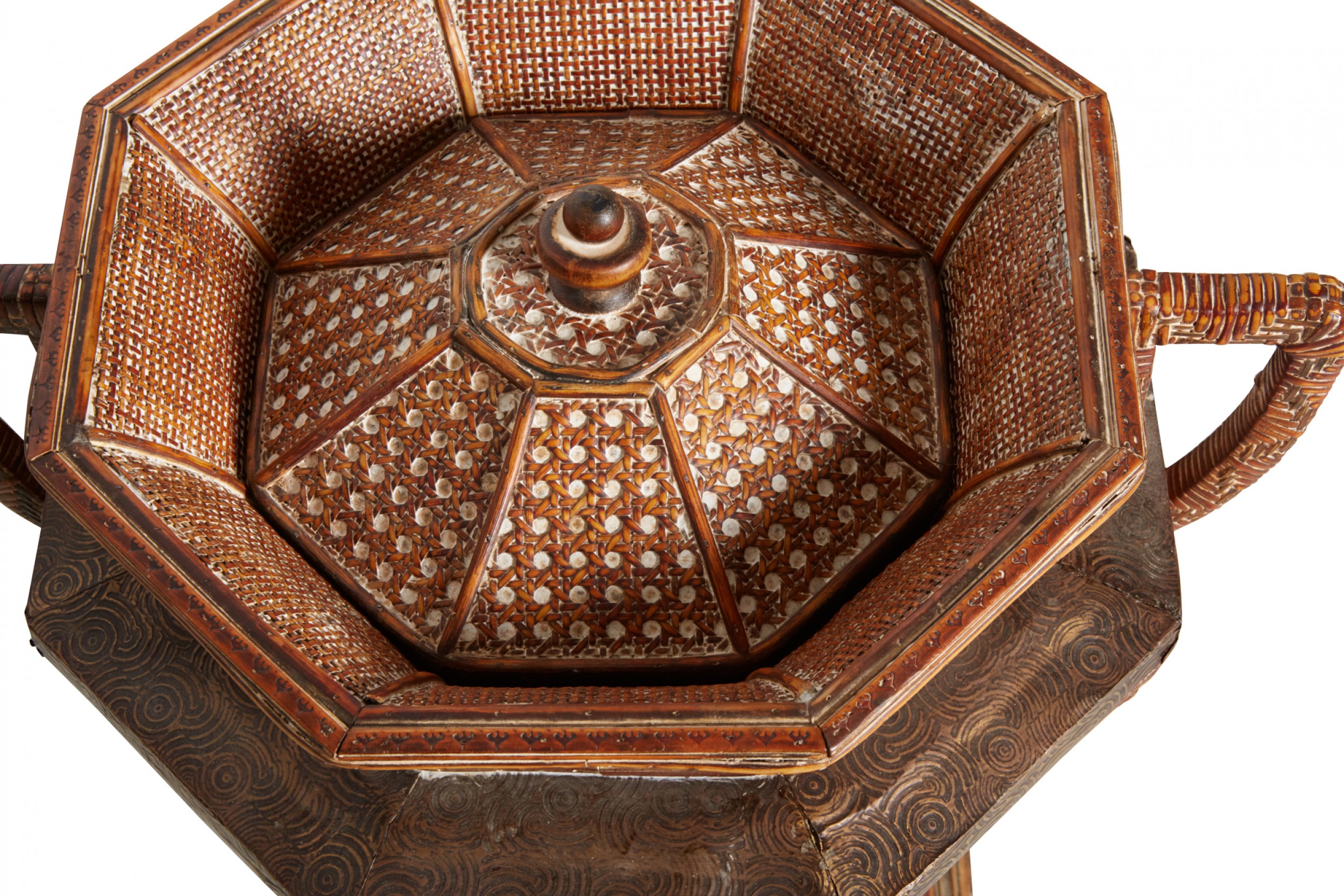Vintage woven wicker octagonal basket with fluted opening with inset circular lid above a wooden framed wicker body with two woven handles and embossed brass banding bearing a geometric pattern, resting on an octagonal wicker and wood foot..