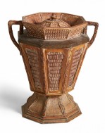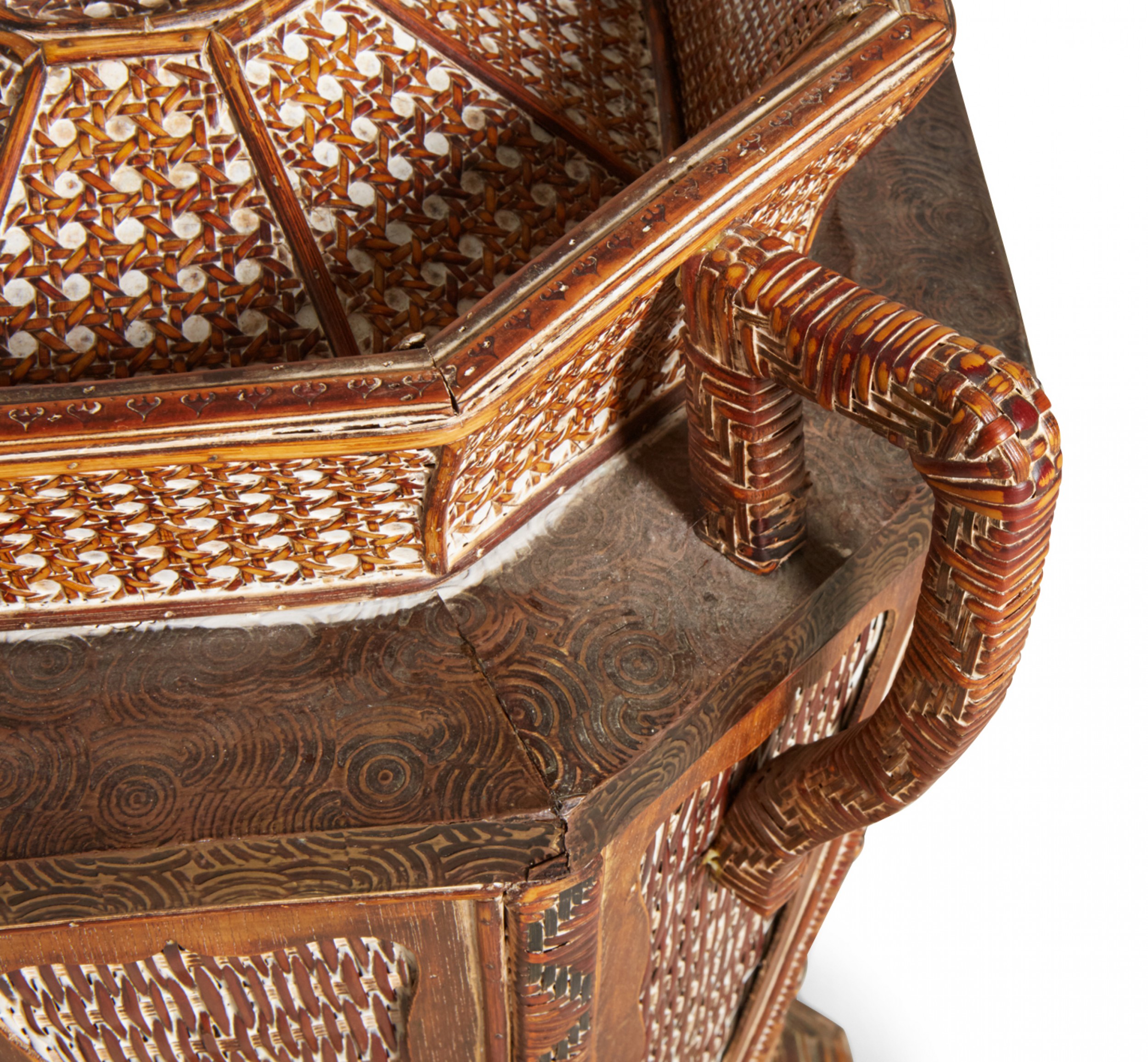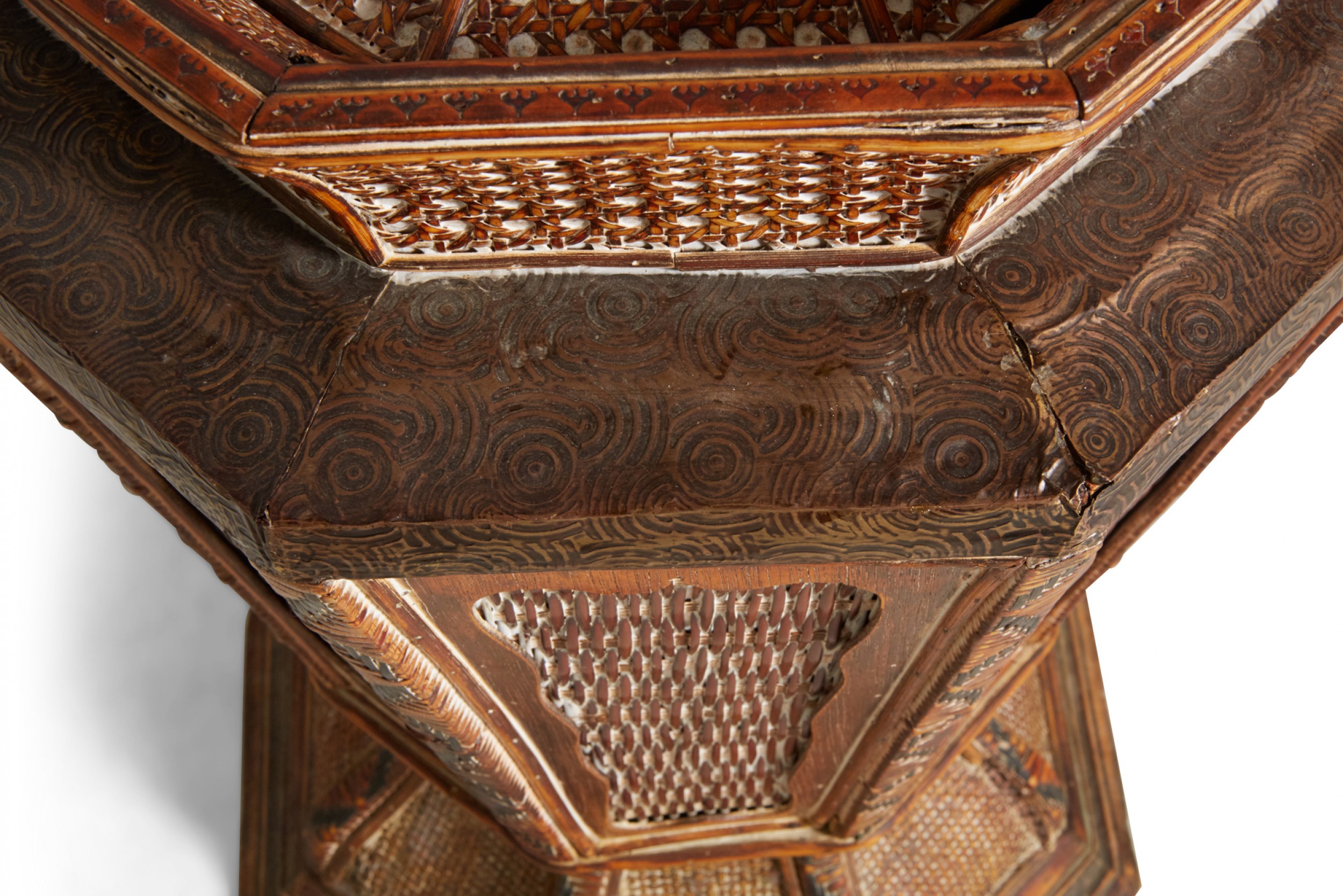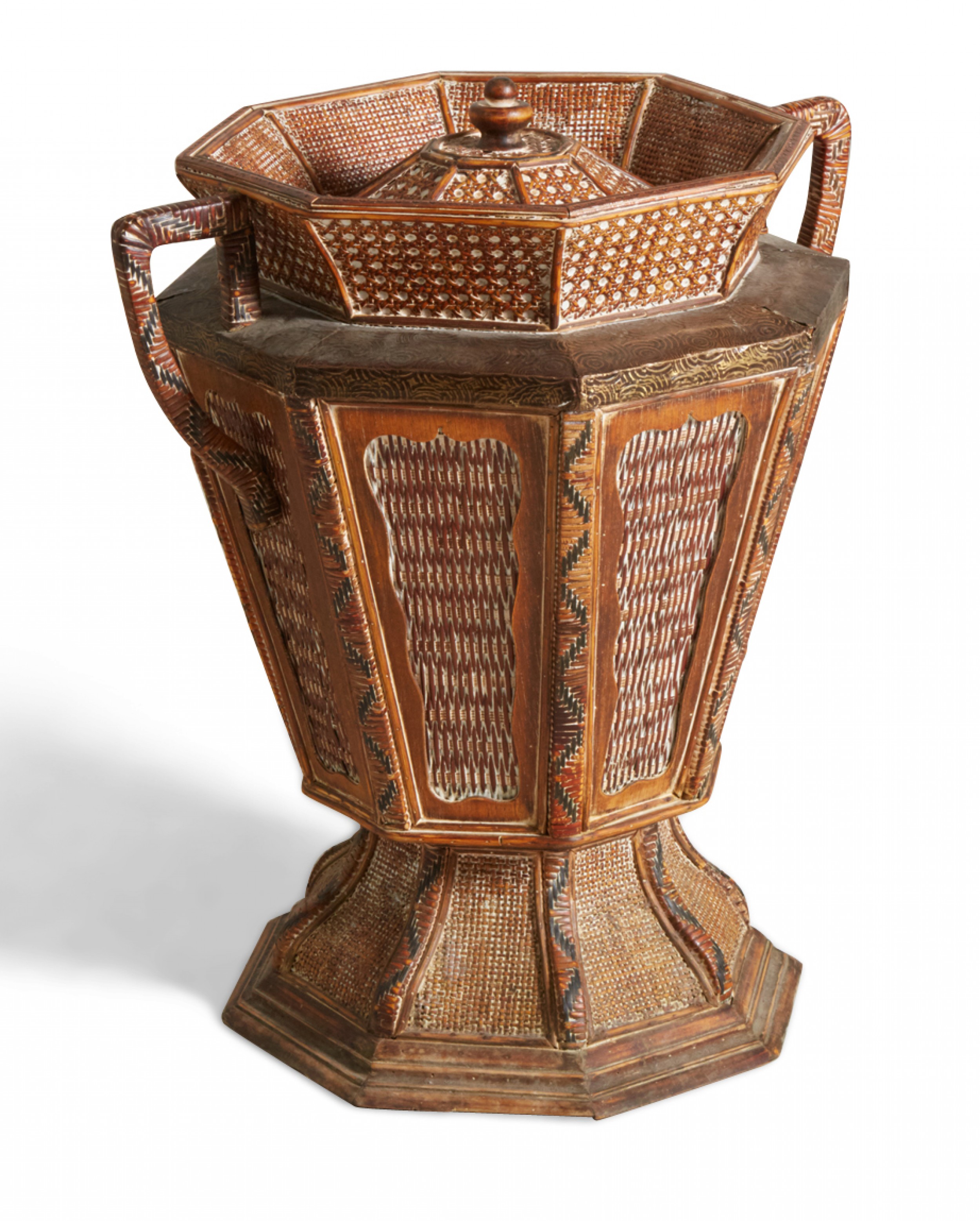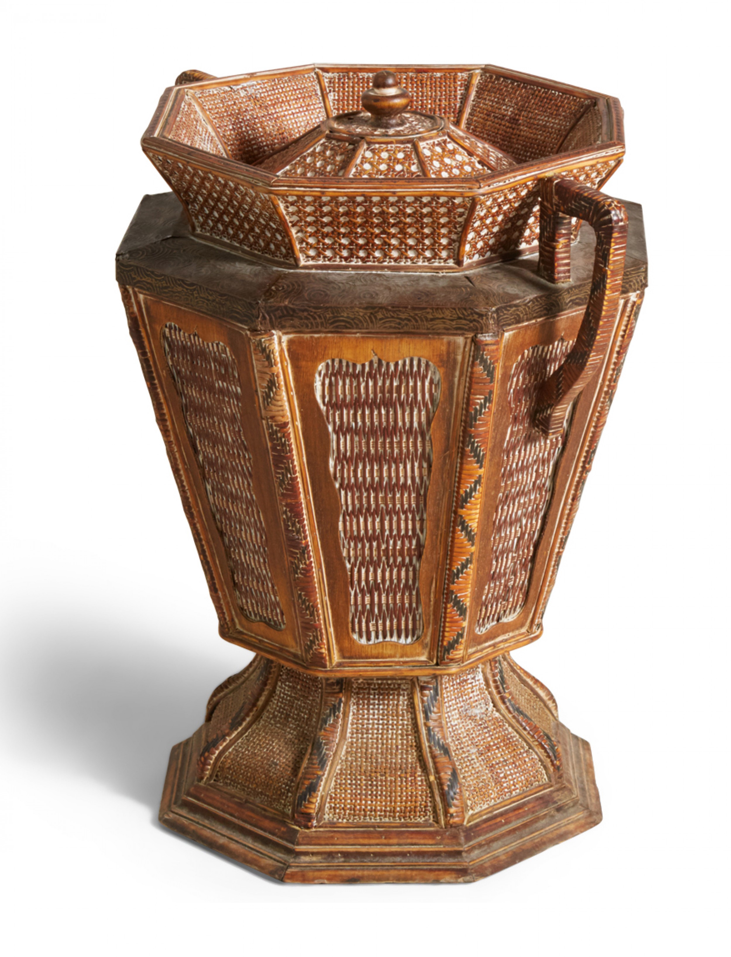 Vintage woven wicker octagonal basket with fluted opening with inset circular lid above a wooden framed wicker body with two woven handles and embossed brass banding bearing a geometric pattern, resting on an octagonal wicker and wood foot..