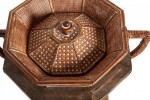 Vintage woven wicker octagonal basket with fluted opening with inset circular lid above a wooden framed wicker body with two woven handles and embossed brass banding bearing a geometric pattern, resting on an octagonal wicker and wood foot.