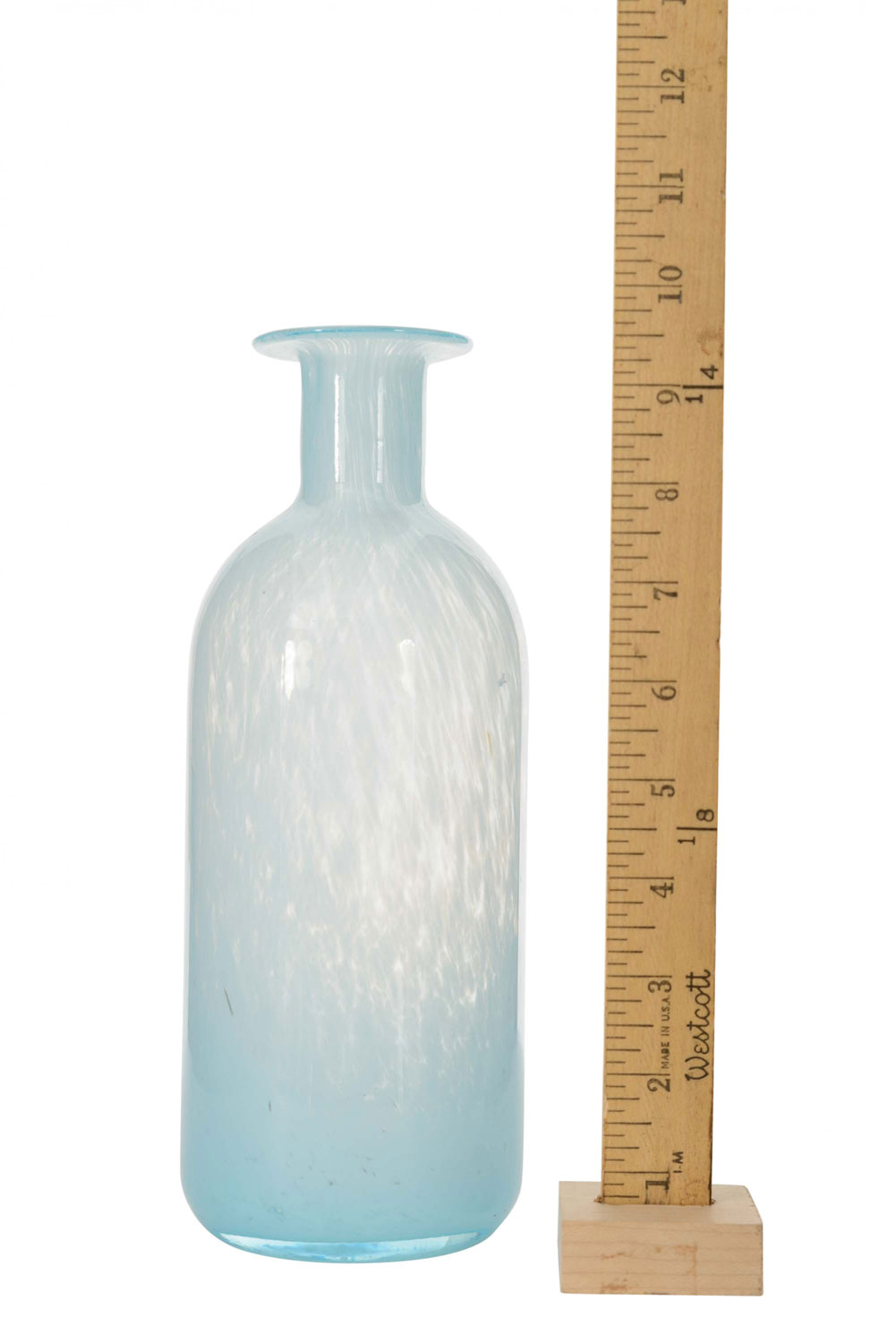 2 Vintage bottle-shaped light blue spattered art glass vase with a flared flat rim (PRICED EACH).