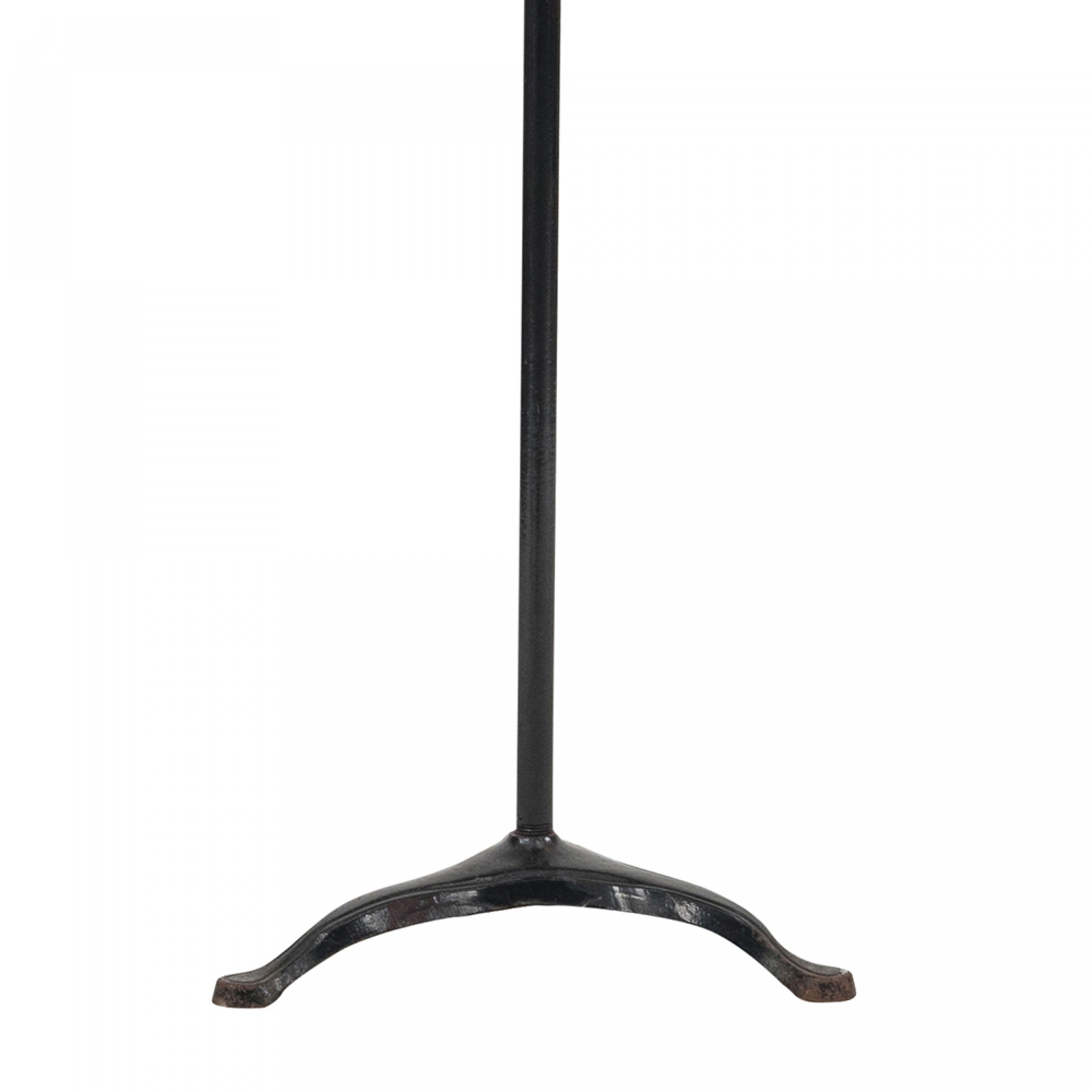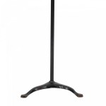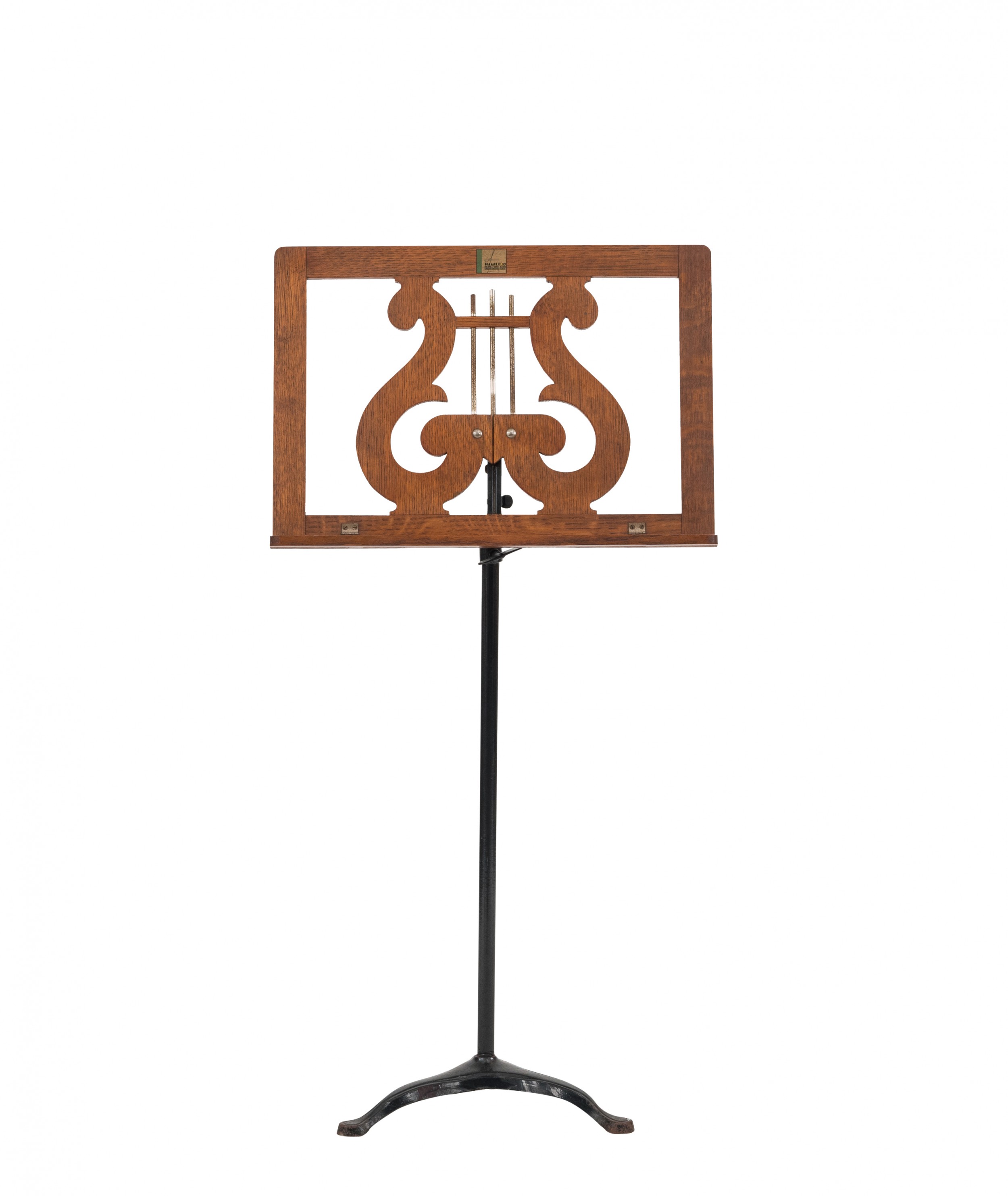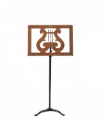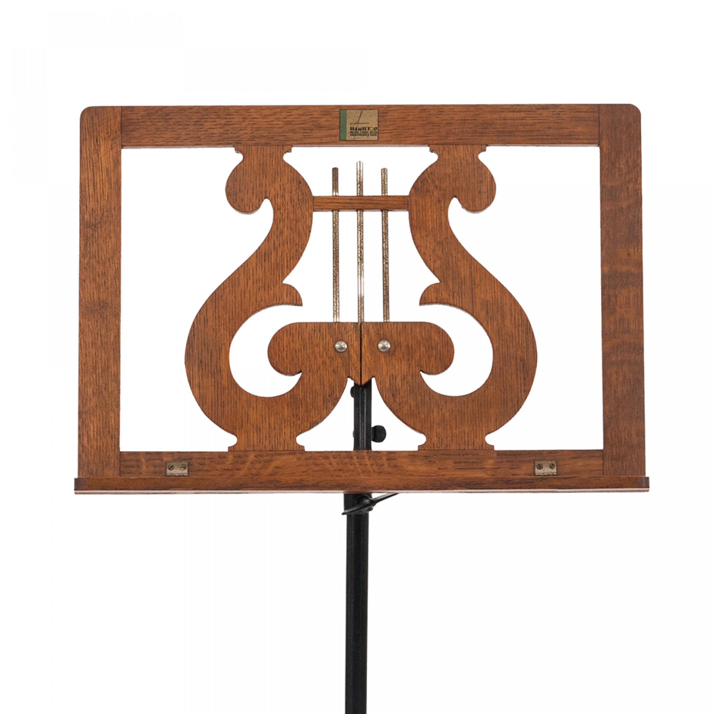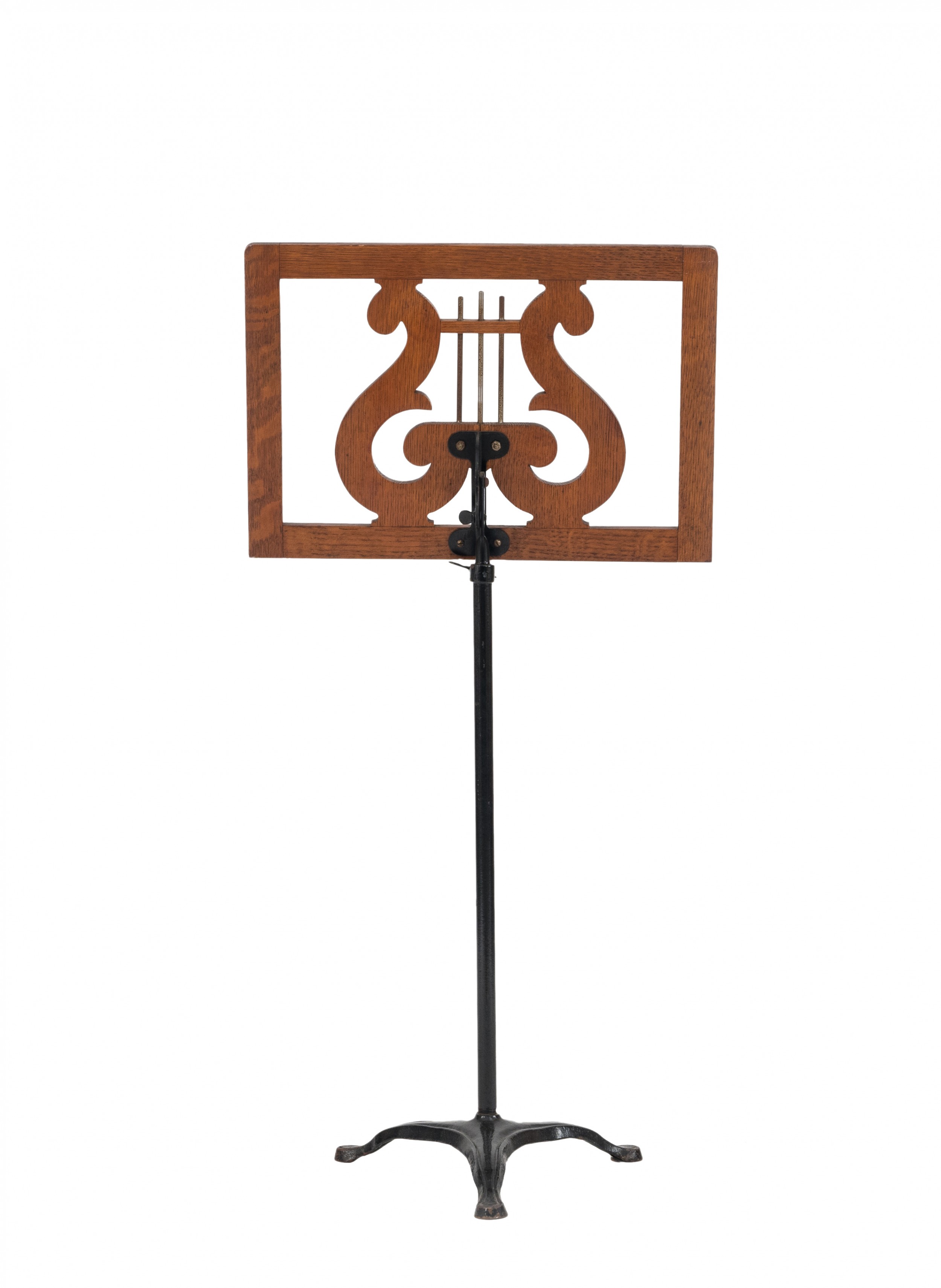 Vintage Mid-Century wooden music stand with scroll harp design and black metal pedestal base.