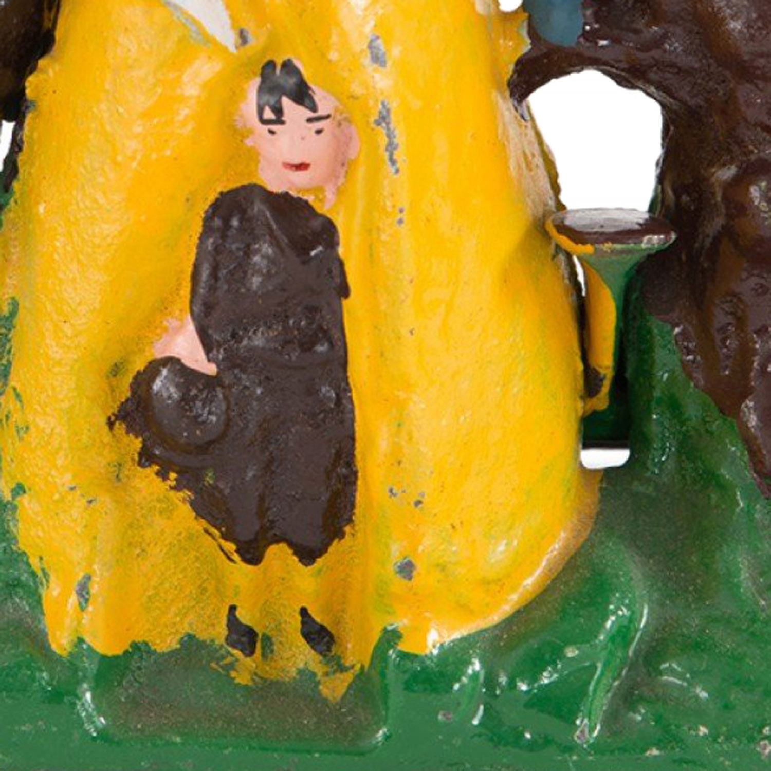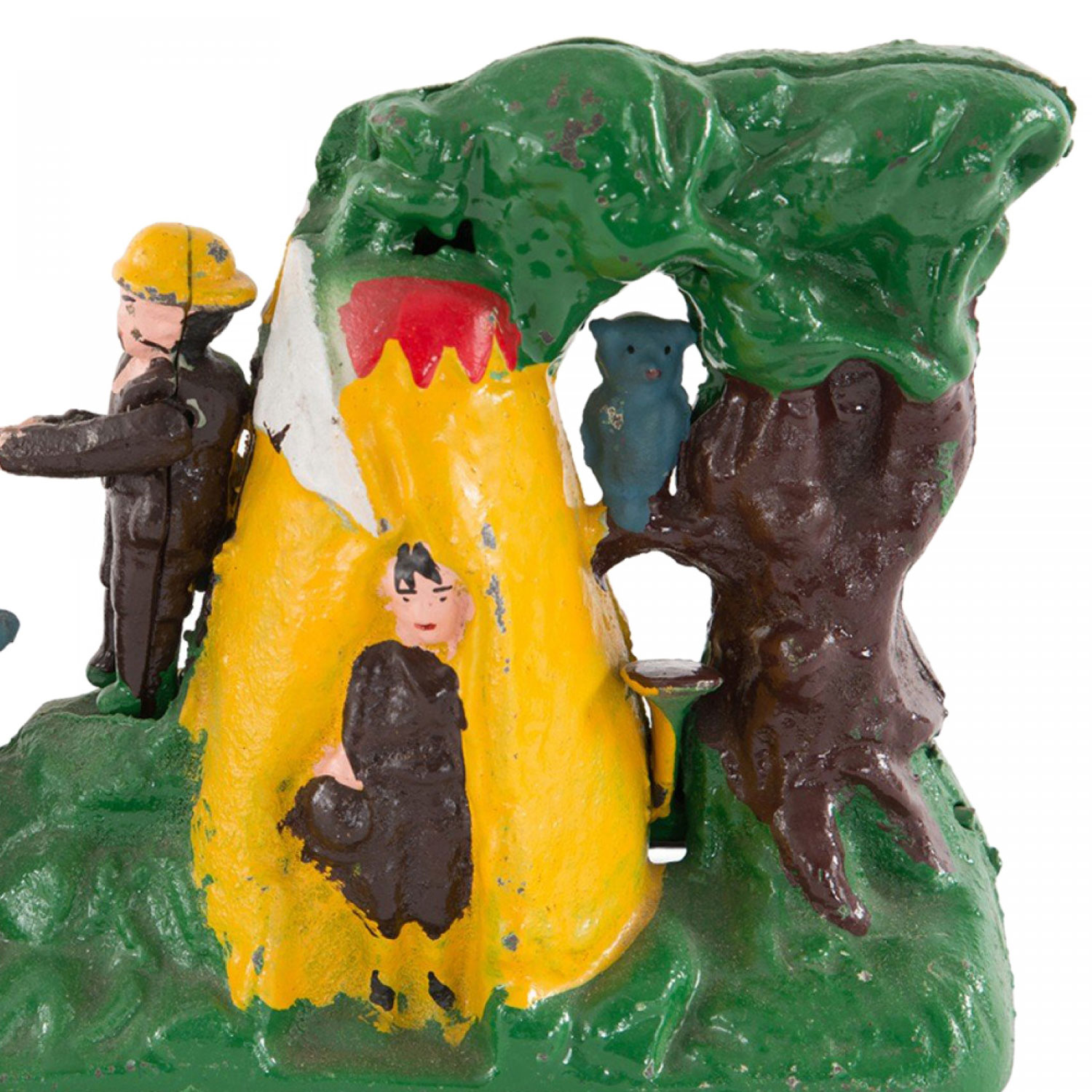 Vintage painted cast iron figural mechanical coin bank with a boy scout camp theme