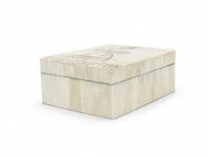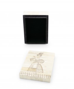 Vintage rectangular patterned faux ivory box with lift-off cover engraved with a drawing of a woman
